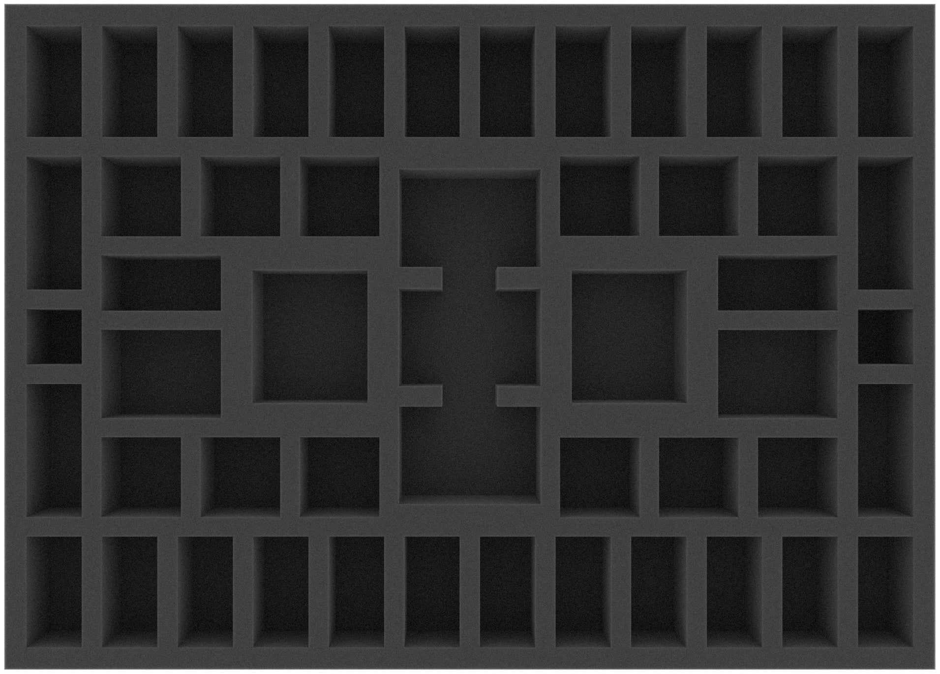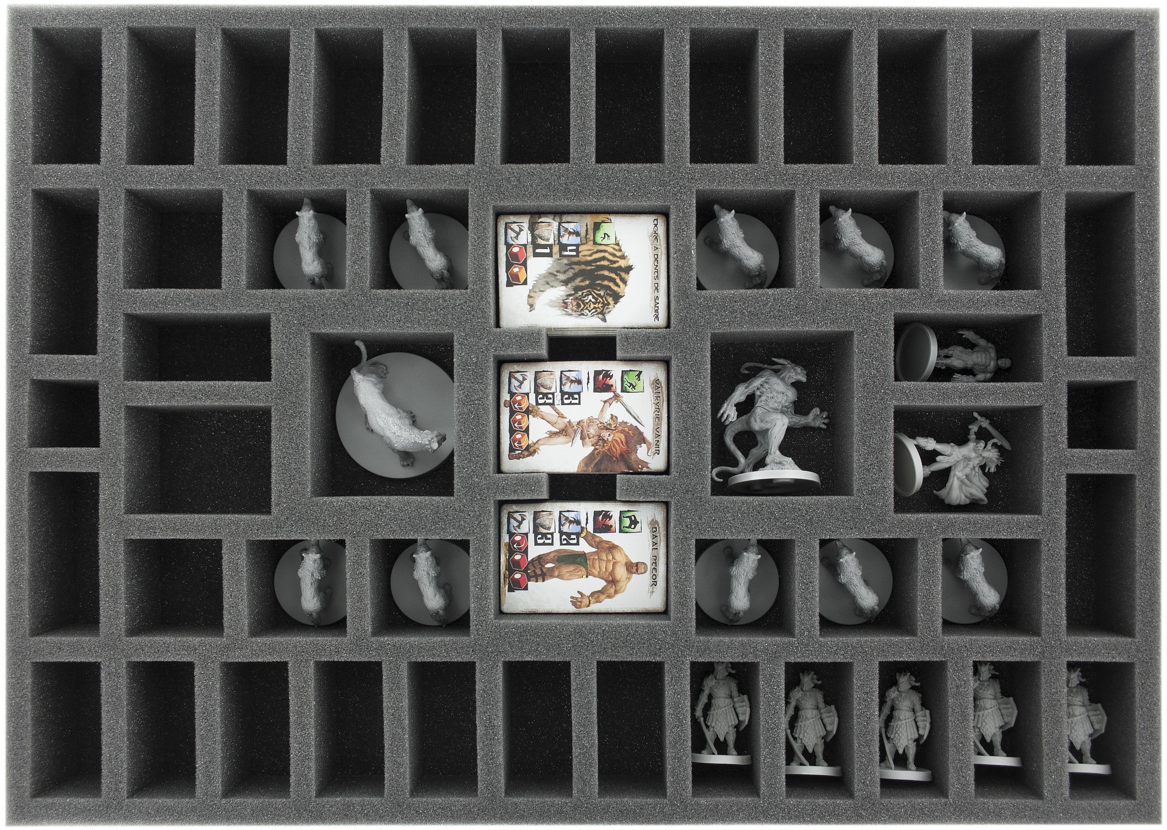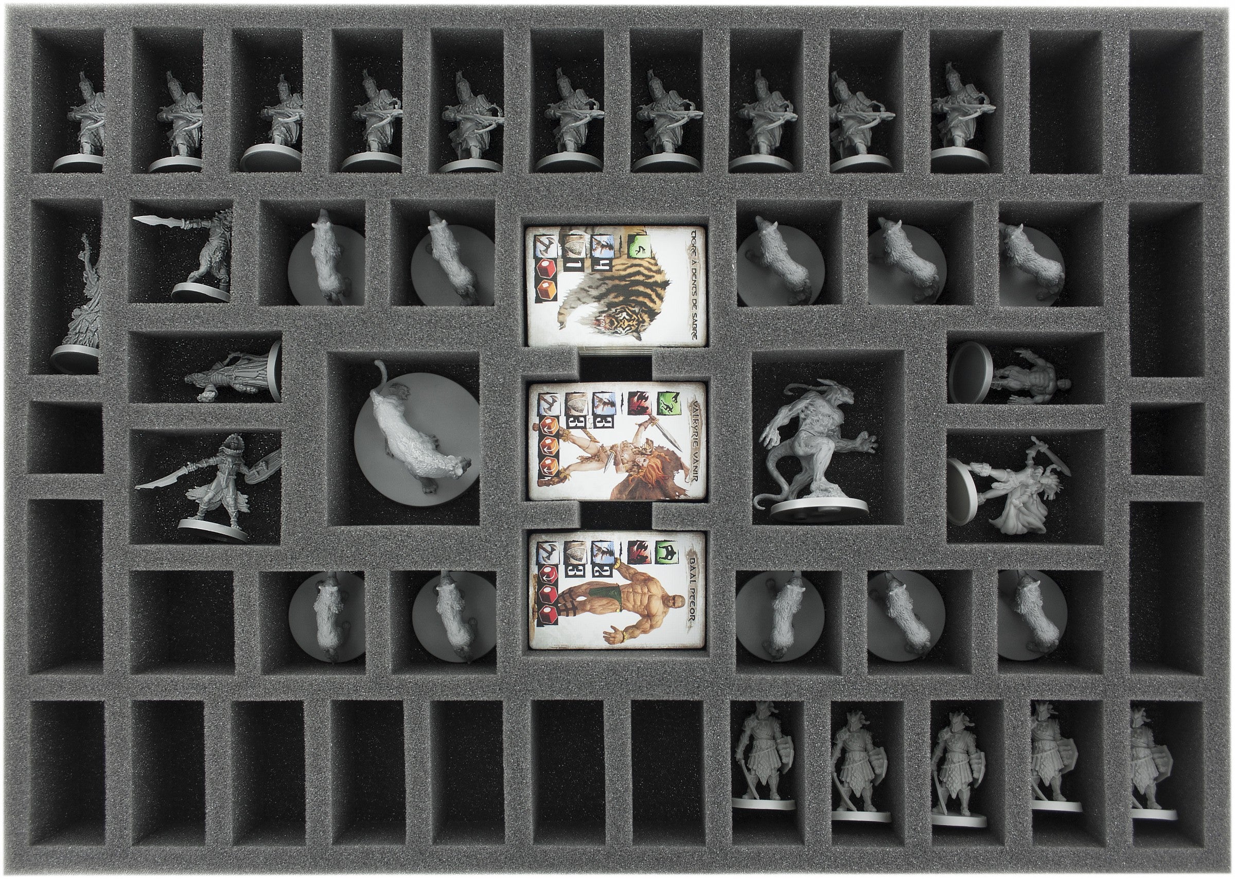 Especially foam tray for the Conan Kickstarter EXCLUSIVE ADD-ONS. The foam tray with 49 cutouts can hold the Kickstarter exclusives: Giant Wolves, Vanir Valkyrie!, Sabretooth-tiger, Baal Pteor, Black Dragons and an Demon of the Earth. In addition there is space for 29 more miniatures. The foam tray fits excellently into the original Conan board game box and in the Conan stretch goals box.