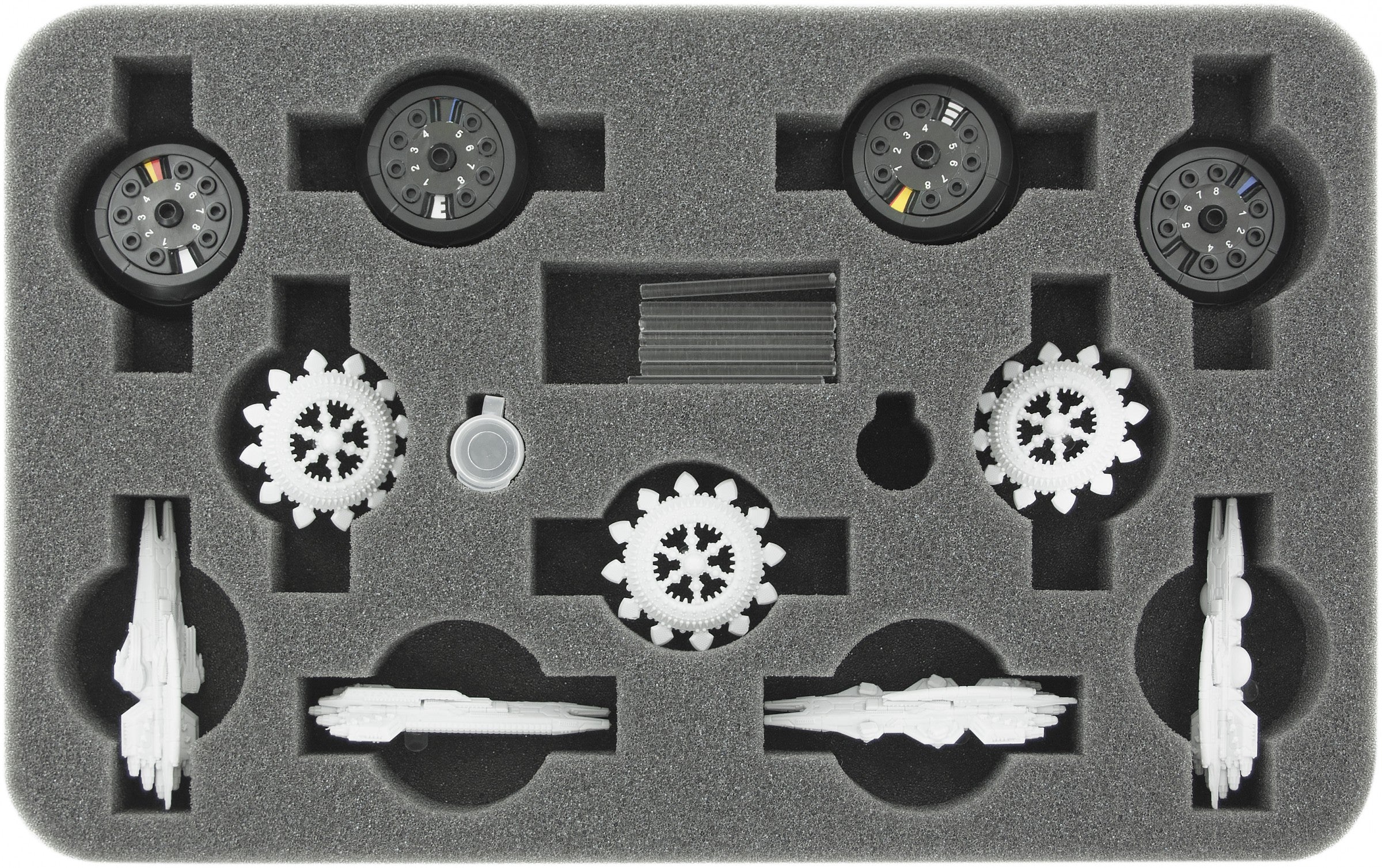 Feldherr MINI PLUS case for Feldherr MINI PLUS Case for Dropfleet Commander: Shaltari. The bag fits 8 Cruisers and up to 22 Voidgates. In addition, small plastic capsules are included for the damage pegs.