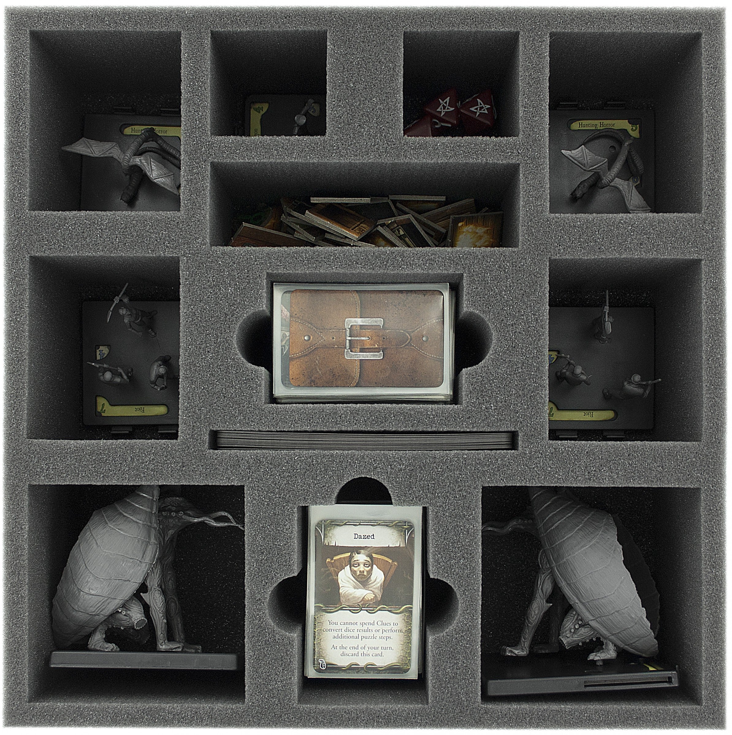 On the first foam tray, 12 compartments ensure that the larger figures are safely accommodated. There are 2 for the Star Spawn, 4 for the Hunting Horror and the Riot, and two compartments for smaller miniatures. The separate storage of the miniatures in compartments made of soft foam ensures optimal protection of the sensitive parts. The Star Spawn will keep its wings and the Cultist his scepter.
