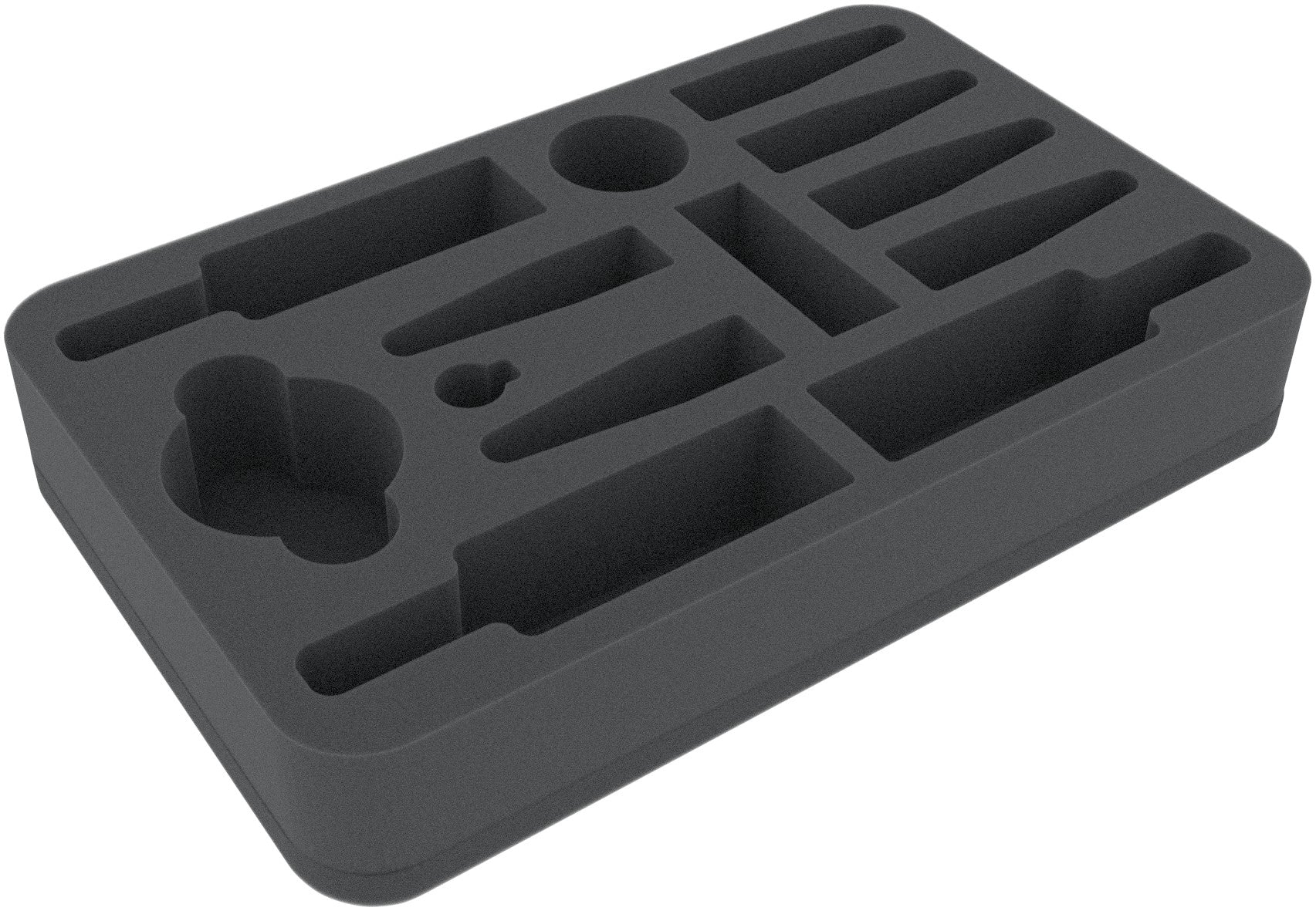 The Feldherr half-size (HS) foam tray has the dimensions: 275 mm x 172 mm x 45 mm height. The 45 mm depth of the foam is result from 10 mm foam base and slot foam tray with 35 mm effective depth.