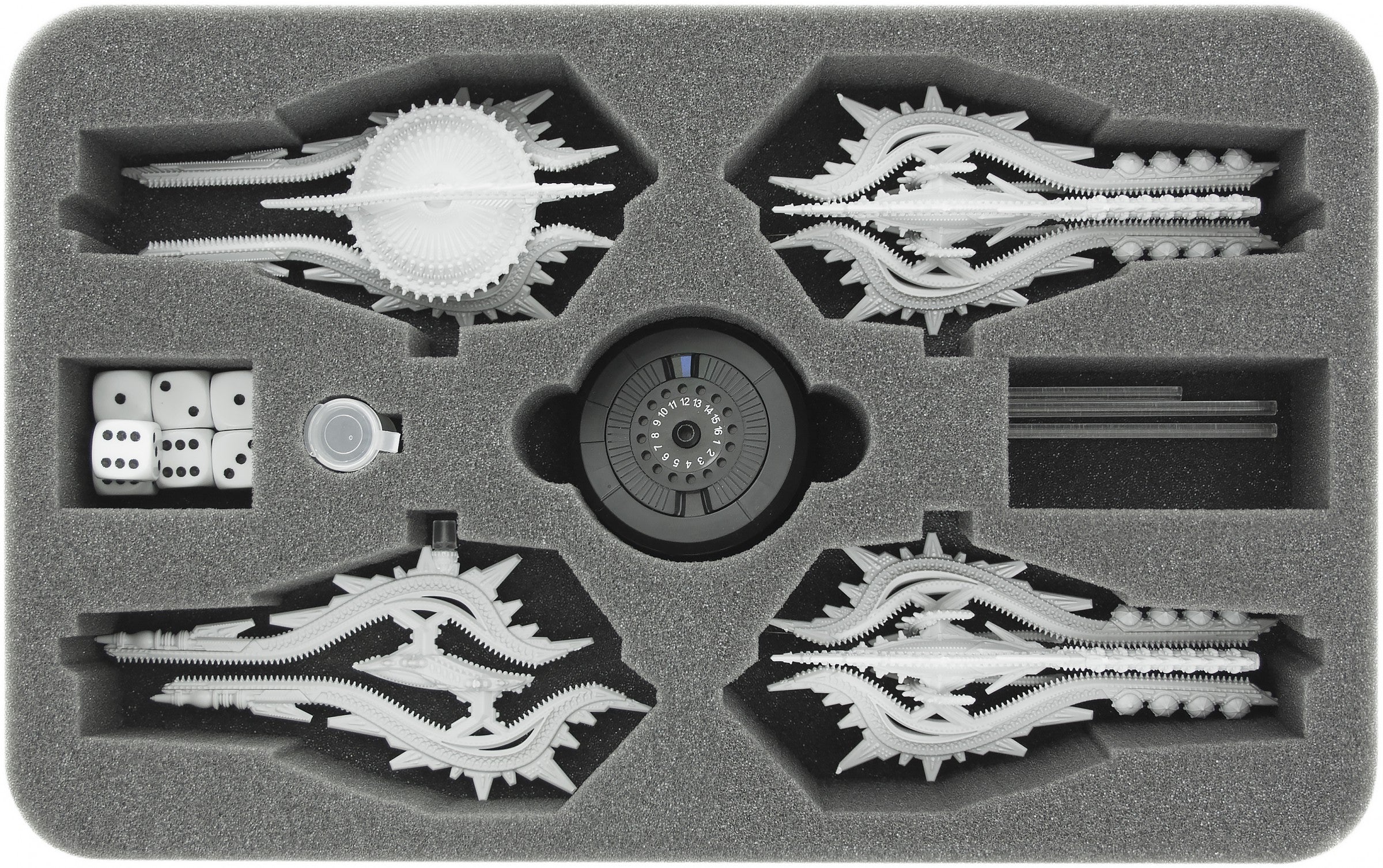 The foam tray provides space for 4 Cruisers of the Shaltari. On the tray there are 4 additional compartments for playing material. In addition a FREE capsule for the damage pegs included!
