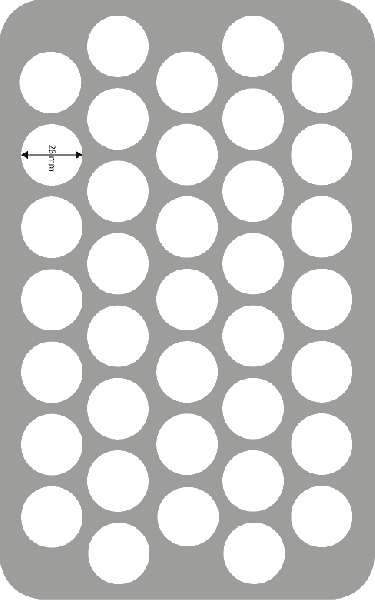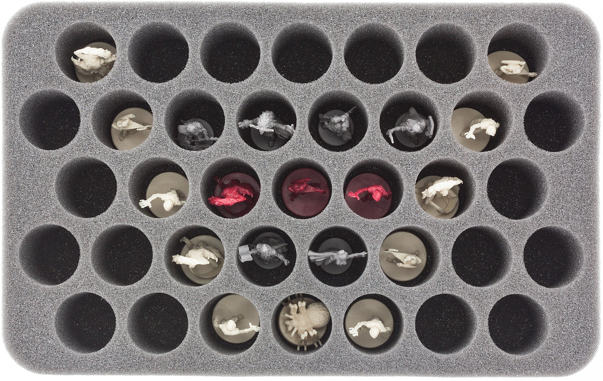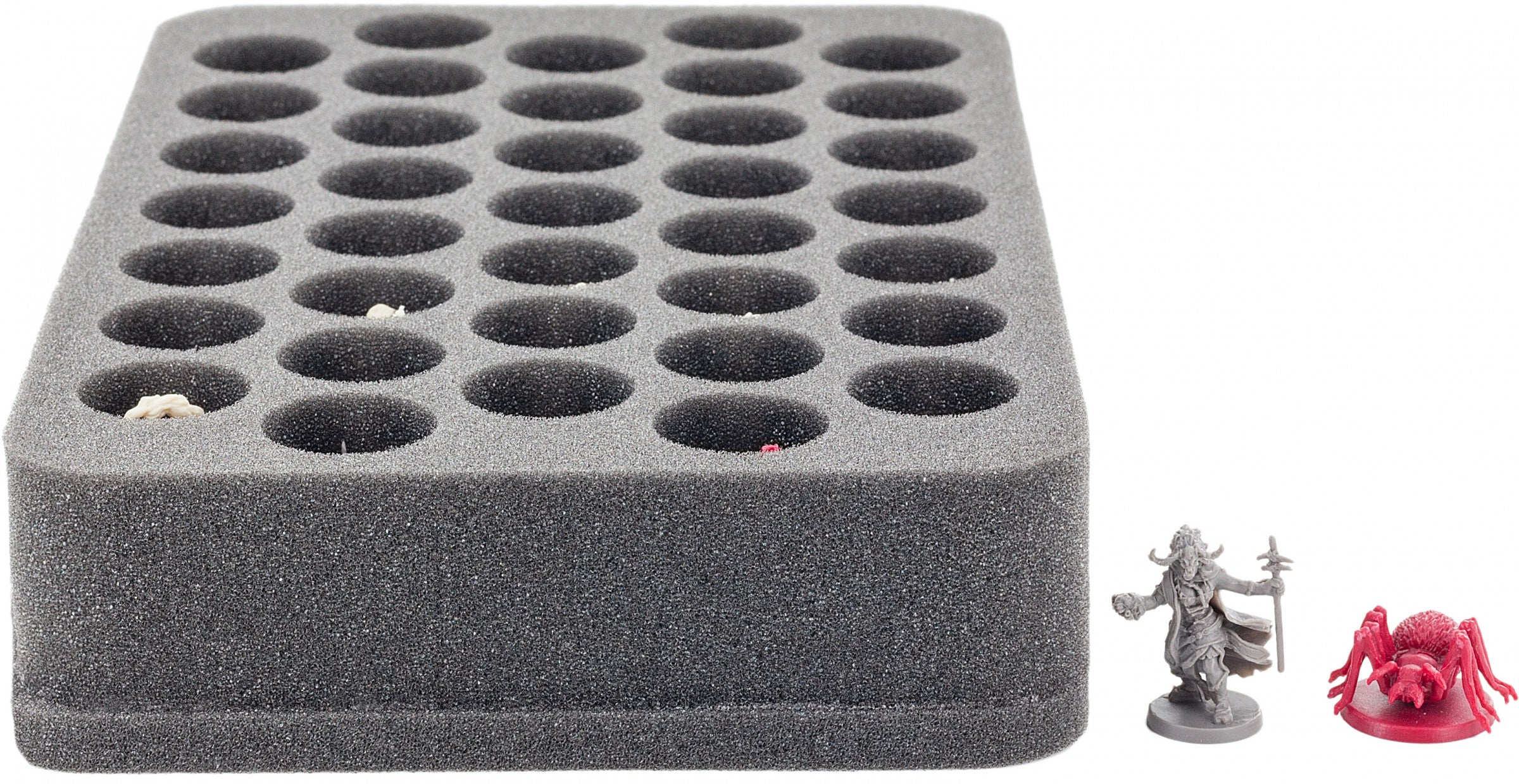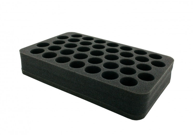 Les petites figures de héros et de monstres trouveront un havre de paix dans 37 compartiments en forme de base. Celles-ci ont un diamètre de 28 mm et une profondeur effective de 40 mm. Idéal pour placer vos silhouettes en position verticale. Grâce à son socle de 10 mm d'épaisseur, l'inlay atteint une hauteur totale de 50 mm.