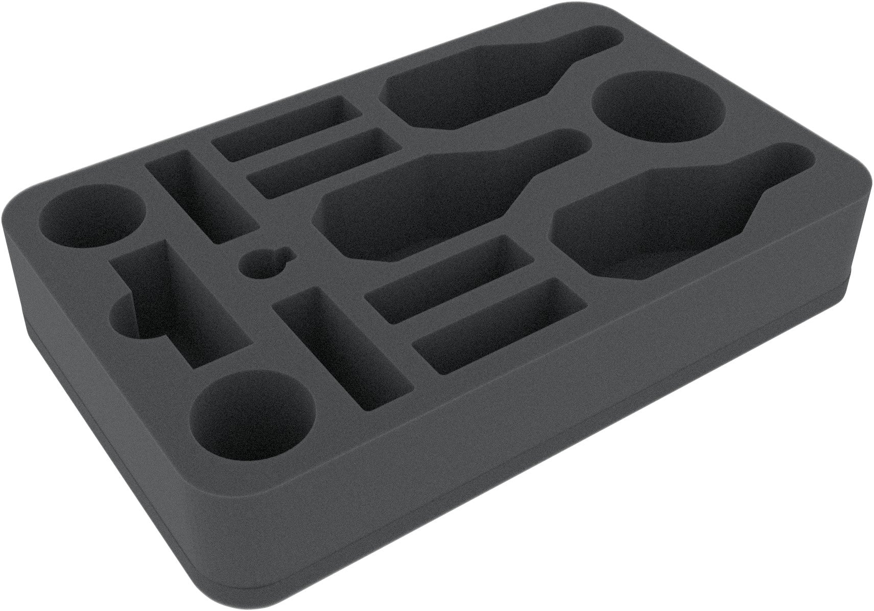 The Feldherr half-size (HS) foam tray has the dimensions: 275 mm x 172 mm x 50 mm height. The 50 mm depth of the foam is result from 10 mm foam base and slot foam tray with 40 mm effective depth.