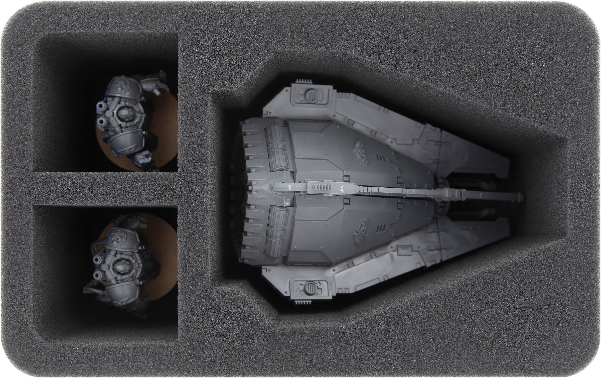 Two additional compartments can be filled with miniatures of your choice. They are particularly suitable for models the size of Centurions or Inceptors.