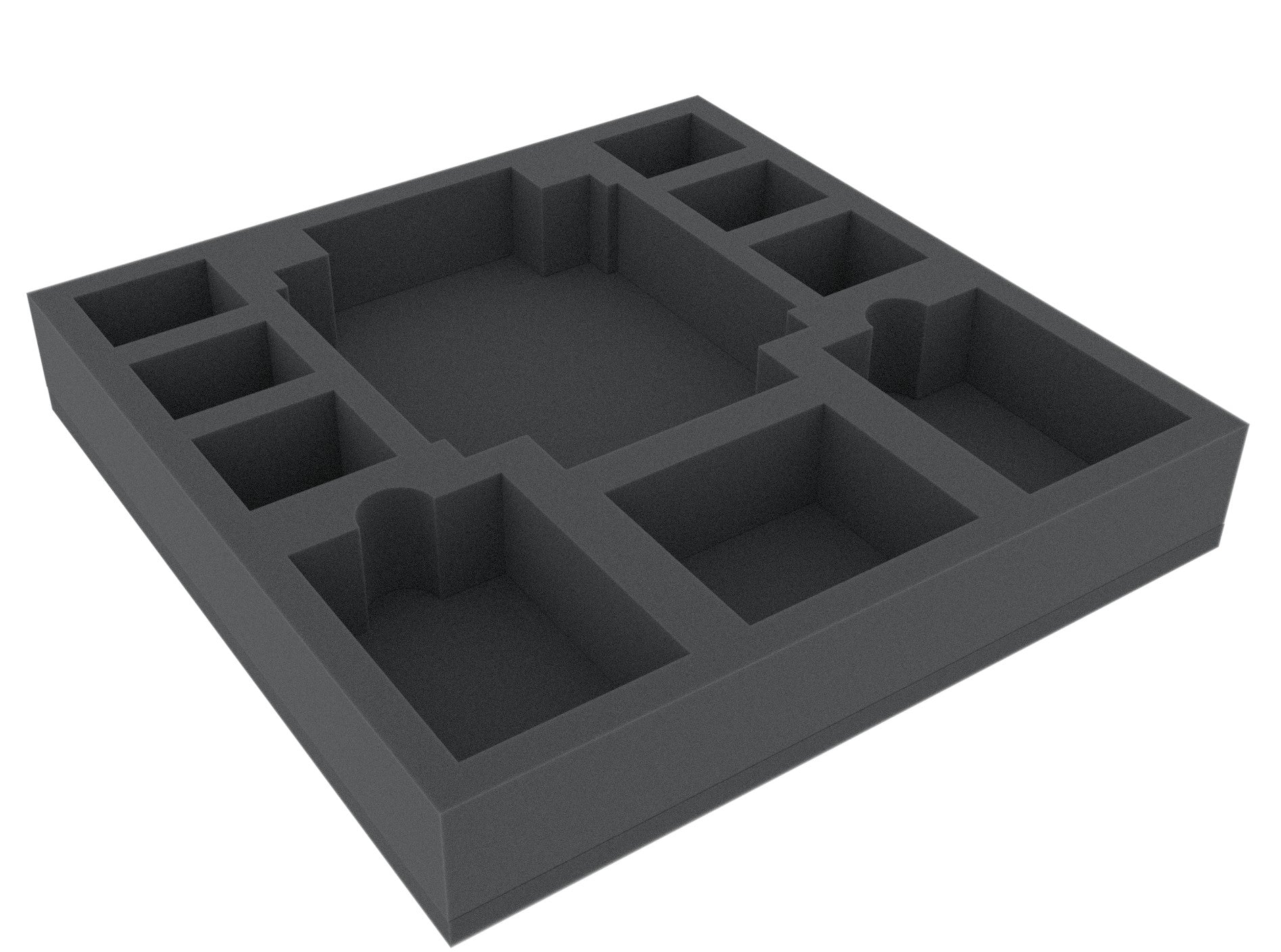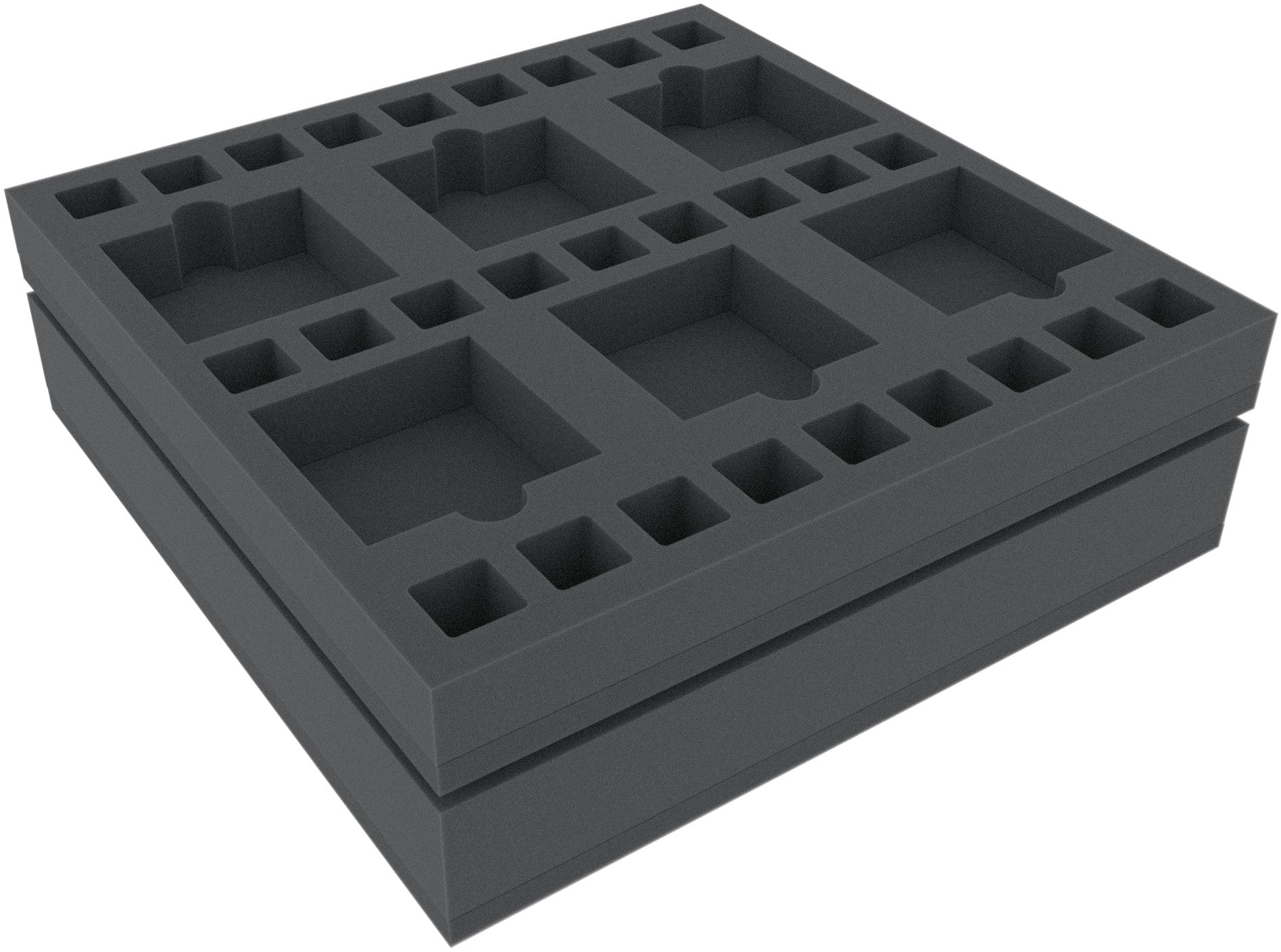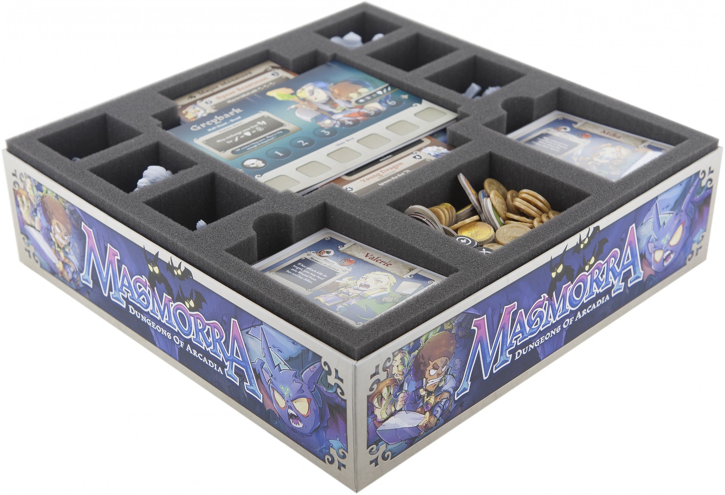 Complete set with 43 compartments for all figures, cards in sleeves, tokens and map tiles from the original Masmorra: Dungeons of Arcadia - Core Box. The set fits: the monster dice, cards in sleeves, small and medium dungeon tiles, the heroes and all tokens. The foam trays fits perfectly into the original board game box, or into the Feldherr box LBBG. In addition, the set also offers a free compartment for a hero, e.g. Luke the Lucky and 15 free compartments for monster dice.
