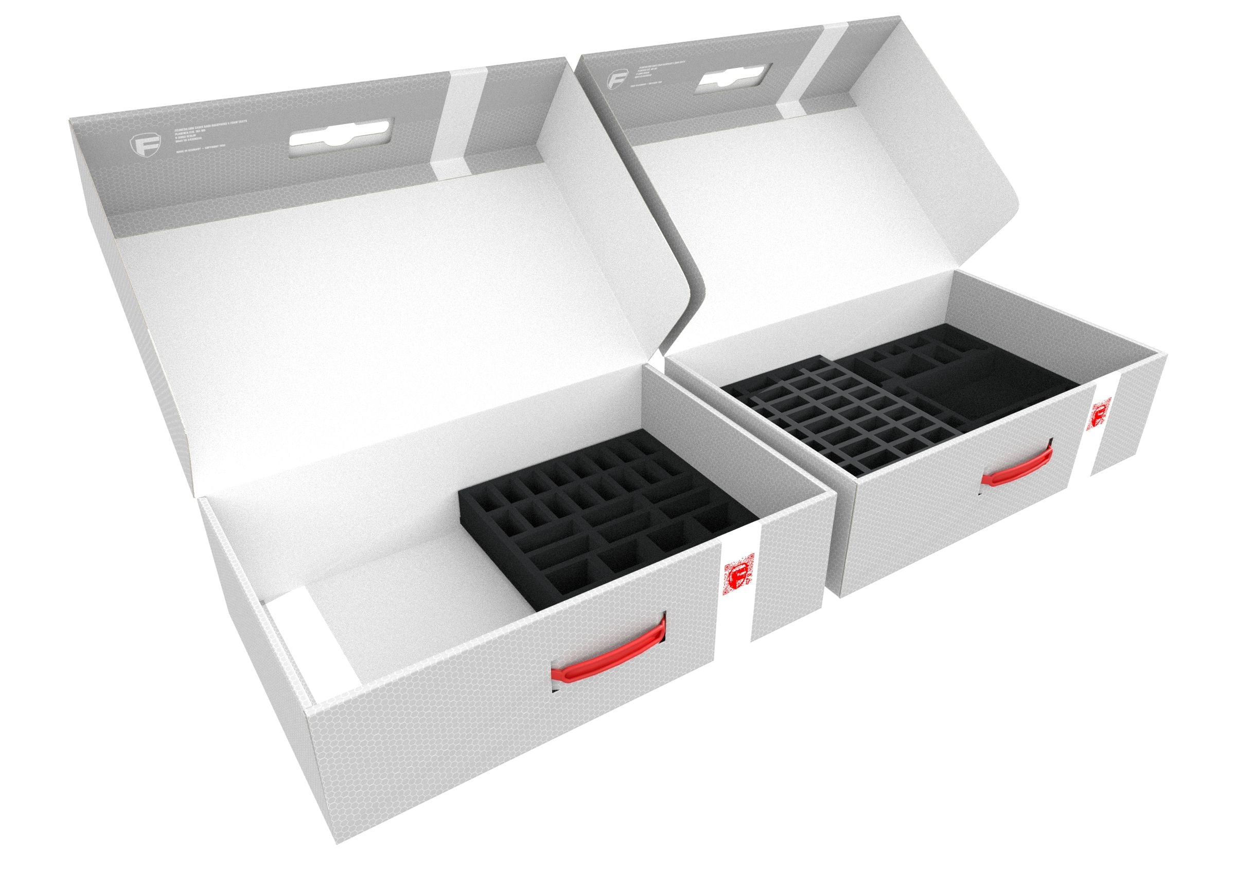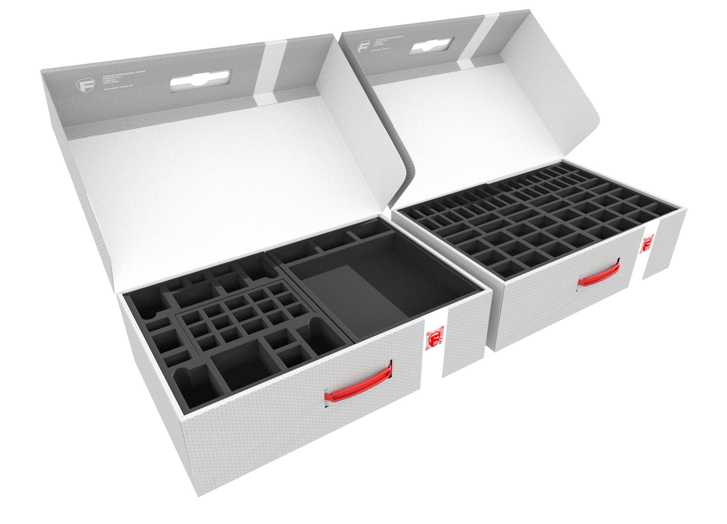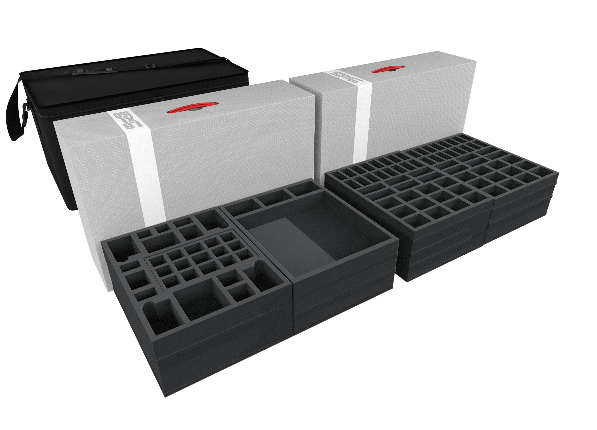 Transporter for all Kickstarter Knights-level Pledge Backer! In the full size foam trays fit all miniatures, cards in sleeves and tokens from the Knight-level Pledge. Overall there can up to 380 miniatures be stored and transported well protected. The two high quality storage boxes are full to the brim with Feldherr full size foam for Zombicide. In the foam trays from the storage boxes fit the figures from Zombicide Black Plague, Wulfsburg, NPC-1, Zombie Bosses, Hero Box 1, Knight Pack, Huntsman Pack and Special Guests: Paul Bonner, Naiade, Marc Simonetti. In addition, there is space for other expansions like Murder of Crowz.