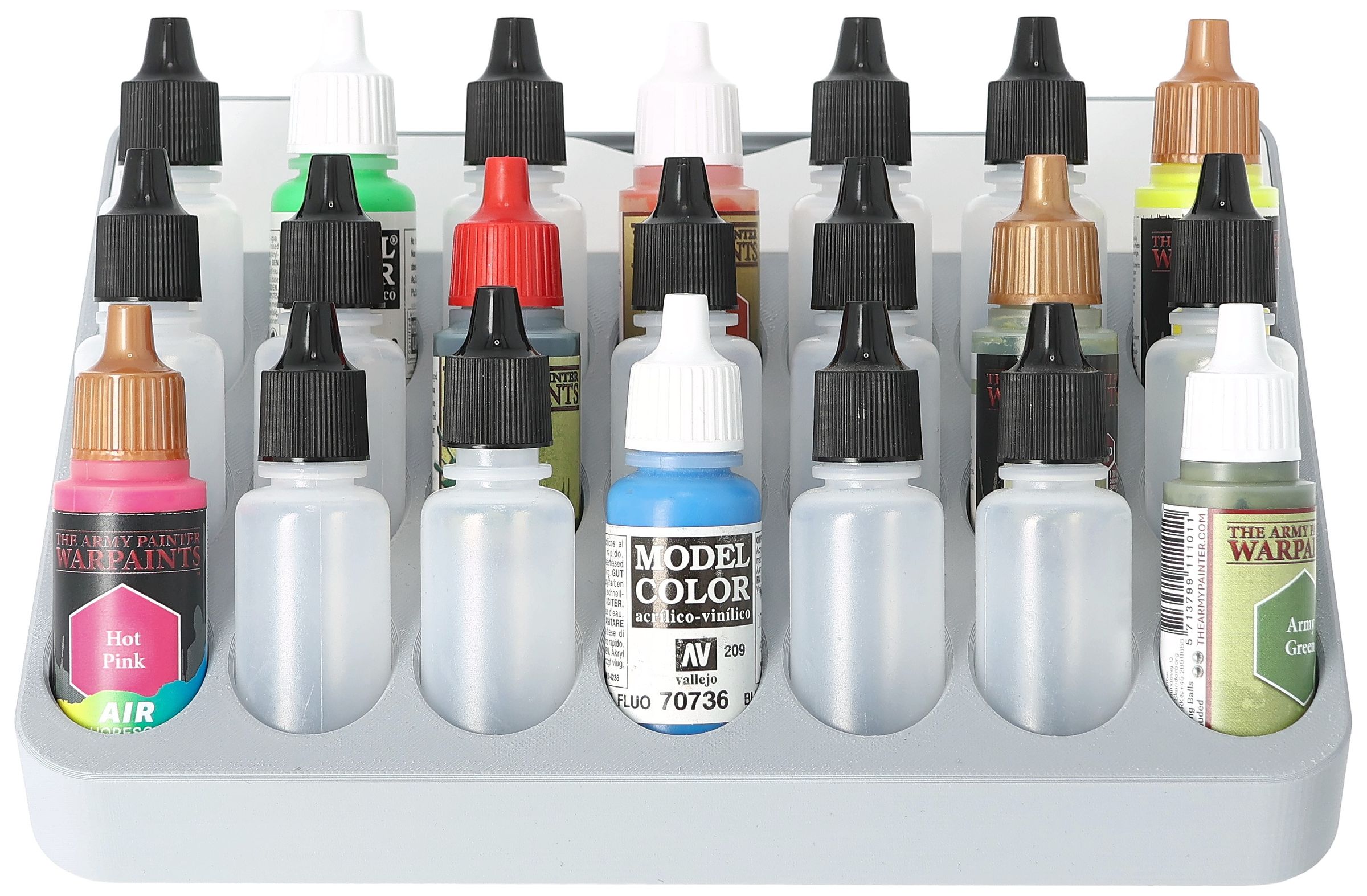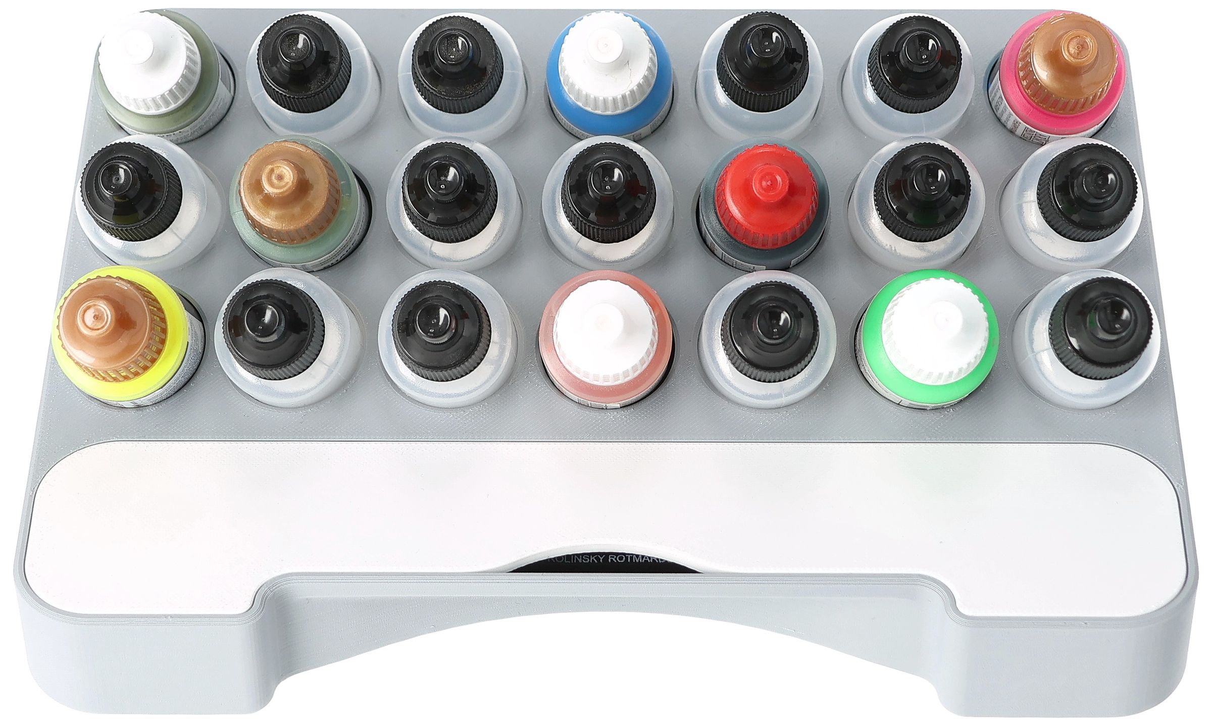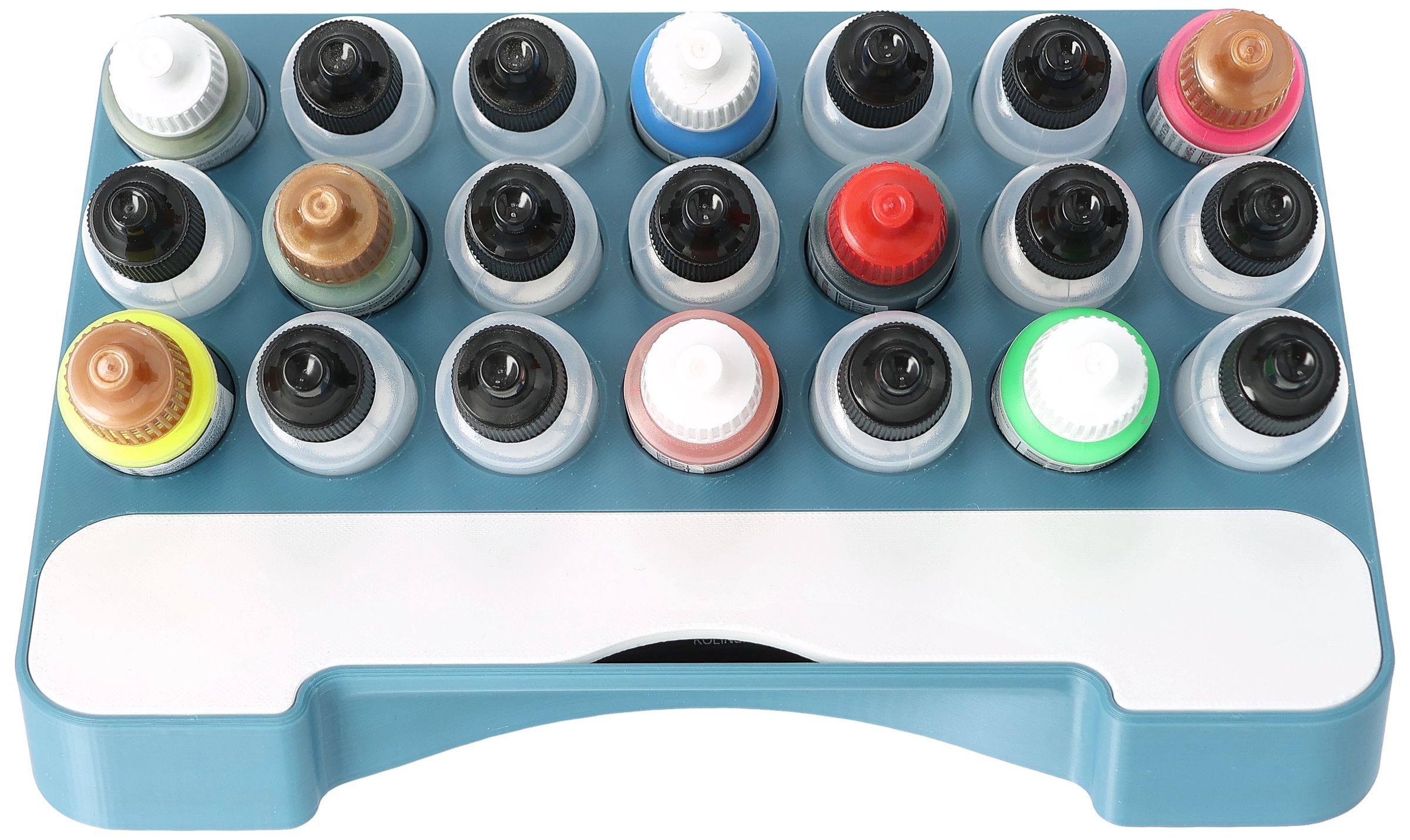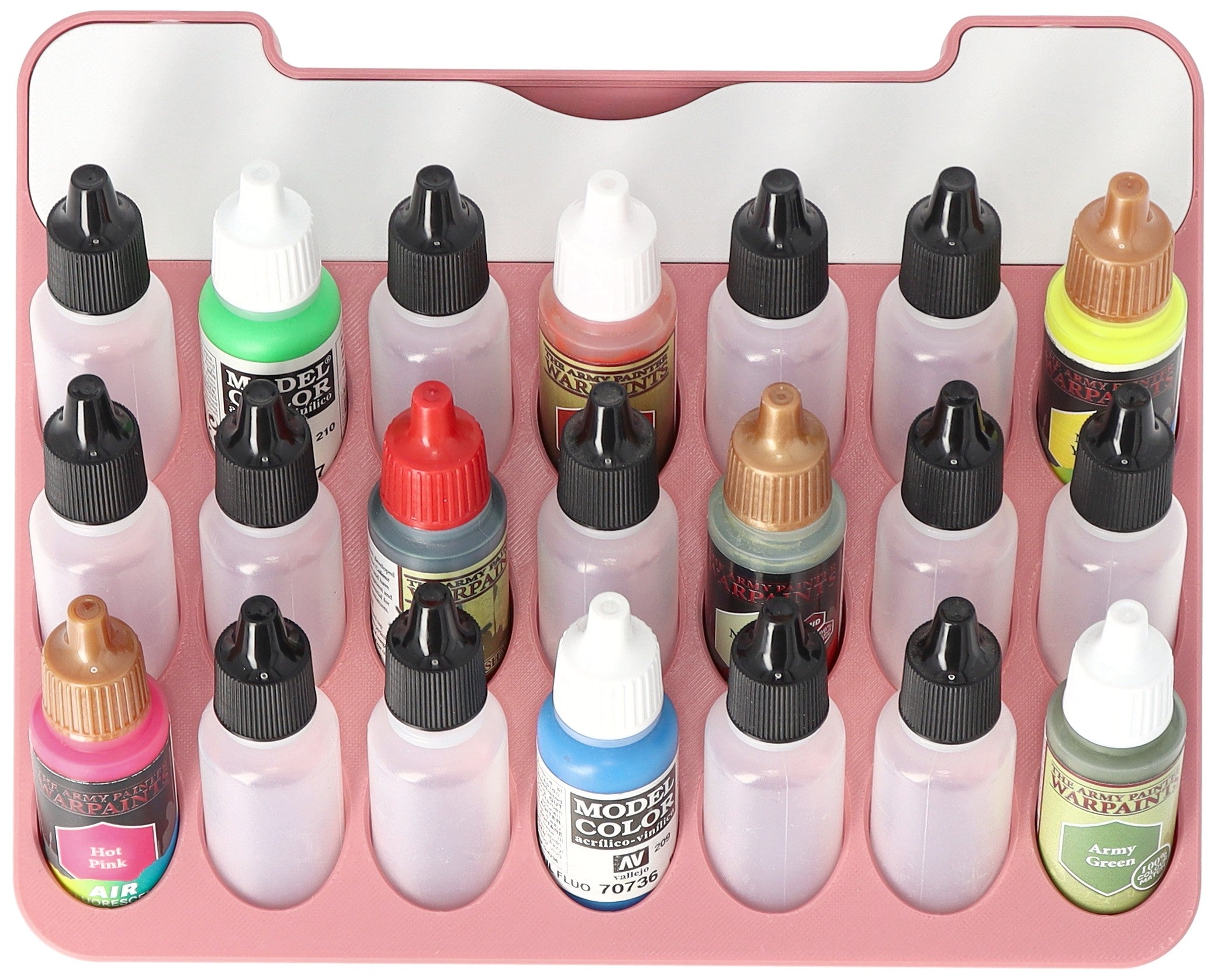 • Paint rack with 21 round compartments for paint bottles with a diameter of 25 mm - compatible with dropper bottles from Vallejo (17 ml), Army Painter (18 ml) and other common formats