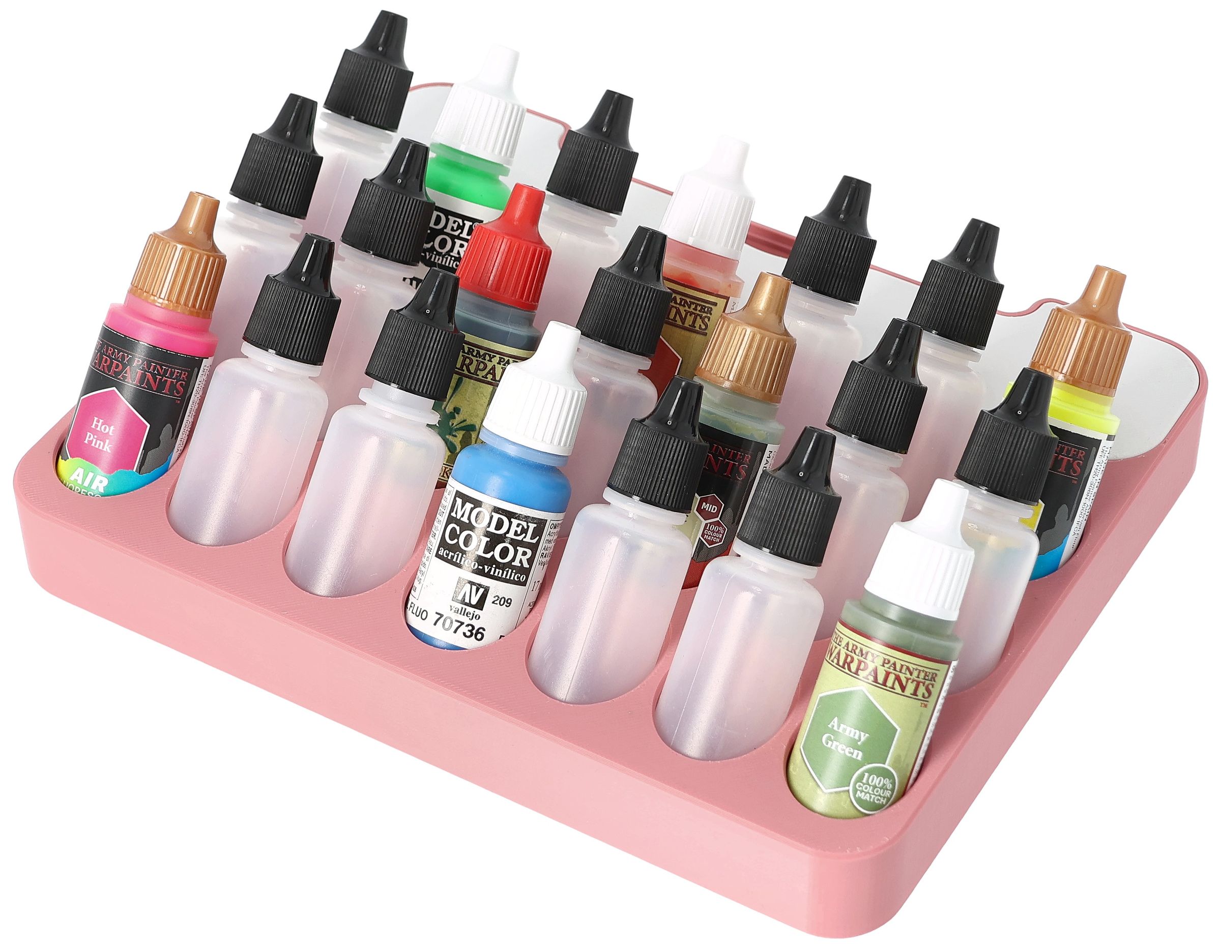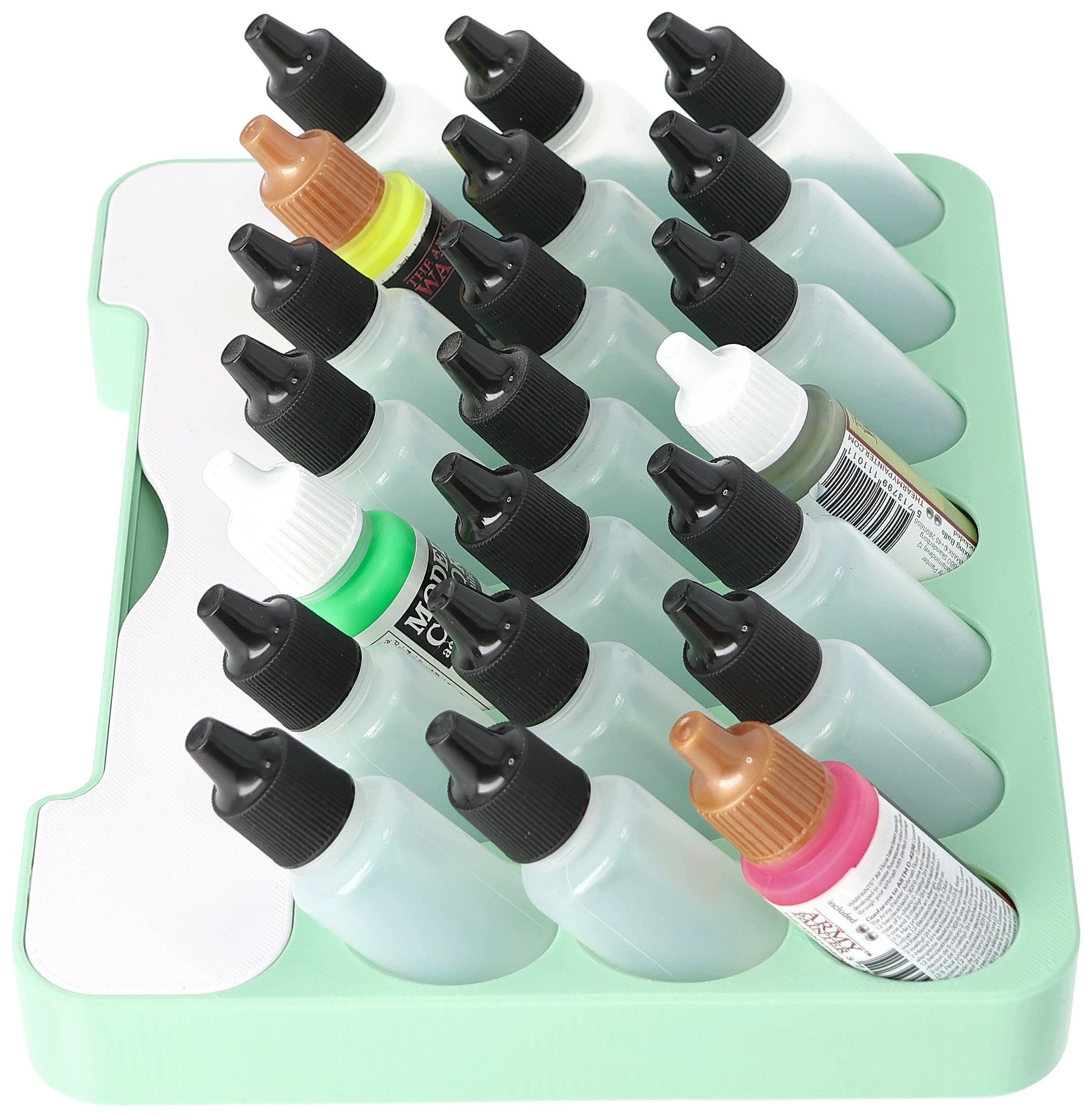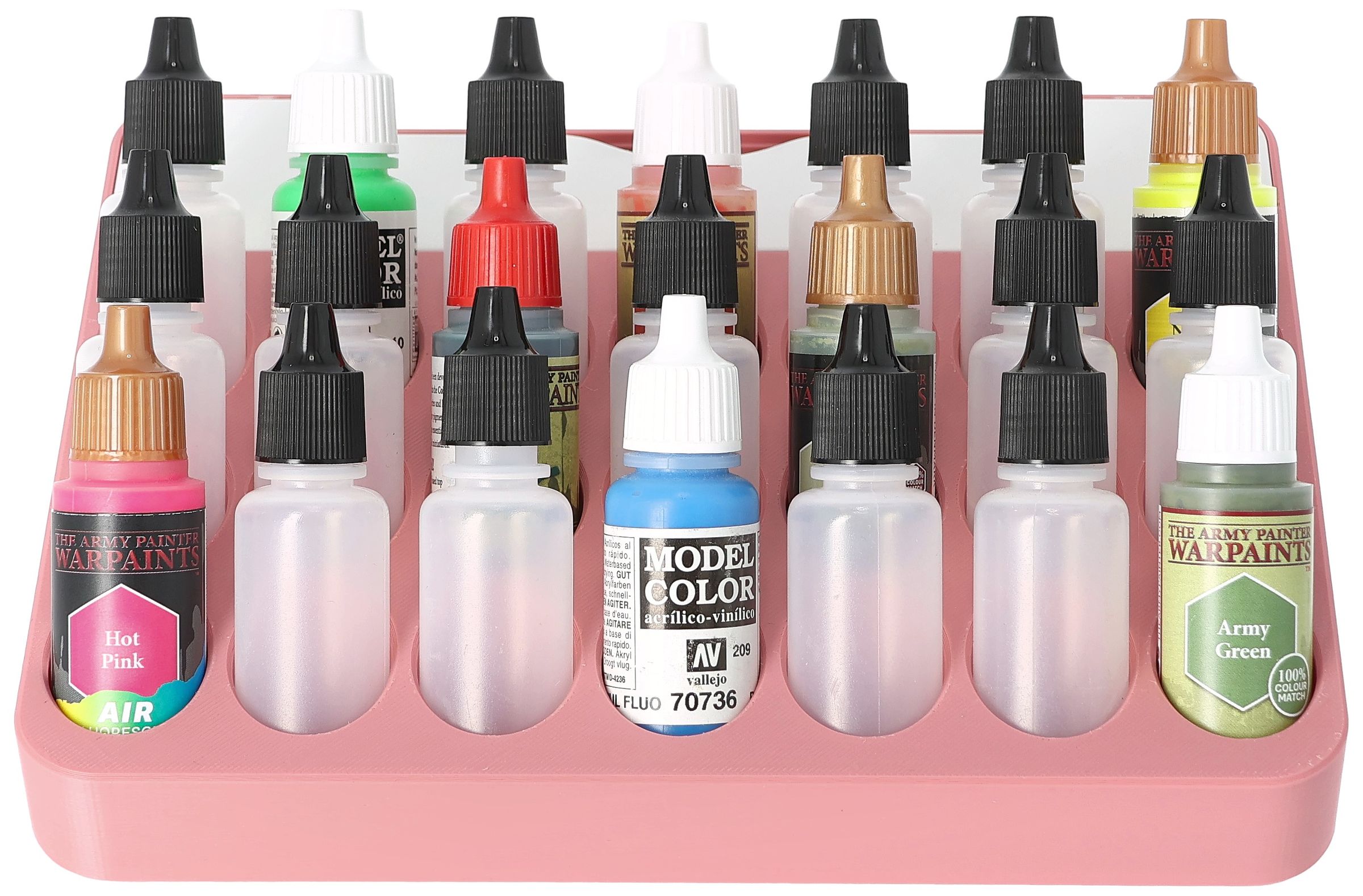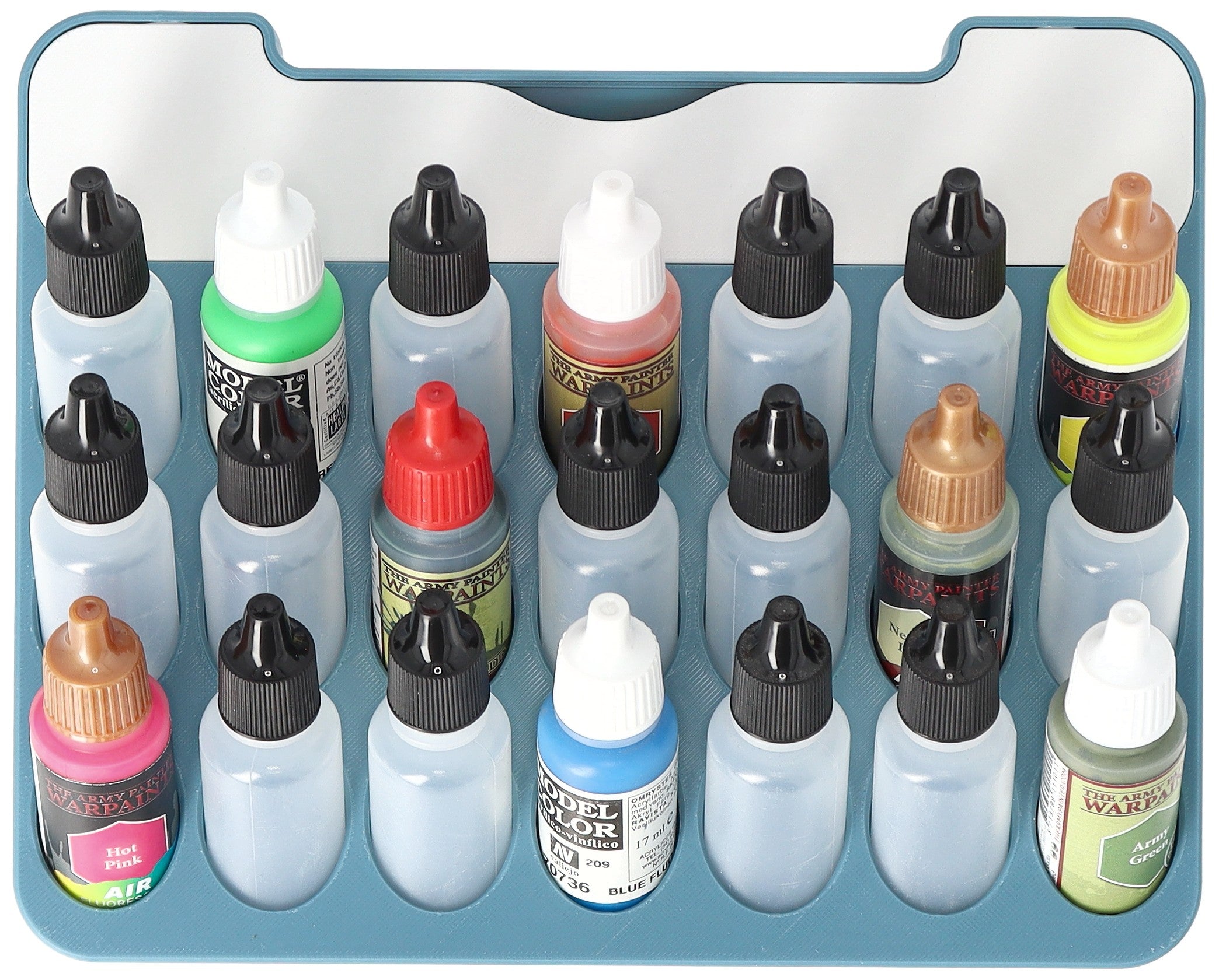 • Paint rack with 21 round compartments for paint bottles with a diameter of 25 mm - compatible with dropper bottles from Vallejo (17 ml), Army Painter (18 ml) and other common formats