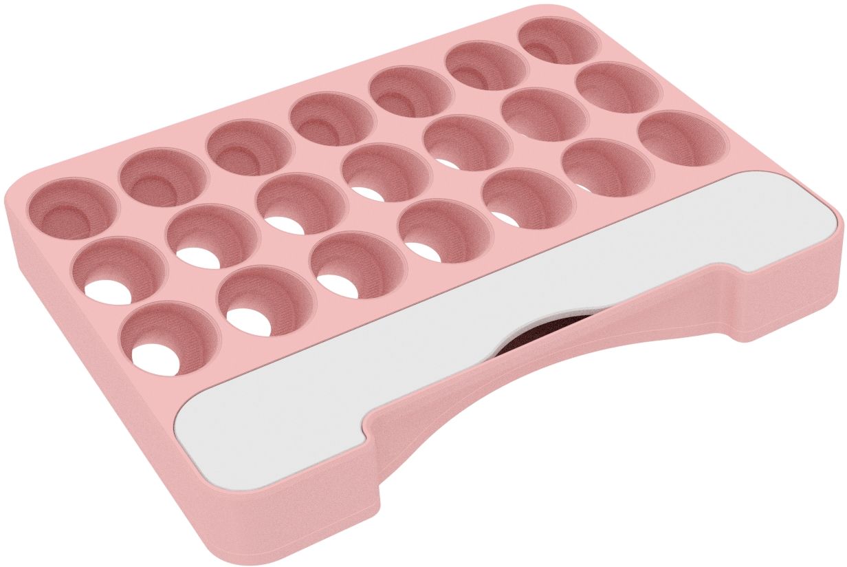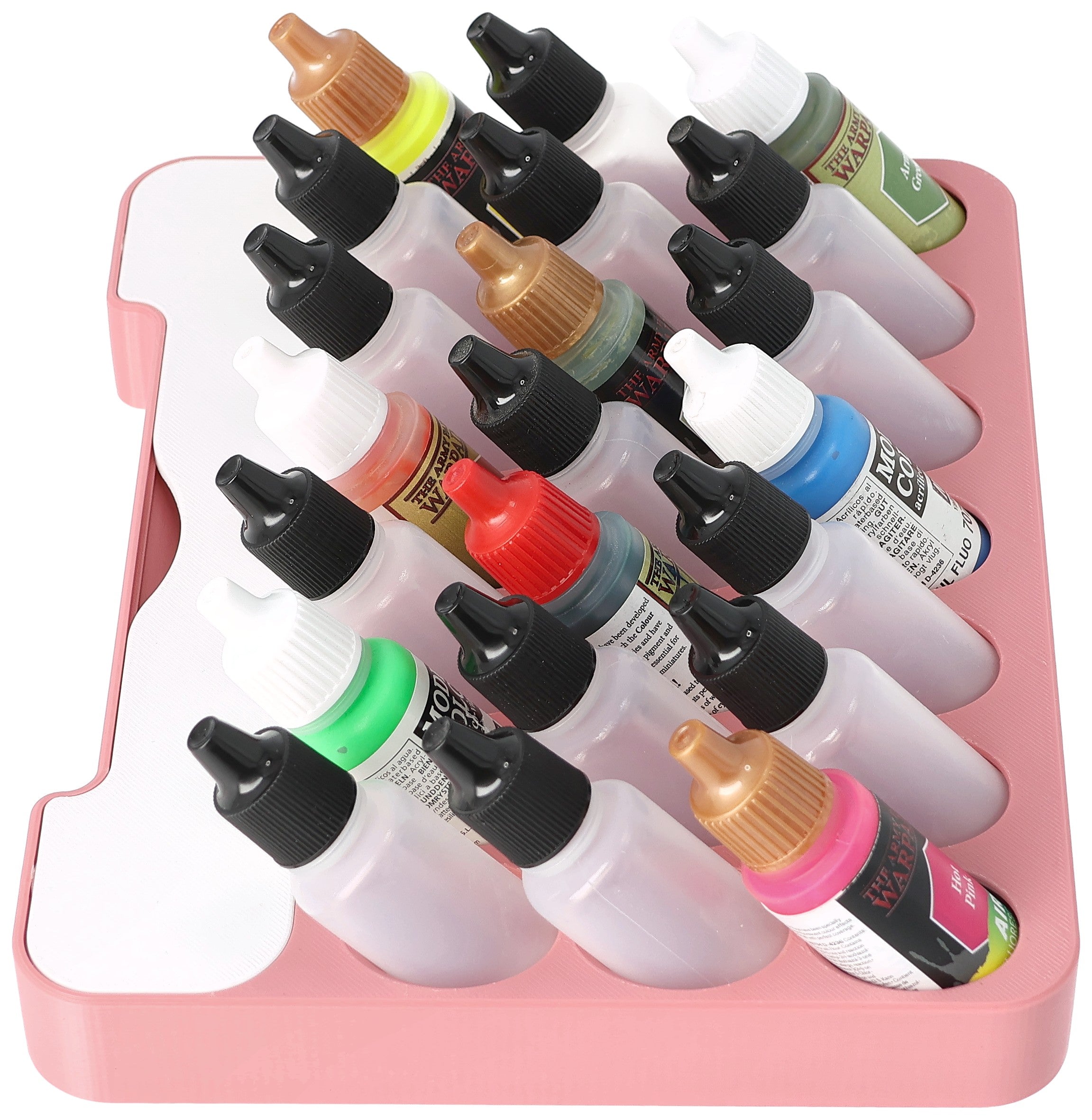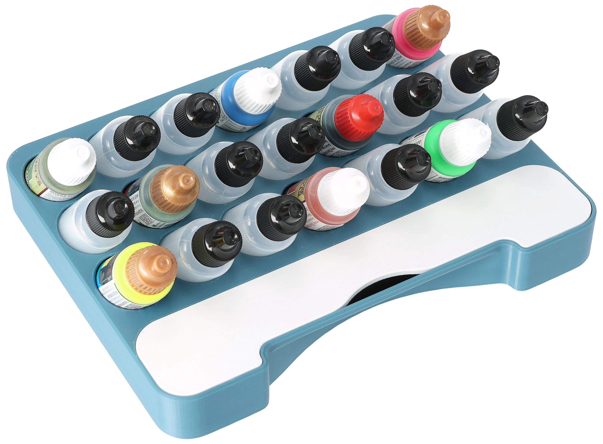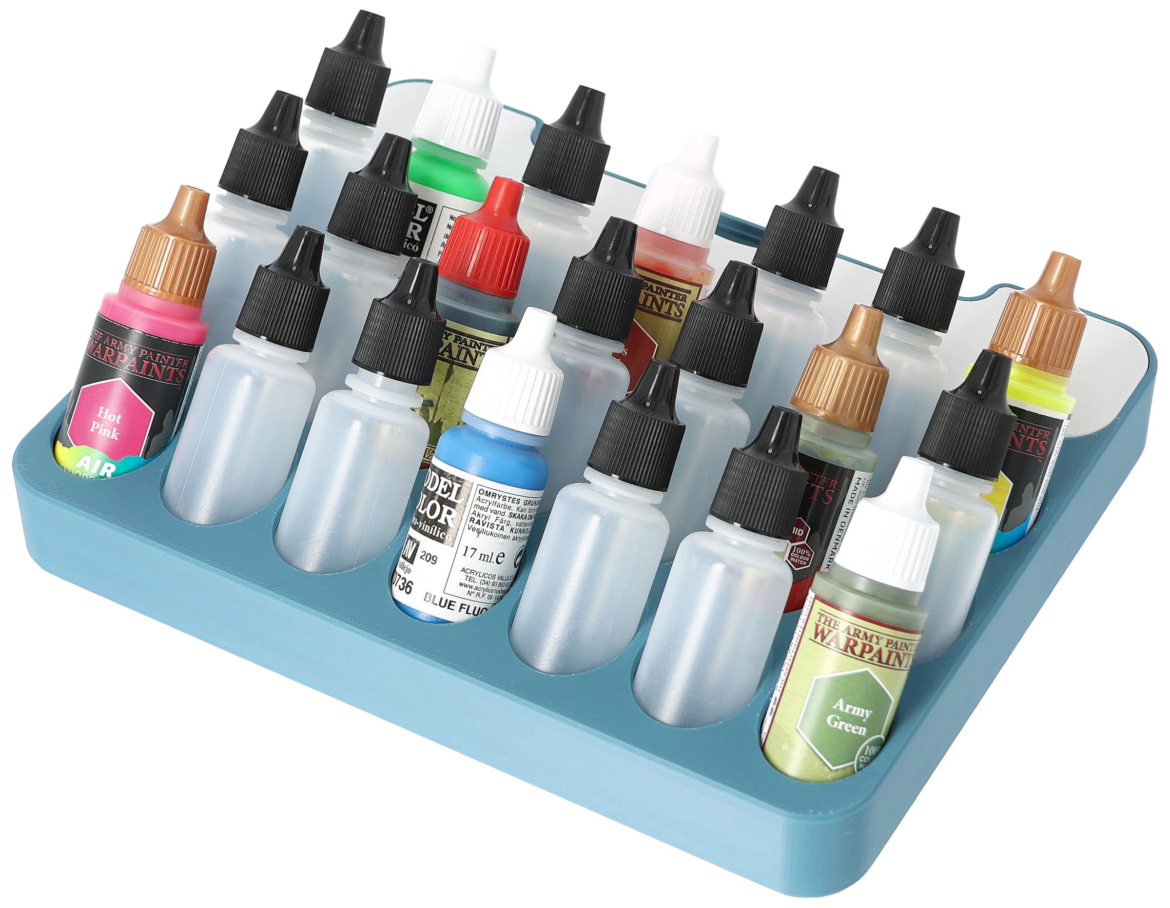 • Paint rack with 21 round compartments for paint bottles with a diameter of 25 mm - compatible with dropper bottles from Vallejo (17 ml), Army Painter (18 ml) and other common formats