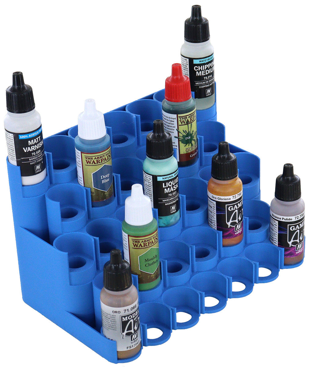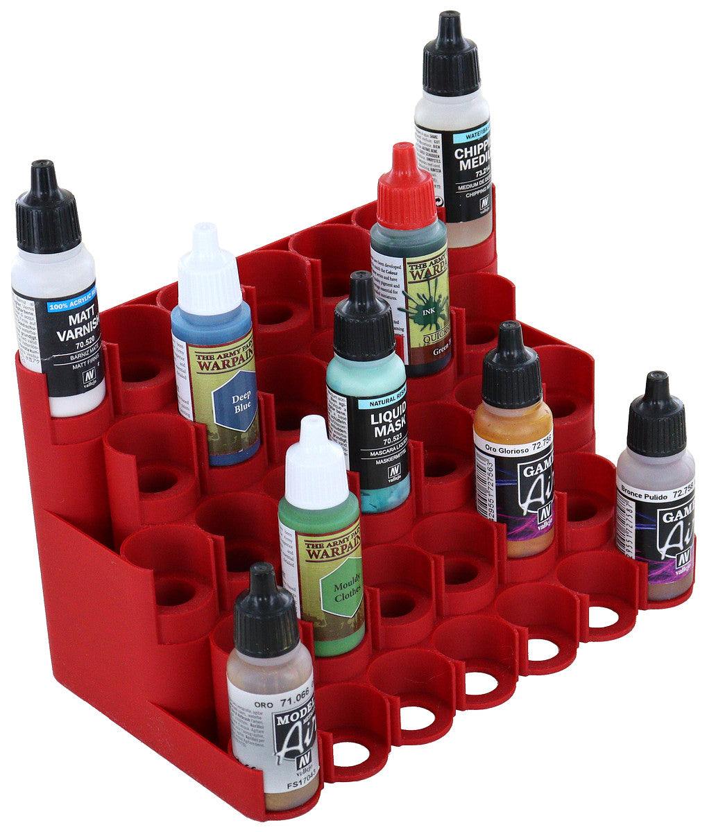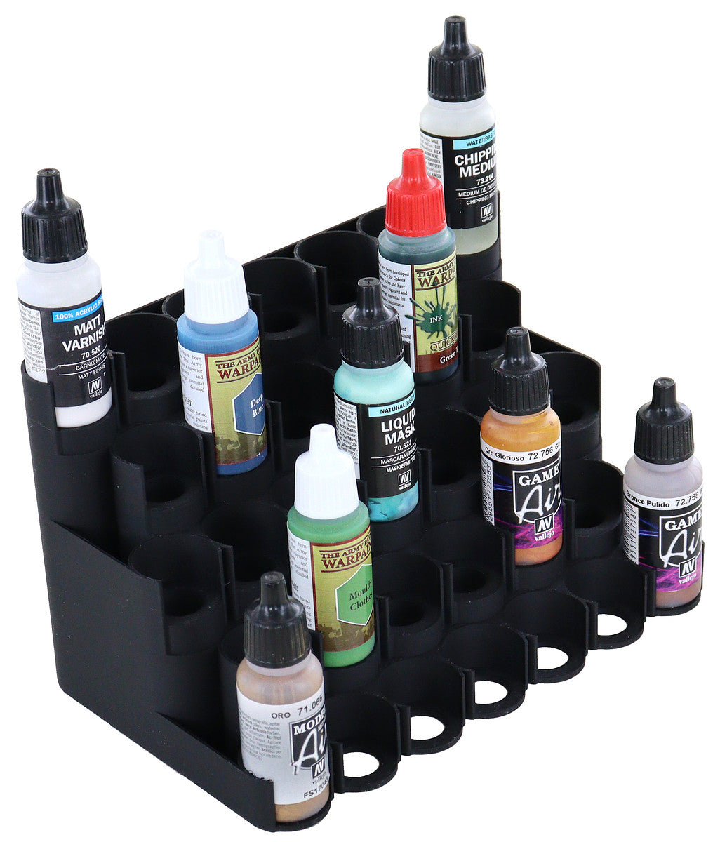 • The Feldherr Paint Rack fits color bottles with a 25 mm diameter from Vallejo, Armypainter, Scalecolor, and other manufacturers.