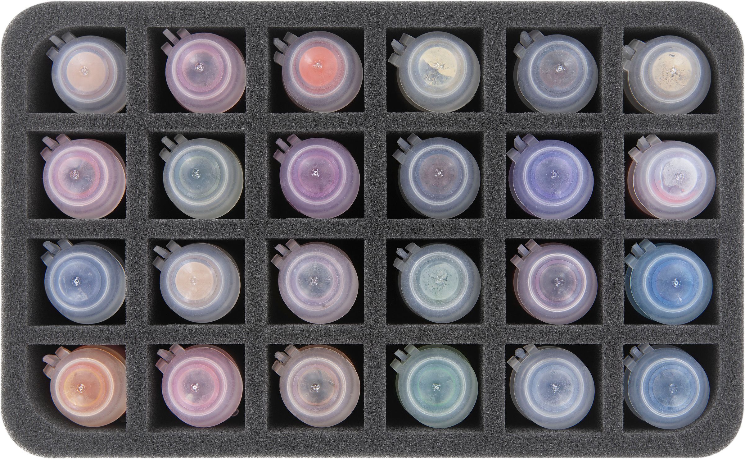 Up to 24 Citadel paint pots in 24 ml size can be stored here clearly arranged and portable. Thanks to the lightweight material, this foam insert is a wonderful addition to your hobby case.