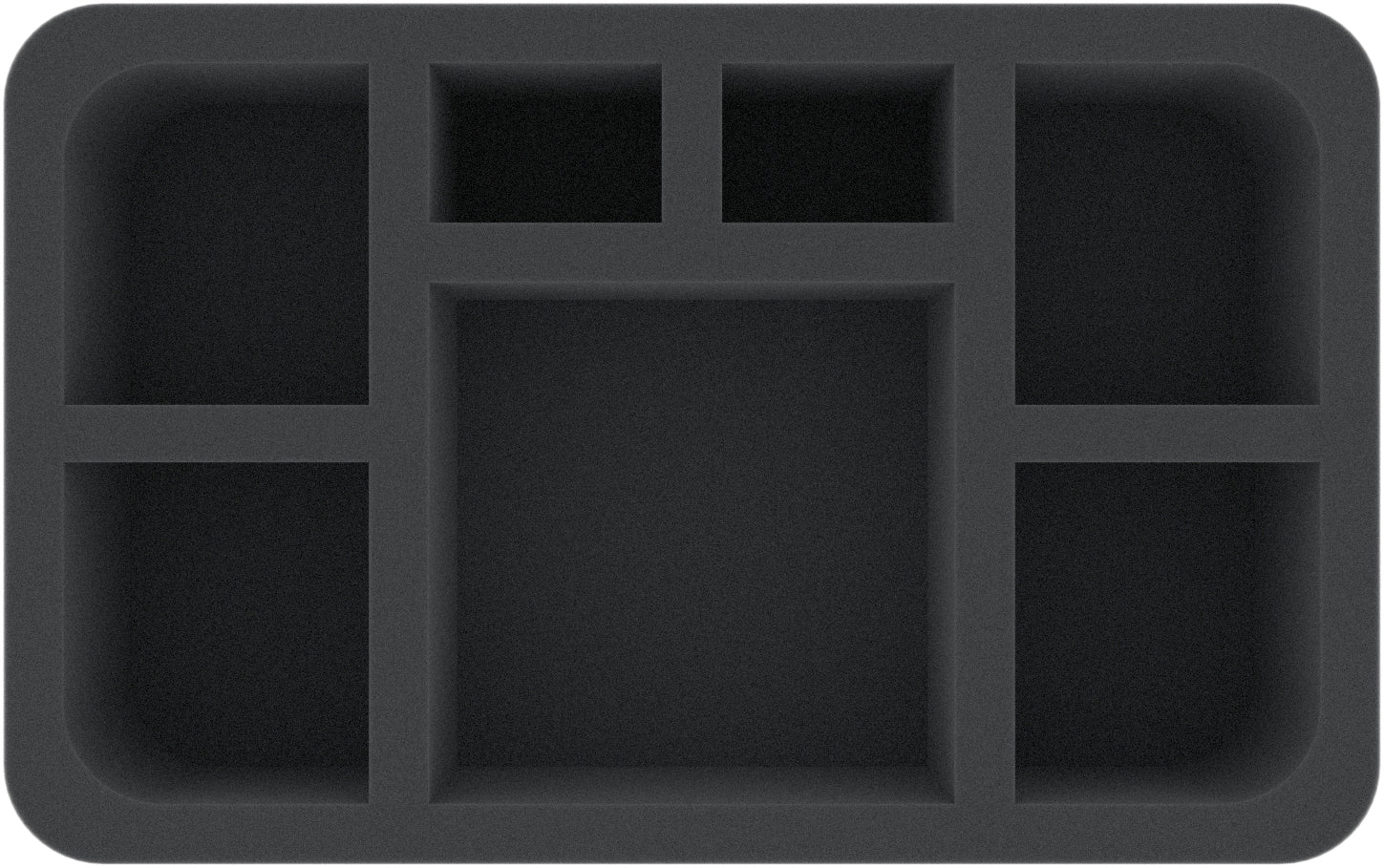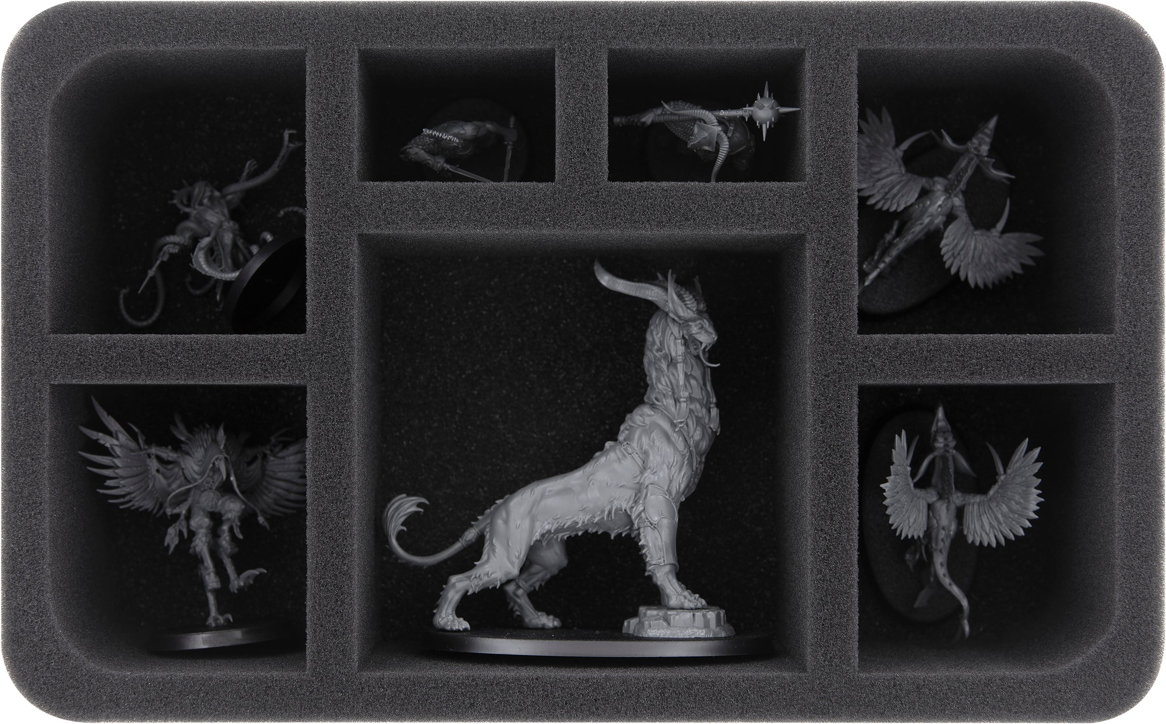 A total of 7 compartments in different sizes provide protection for your warriors and monsters on this Half-Size foam tray. Medium sized miniatures and bulky warrior models find a safe place here and can be transported safely to the gaming table.