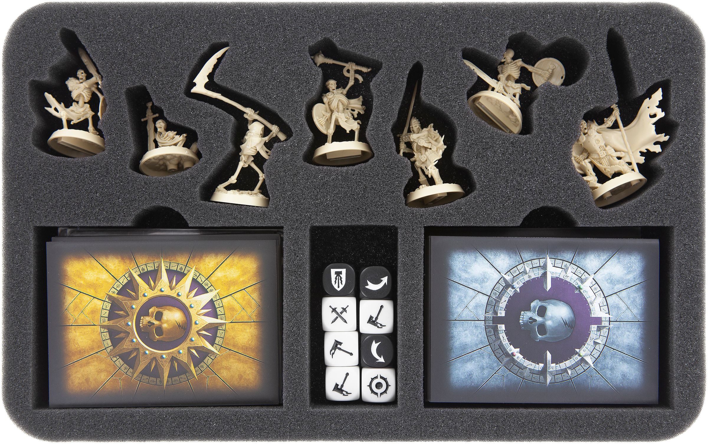 In addition, the foam tray has two compartments for up to 40 cards. Which will fit with sleeve as well of course. A further compartment is provided for the cuboids. With this you keep order and your undead flock is always ready for battle.