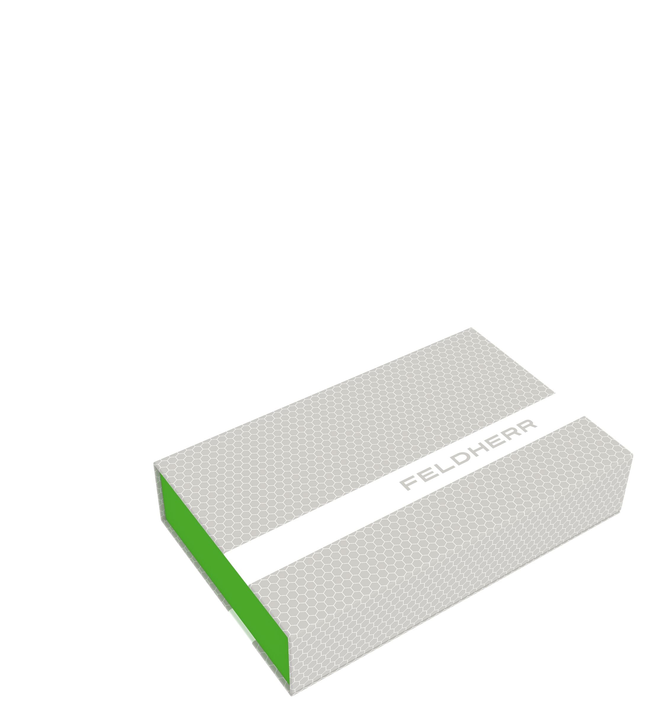 The Magnetic Box is the ideal solution for storage and transport due to its low weight and the flat, rectangular shape. It consists of coated solid cardboard in modern Feldherr design. The green box, in which the foam mats are placed, is firmly glued to the casing. This also serves as a lid. Two integrated magnets on the flap and front allow a seamless and easy closing, so that nothing gets lost during transport.