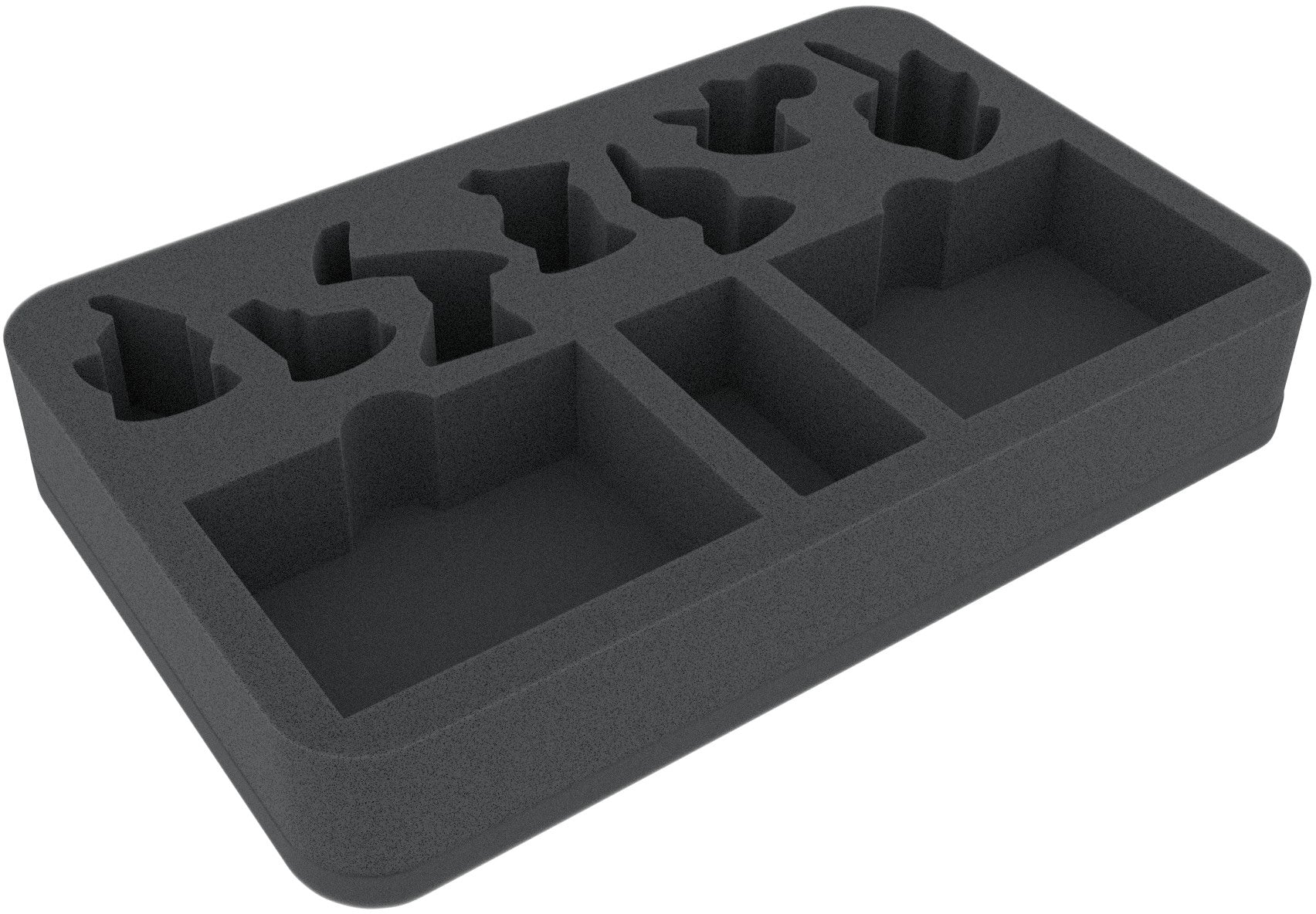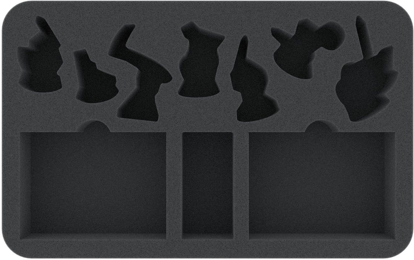 The tray has seven individually tailored compartments for the 3 Petitioners, The Champion, The Harvester, The Prince of Dust and The Sepulchral Warden. The miniature-precise cutting prevents the figures from slipping or colliding. This preserves the sensitive parts, such as scythes or cloaks, from bending or breaking and painted figures from getting scratched.