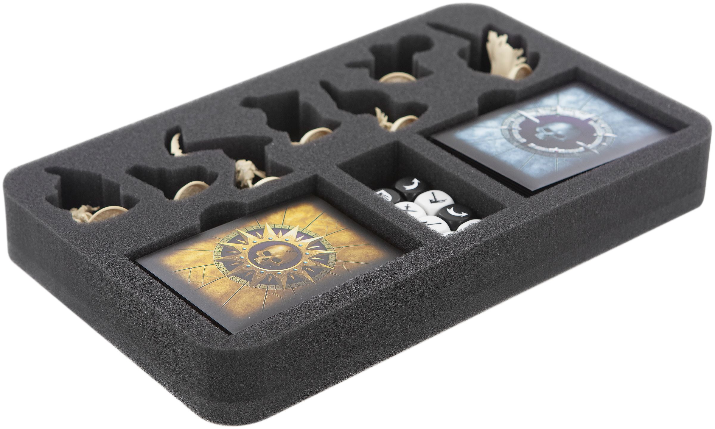 In addition, the foam tray has two compartments for up to 40 cards. Which will fit with sleeve as well of course. A further compartment is provided for the cuboids. With this you keep order and your undead flock is always ready for battle.