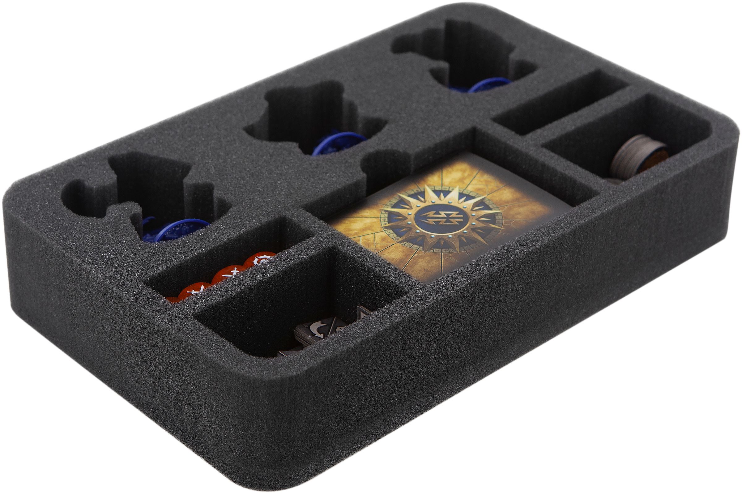 The foam tray is also equipped with a compartment for up to 40 cards. They will fit with or without sleeves. Four additional compartments provide extra space for dice and tokens so you can keep track. And your warriors are always ready for battle.