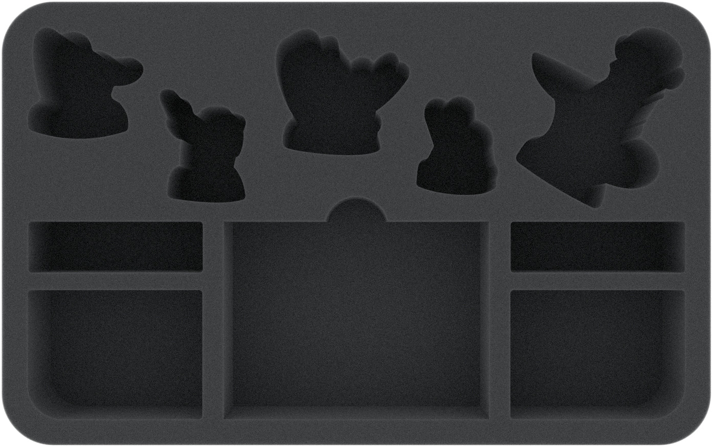 The tray is divided into 10 compartments to clearly store the miniatures and accessories. 5 of these are individually tailored to 'Thundrik's Profiteers'. Bjorgen Thundrik, Dead-Eye Lund, Enrik Ironhail, Garodd Alensen, and Khazgan Drakkskewer are securely embedded in soft foam.