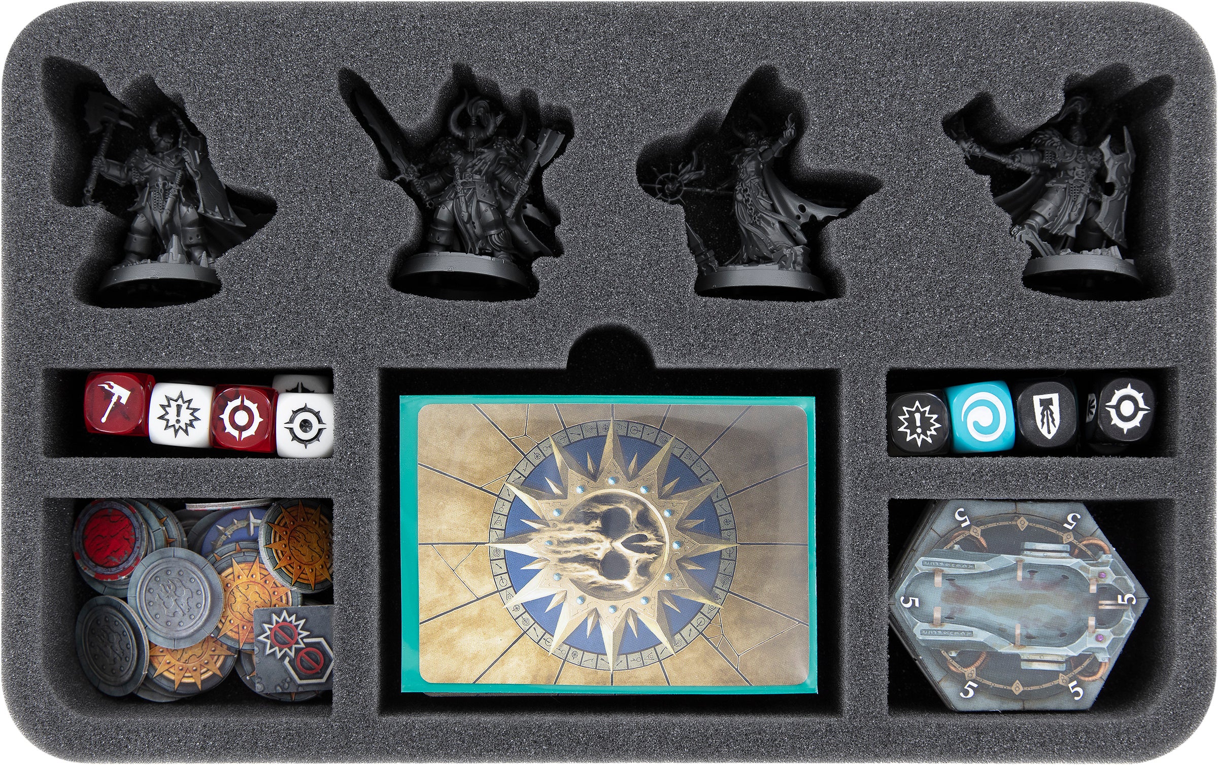 A further compartment is reserved under the miniatures for the cards. It is provided with a finger-wide recess so that you can get the decks out more easily. Up to 40 cards fit in here, of course also with sleeves. The compartment is also large enough to fit one Direchasm Deckbox. Dice and tokens can be sorted into the remaining four compartments.