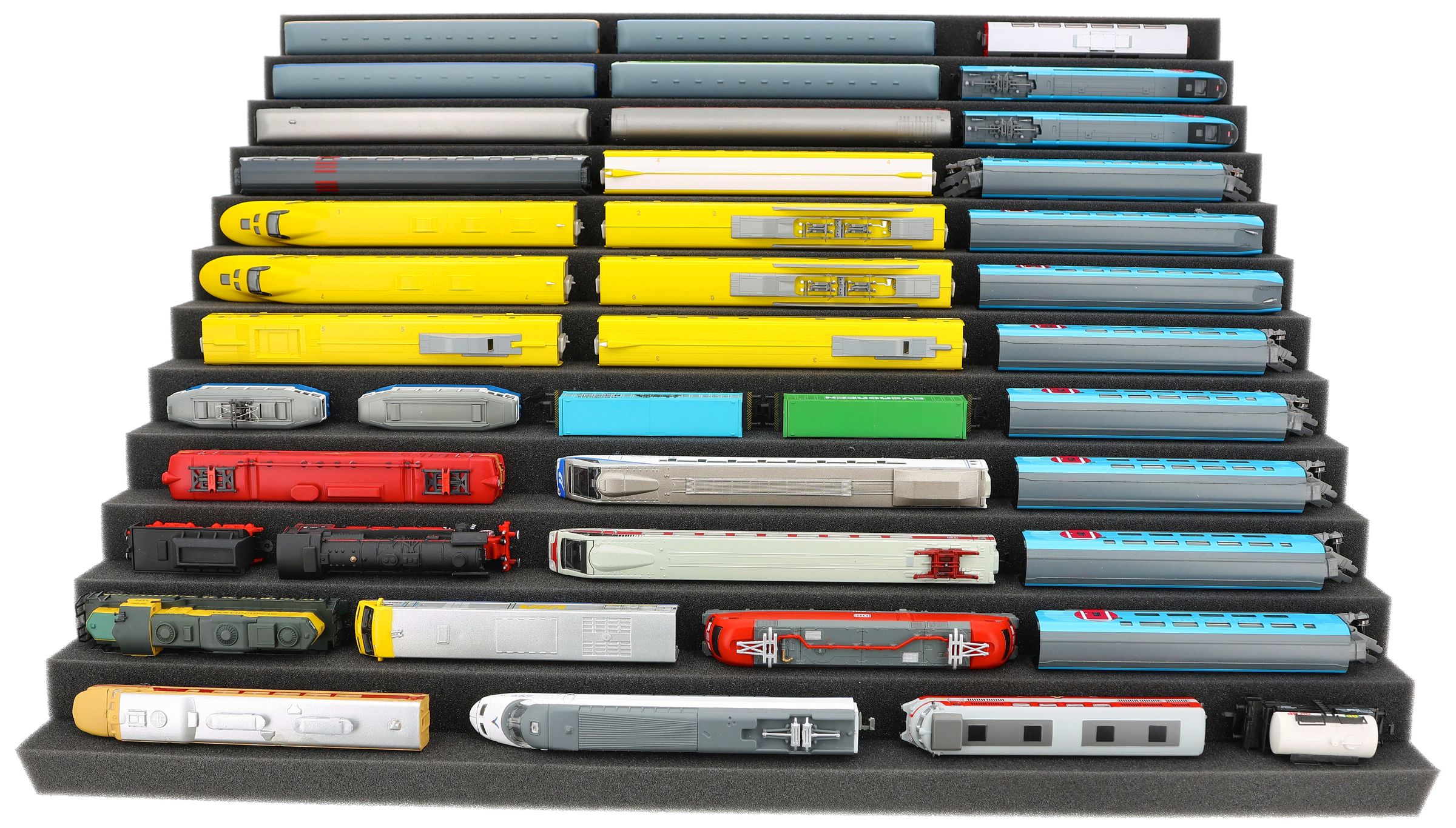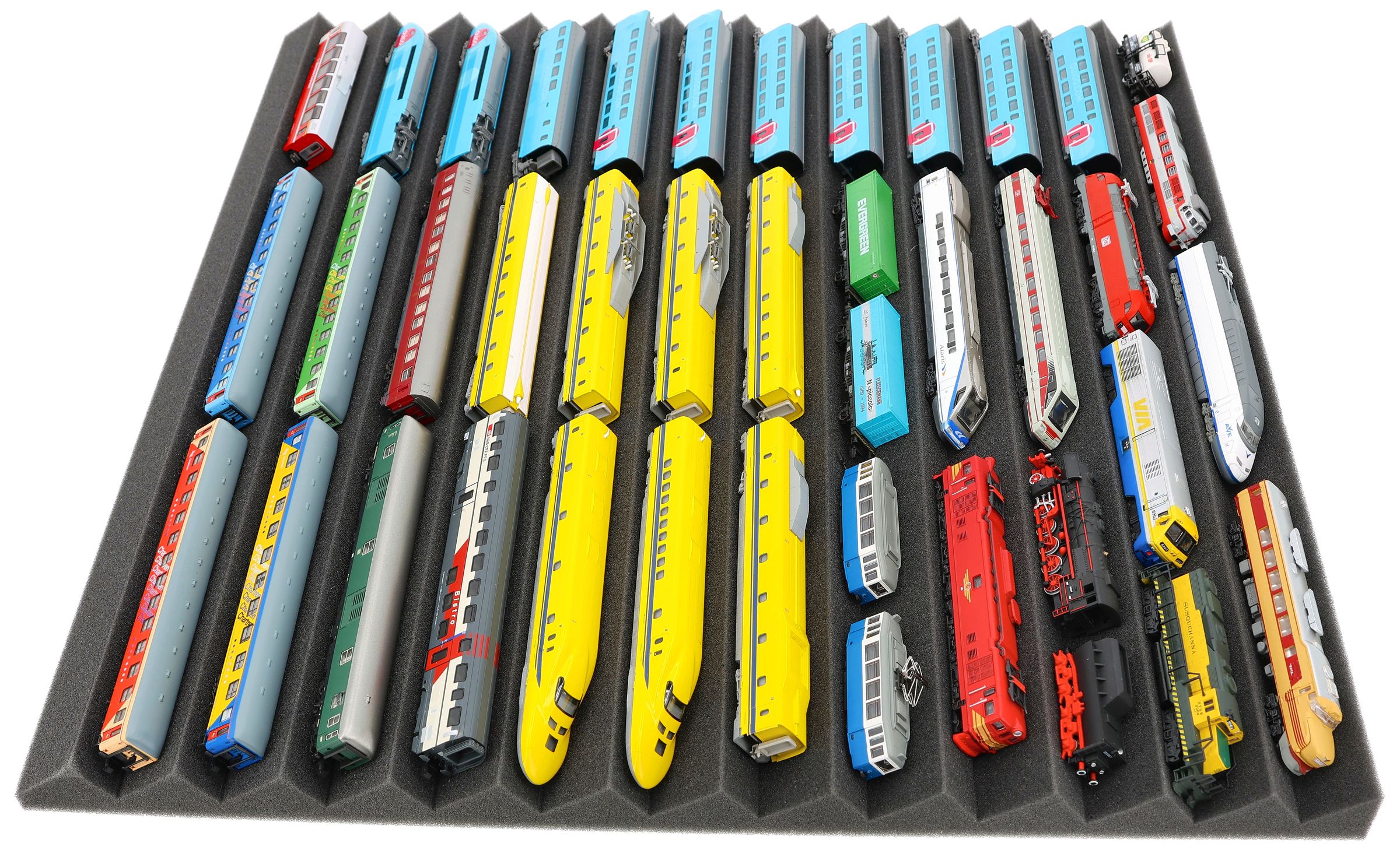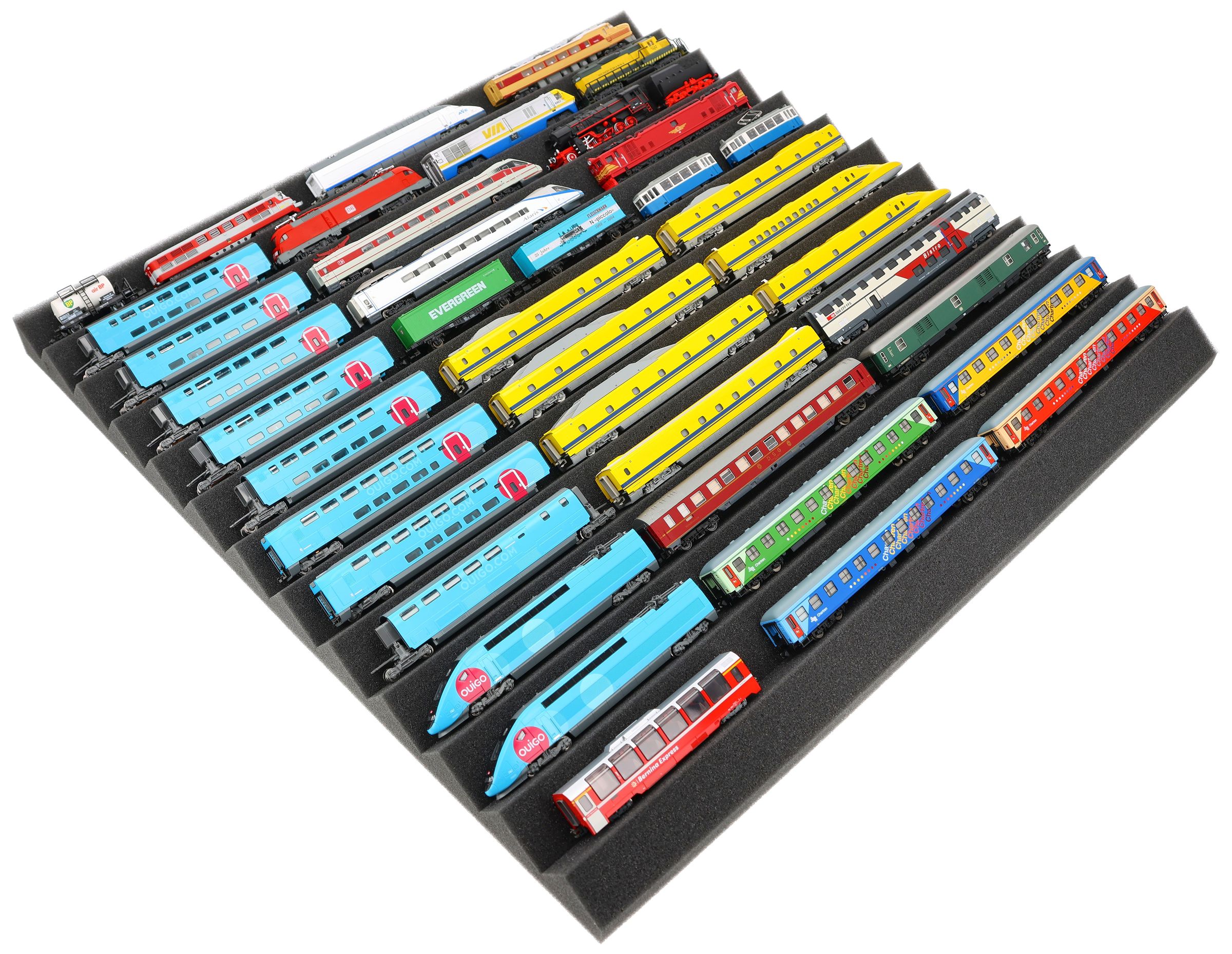Customizable zig-zag foam mat for safe and tidy storage of model railways in N gauge - always the right size.