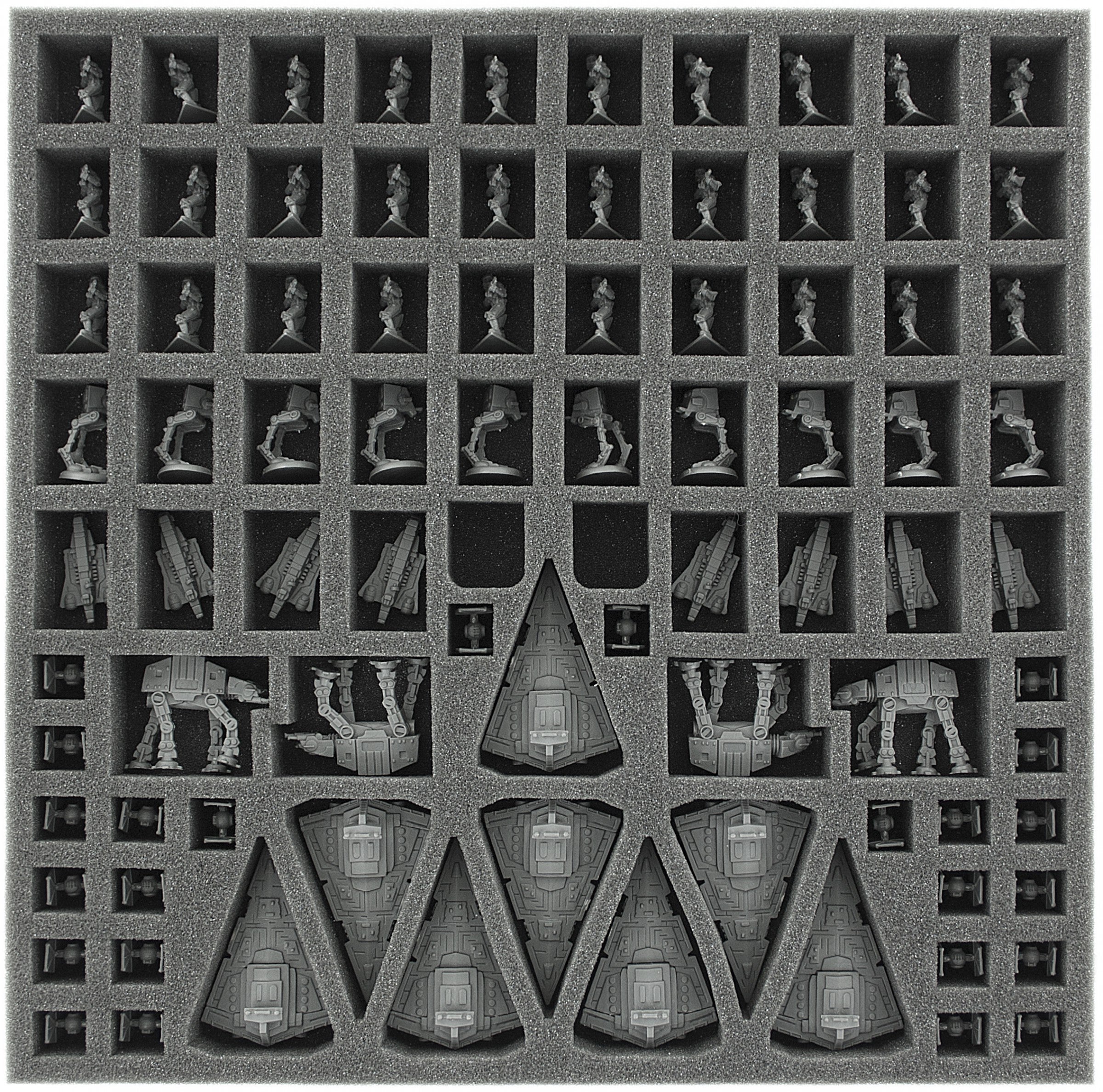 Foam tray especially for Star Wars Rebellion. The 86 different sized compartments are for 8 Star Destroyers, 4 AT-AT Walkers, 8 Assault Carriers, 10 AT-ST Scout Walkers, 30 Storm Troopers and 24 TIE Fighters.