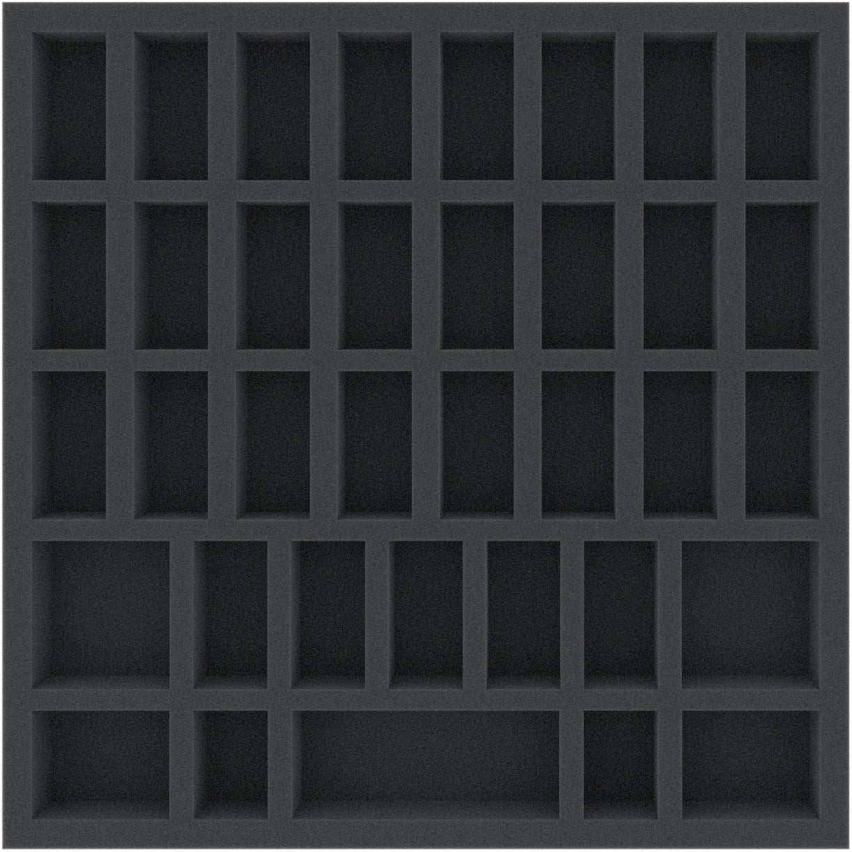 This foam tray with 36 compartments is custom cut for the board game Vengeance by Mighty Boards. 29 compartments will hold miniatures, 2 compartments are for further miniatures or tiles. One long compartment provides space for either dice or the Timer. Last not least, 4 further compartments will hold addiditional markers, tokens, cuboids and dice.