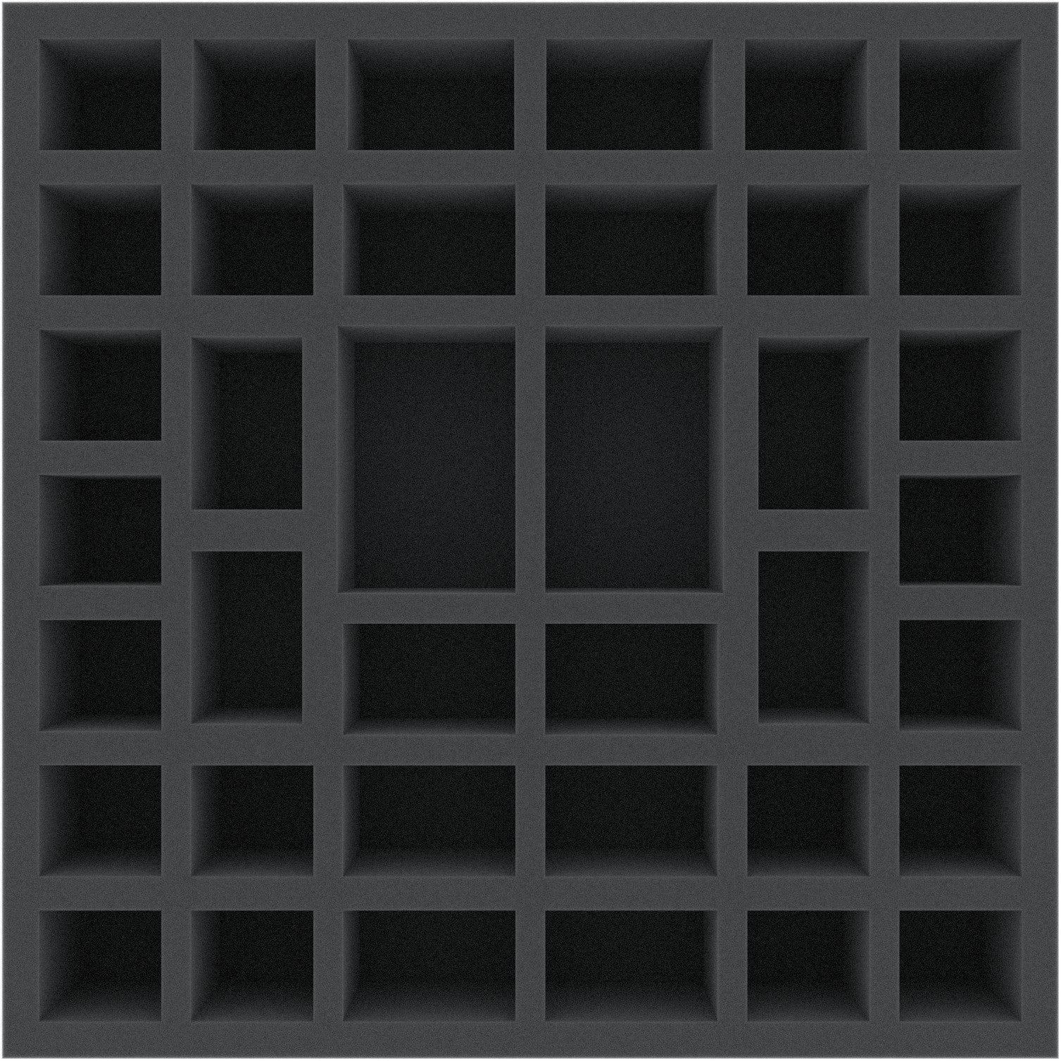38 cut-outs for miniatures, tokens and mini cards in sleeves fit into the foam tray. The foam insert fits perfectly into the original board game box, or into the Feldherr box LBBG.