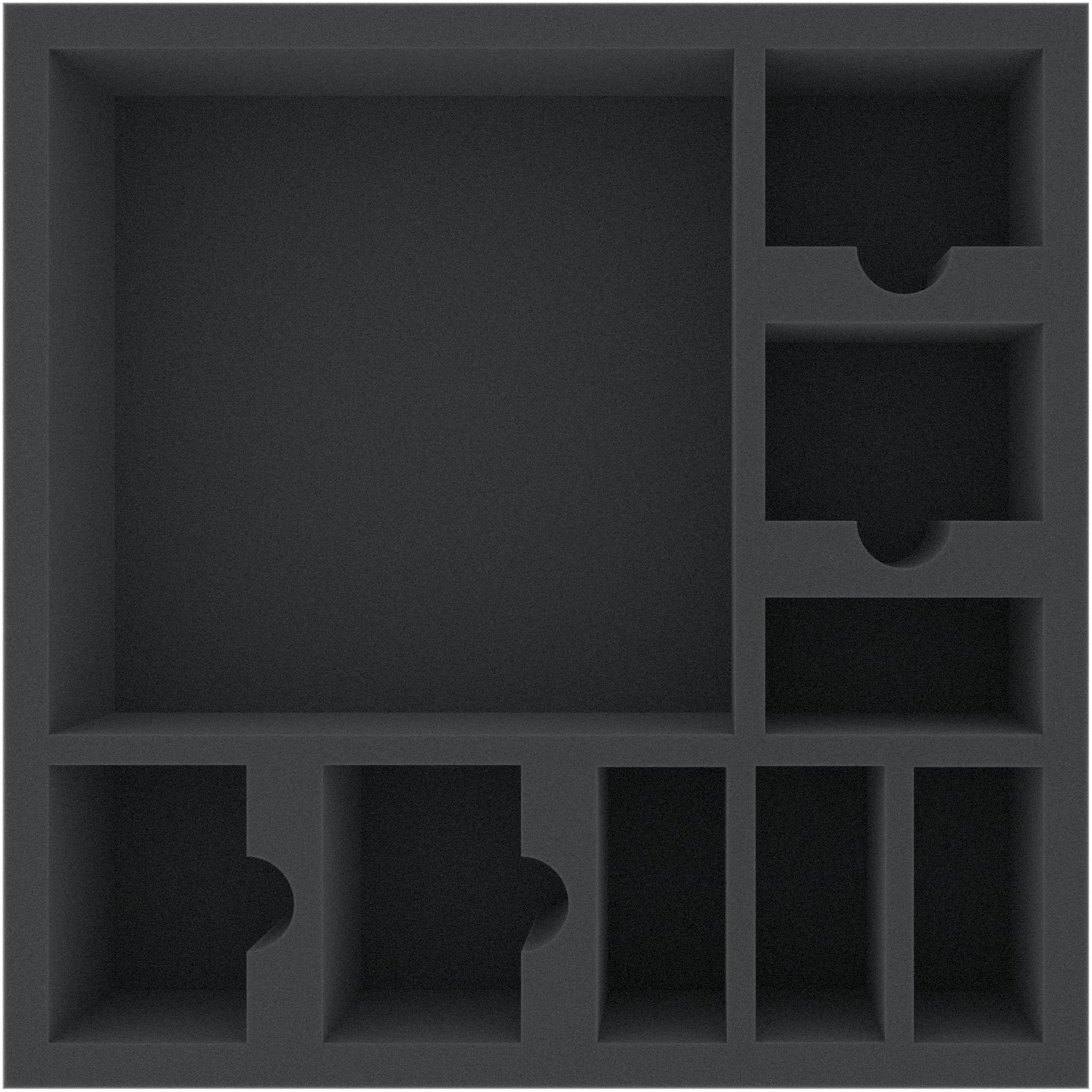This foam insert is divided into 9 compartments of different sizes. It is particularly suitable as an insert for the safe storage of miniatures and game material in the original board game boxes (e.g. FFG).