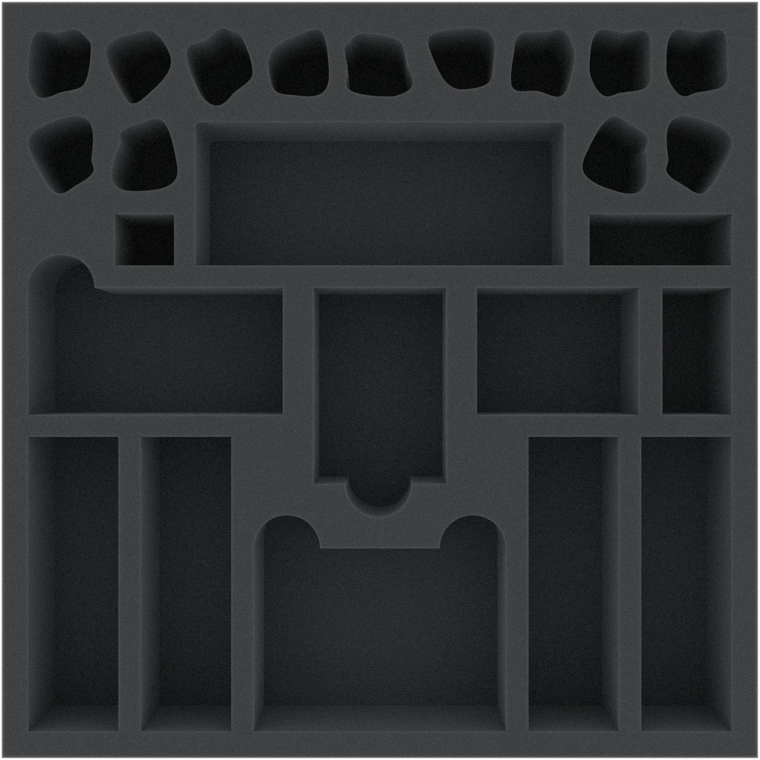 This 50 mm mm high foam tray is divided into 25 compartments. It is particularly suitable for the safe storage of tabletop and board game miniatures, as well as other fragile models and small parts.