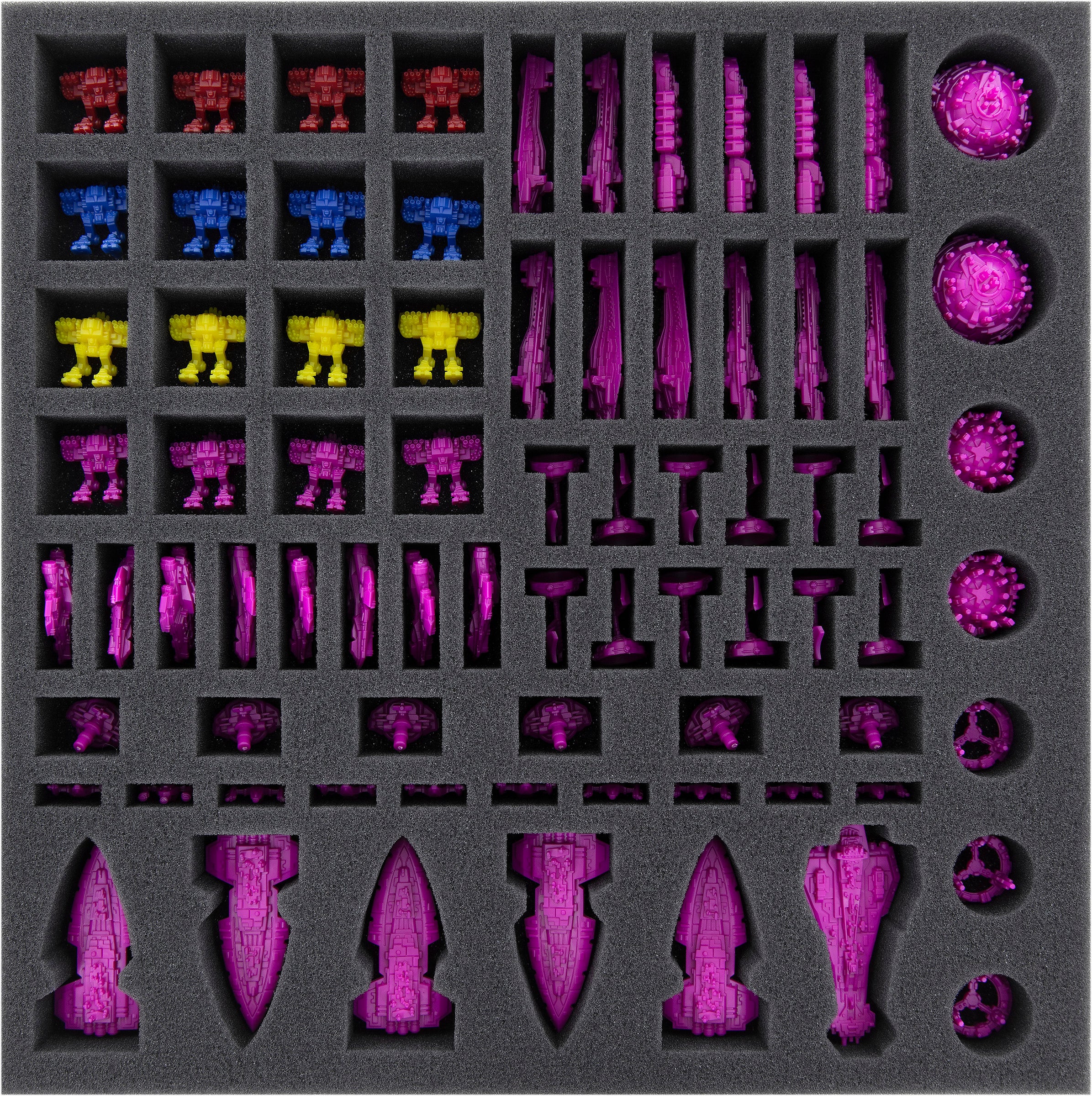 This Feldherr foam tray has miniature-precisely cut compartments for the plastic miniatures from the "Prophecy of Kings" expansion for "Twilight Imperium 4th Edition".