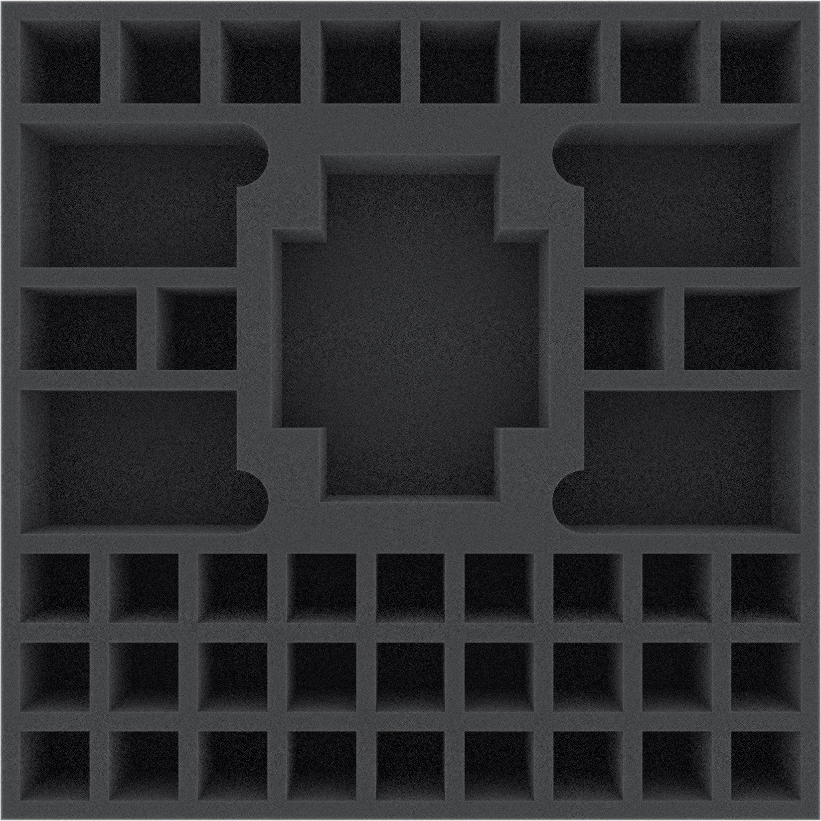 Les dimensions de ce plateau en mousse pour jeux de société sont de 295 mm x 295 mm x 50 mm. L'épaisseur de 50 mm est le résultat d'une base et d'un plateau de 10 mm avec une hauteur utile effective de 40 mm.