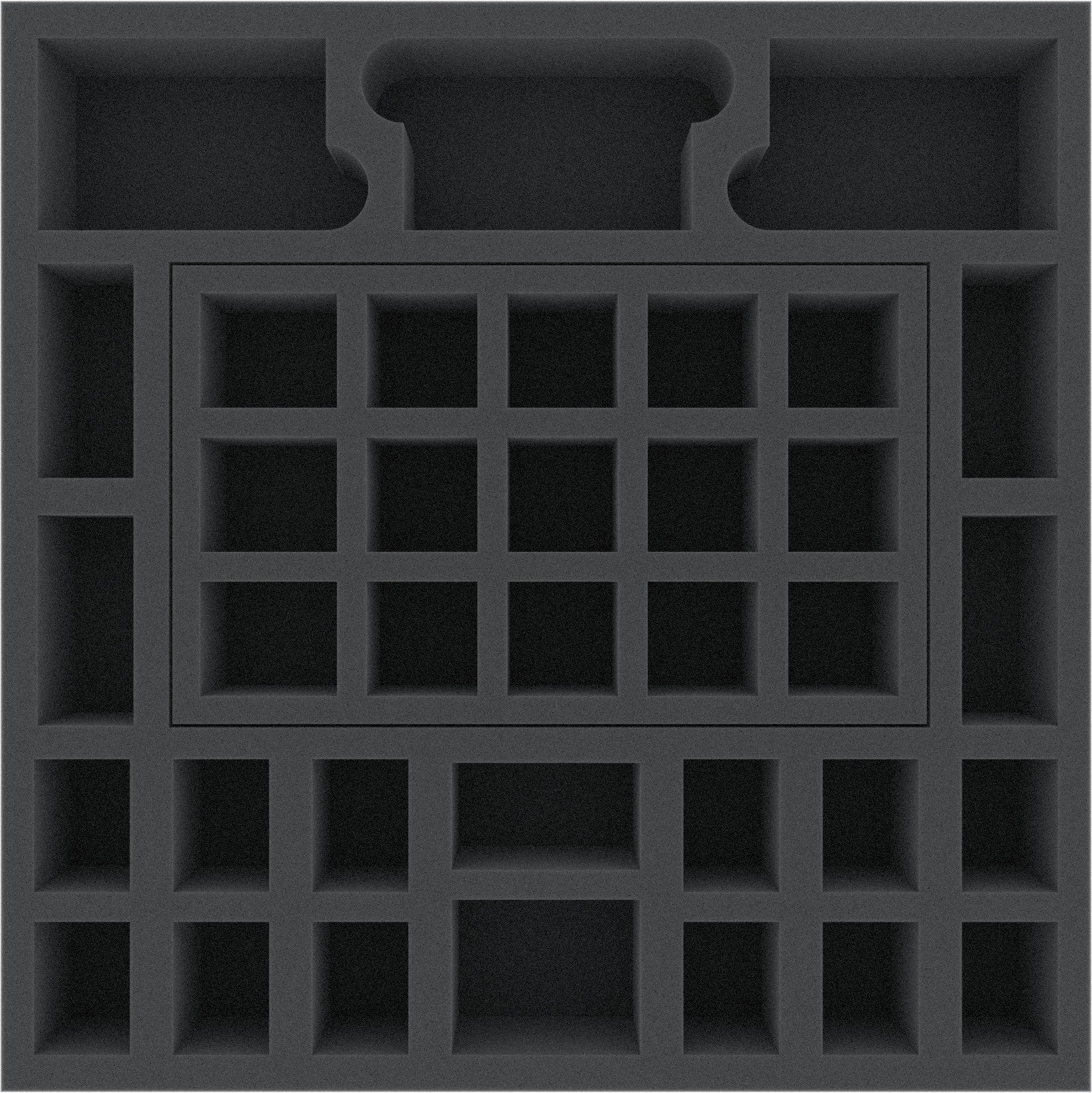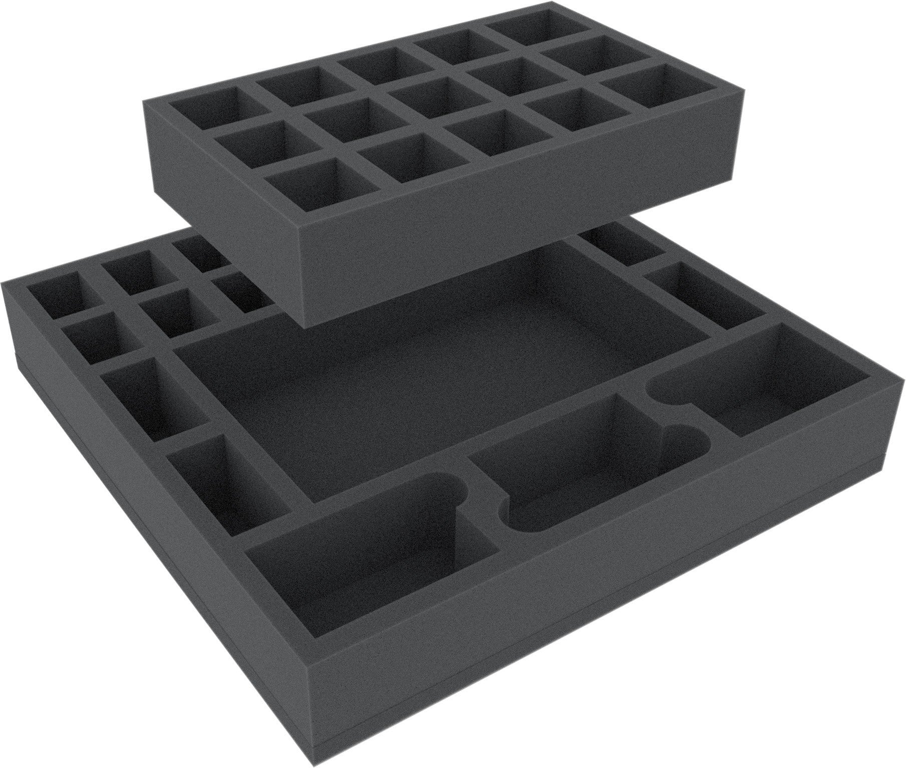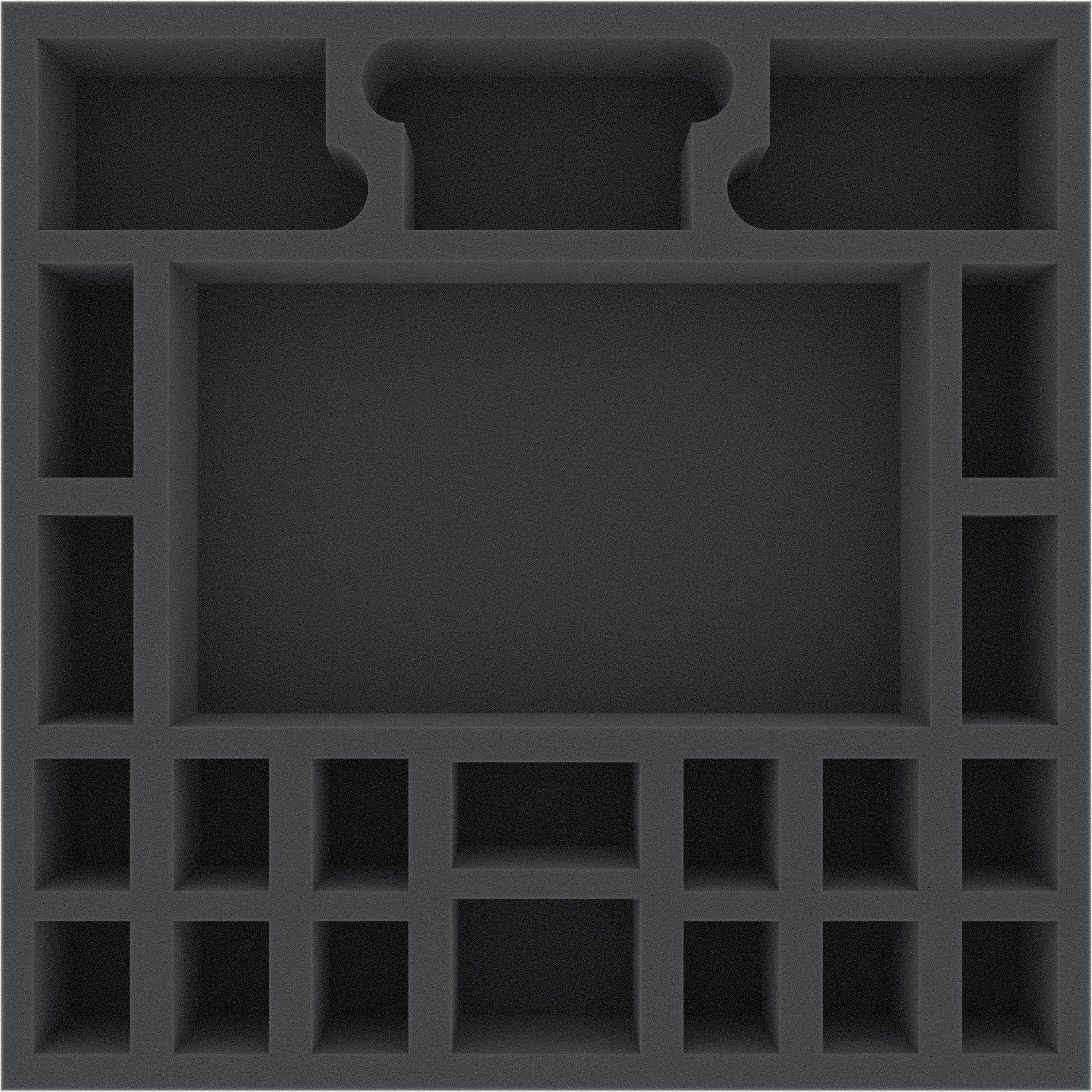 Foam tray especially for Zombicide Black Plague - Heroes. The 22 different sized compartments are suitable for all conceivable game material. So miniatures, cards, markers and dice can be kept in a well. In addition, there is included an extra foam insert, that can be used to divide the big compartment in 15 smaller compartments. The foam mat then has 36 compartments.