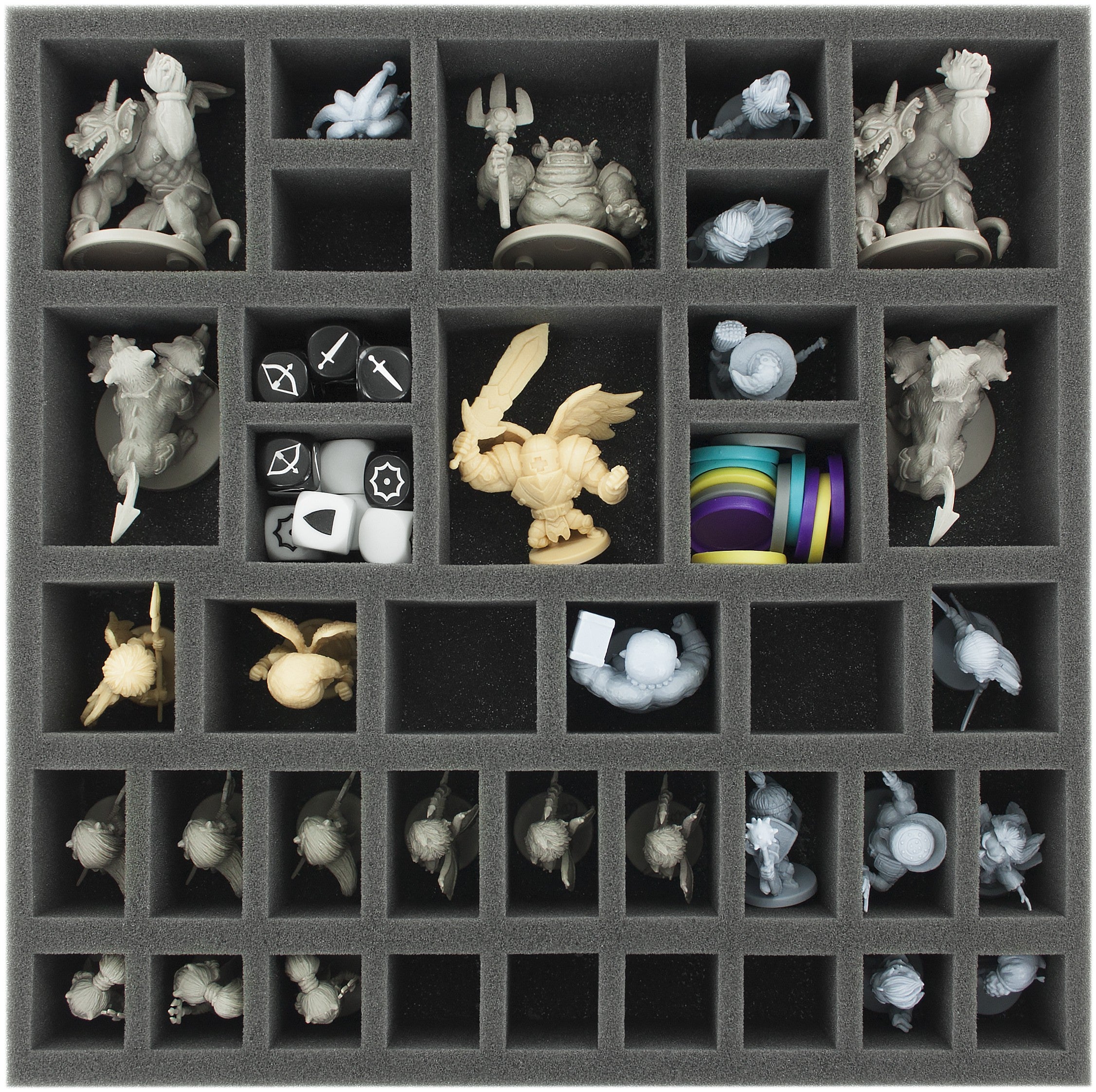 Foam tray especially for Arcadia Quest. The 38 different sized compartments are suitable for all conceivable game material.