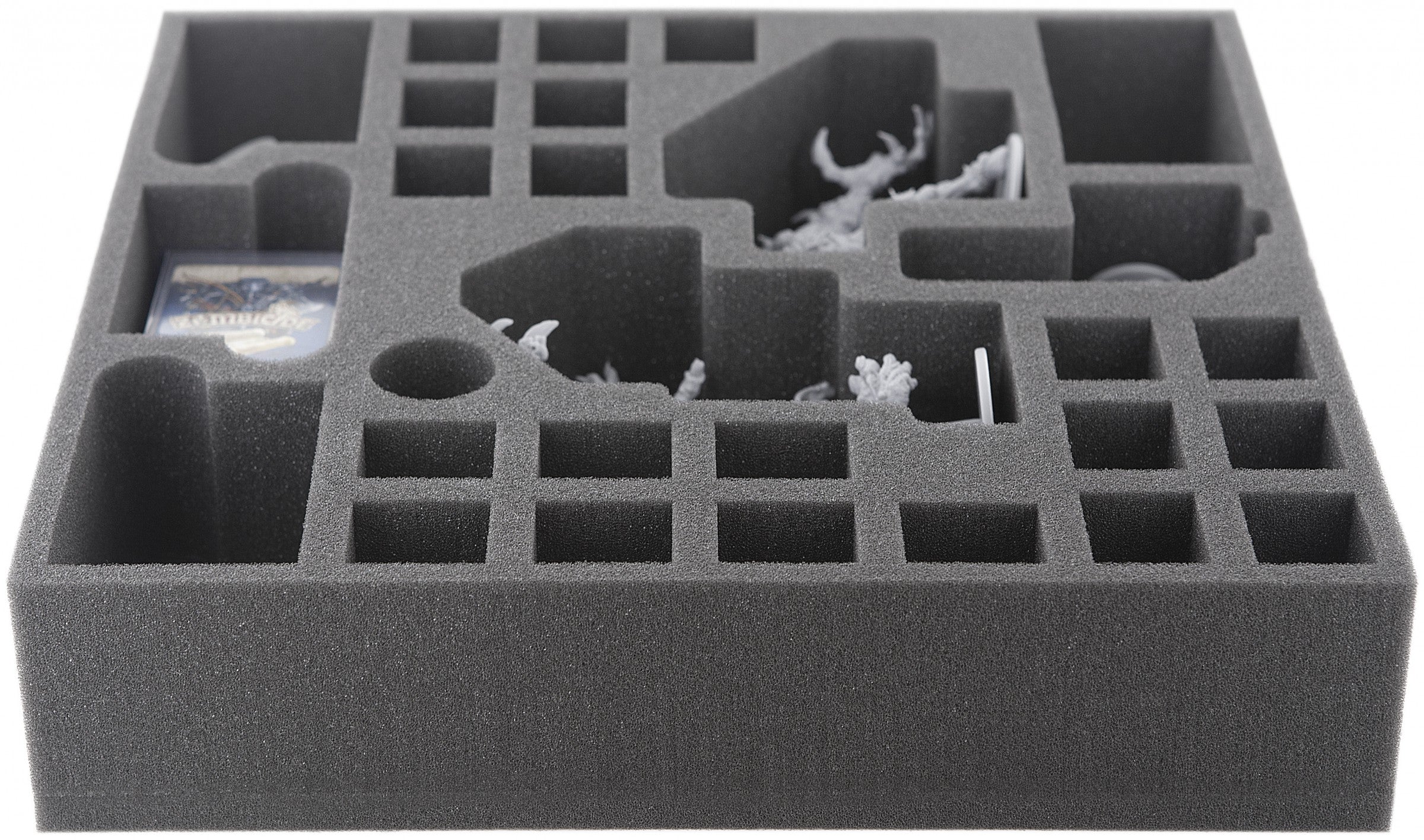 Foam tray especially for Zombicide Bosses and NPCs. The 28 different sized compartments are perfect for miniatures from the both expansions. So 20 Walkers, a Ablobination, a Abbominatroll, a Abominotaur, mini cards in sleeves and markers can be kept in a well.