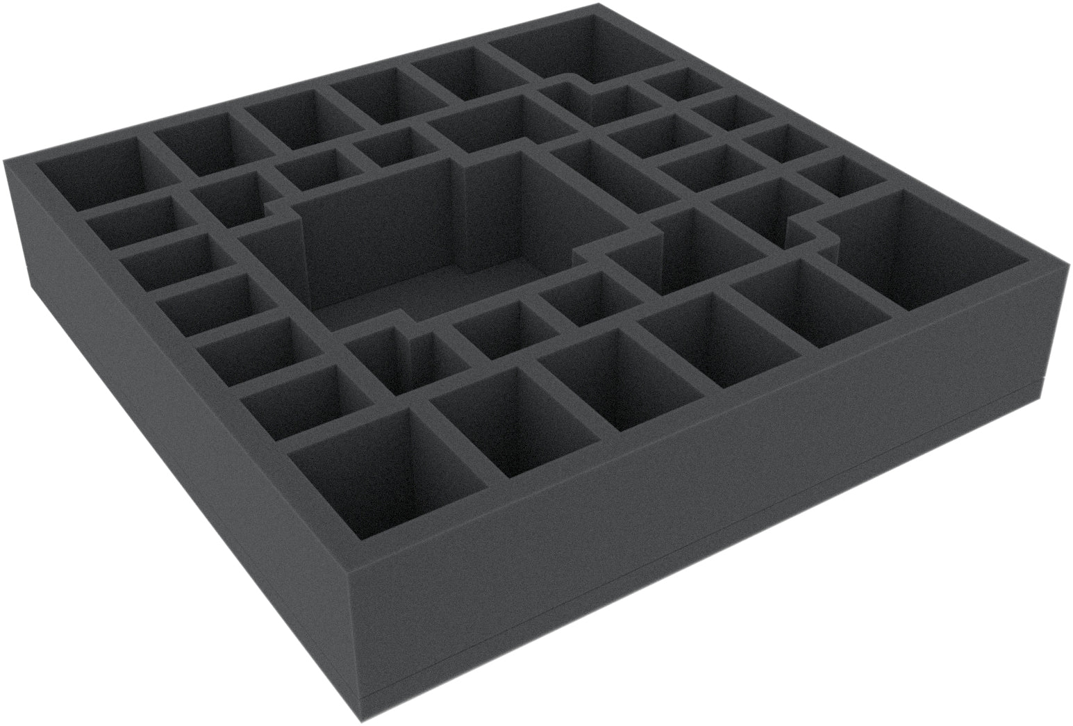 This 60 mm mm high foam tray is divided into 34 compartments. It is particularly suitable for the safe storage of tabletop and board game miniatures, as well as other fragile models and small parts.