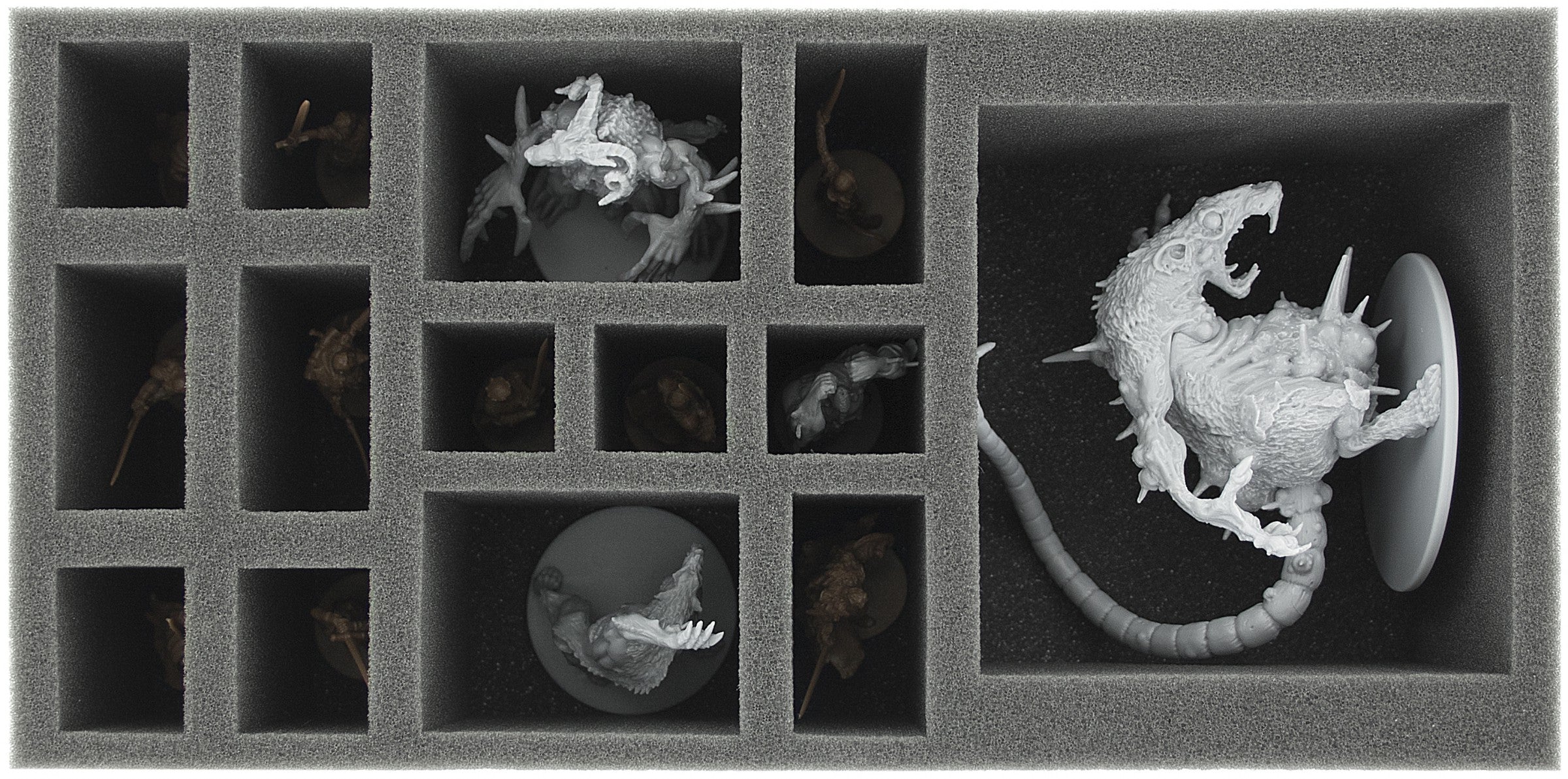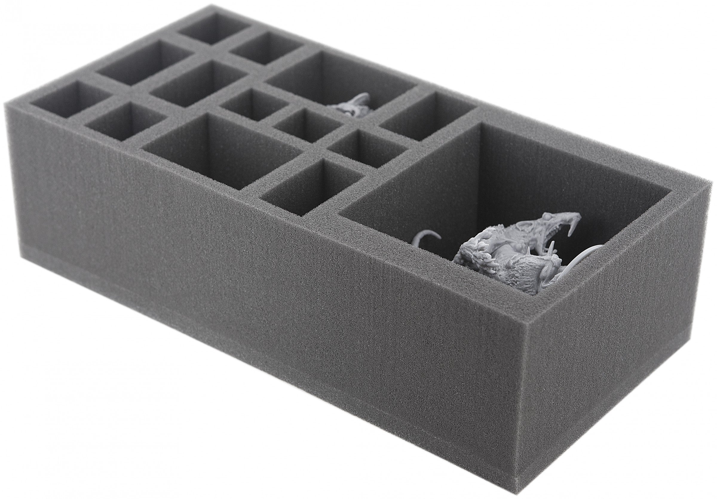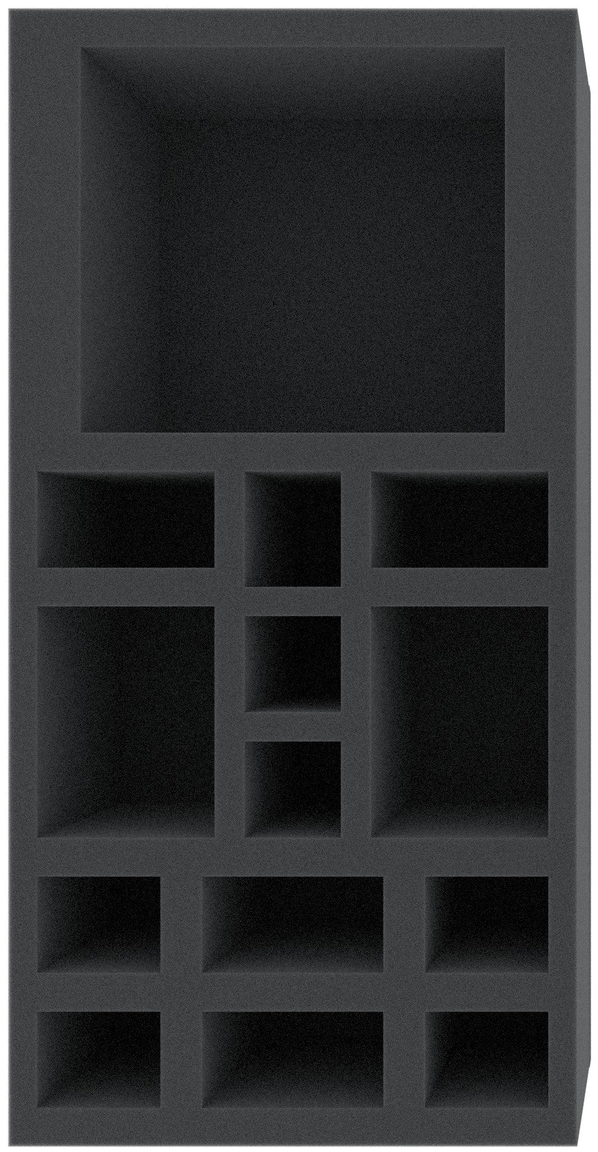 Foam tray especially for Zombicide Abominarat. The 14 different sized compartments are perfect for a huge monster like a Abominarat and 13 survivors or Zombies. The foam tray occupies half the ground space of the board game box. In addition, we recommend to AU050ZC21 and AU035ZC22.
