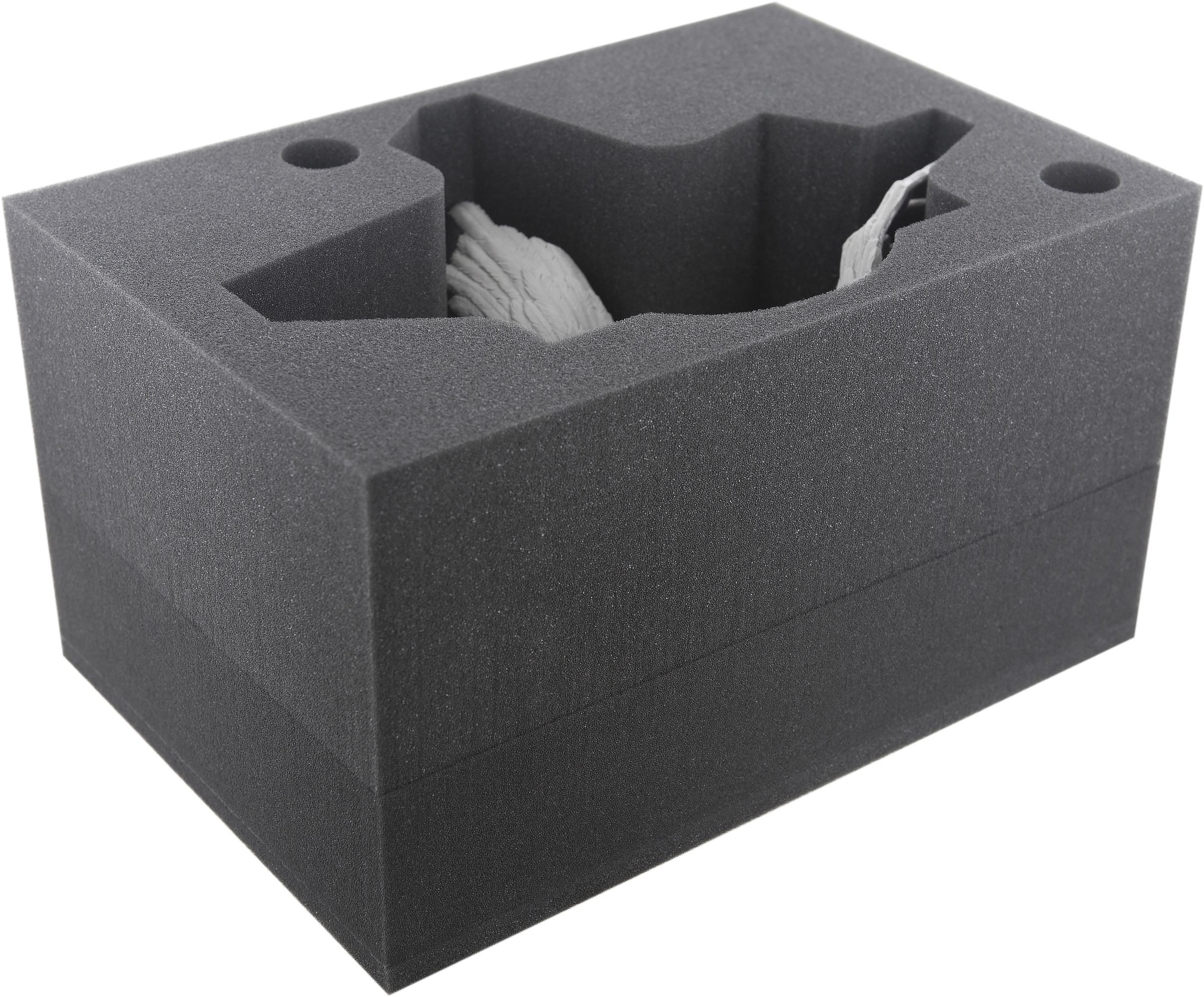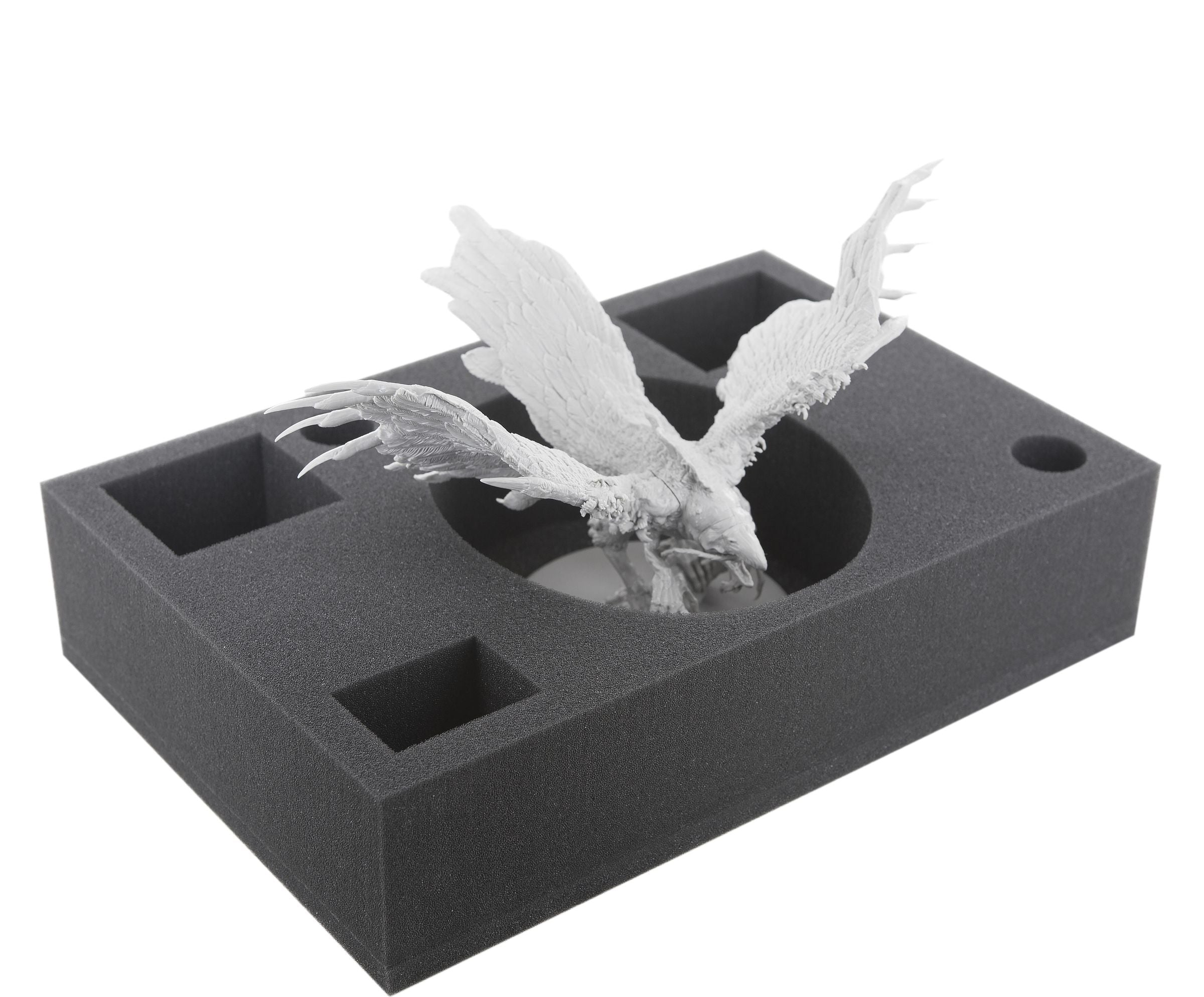 Fits the original Kingdom Death Monster 1.5 + 1.6 base box: Two-piece inlay for Phoenix. Because the Phoenix is quite large, we have made a two-part insert. Among other things, we considered that the Phoenix can be variably positioned on the base. In order to use the space in the base part reasonably, this also has additional space for some large models. The upper part of the foam insert lies on the base part and protects the Phoenix from the side and from above. The Phoenix foam insert lies on the plastic insert for the cards (far too beautiful not to use!).