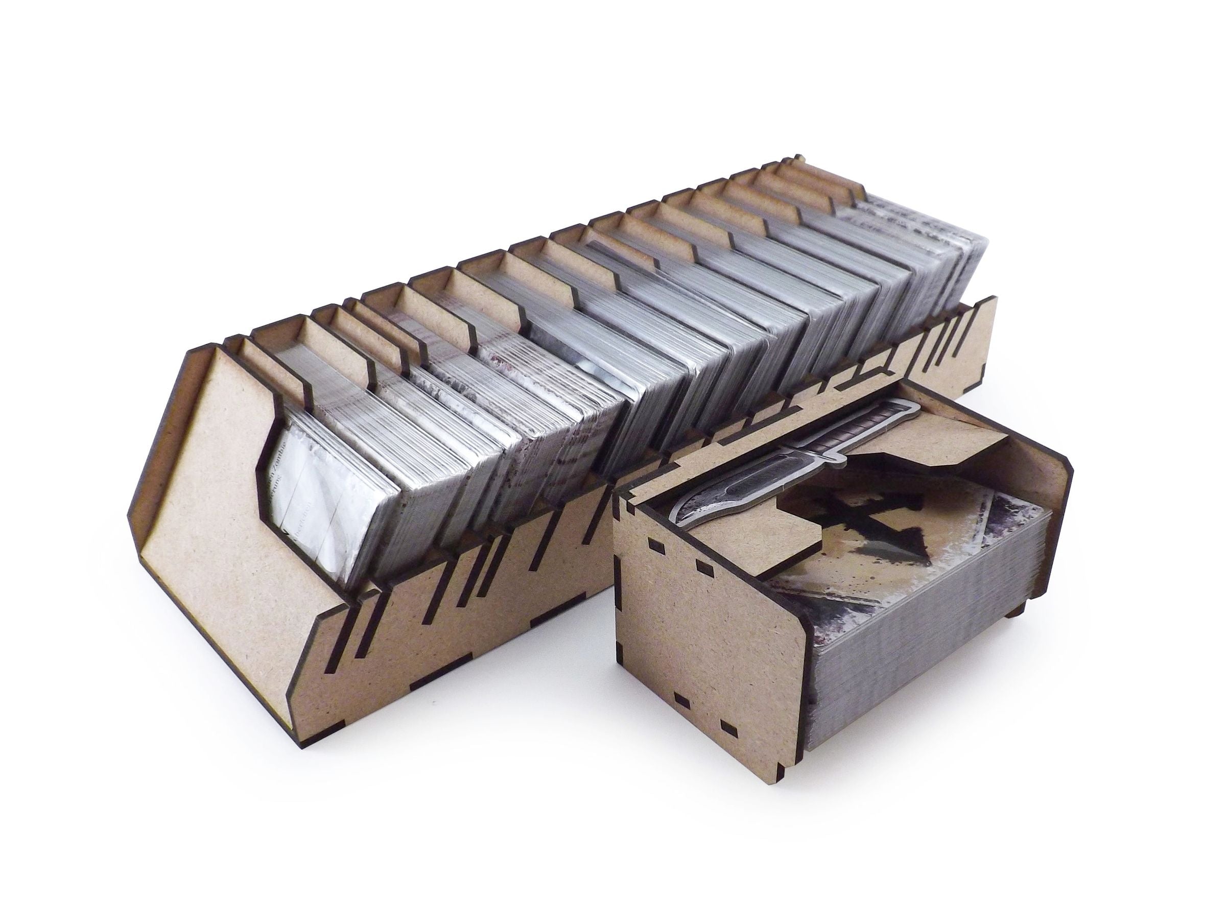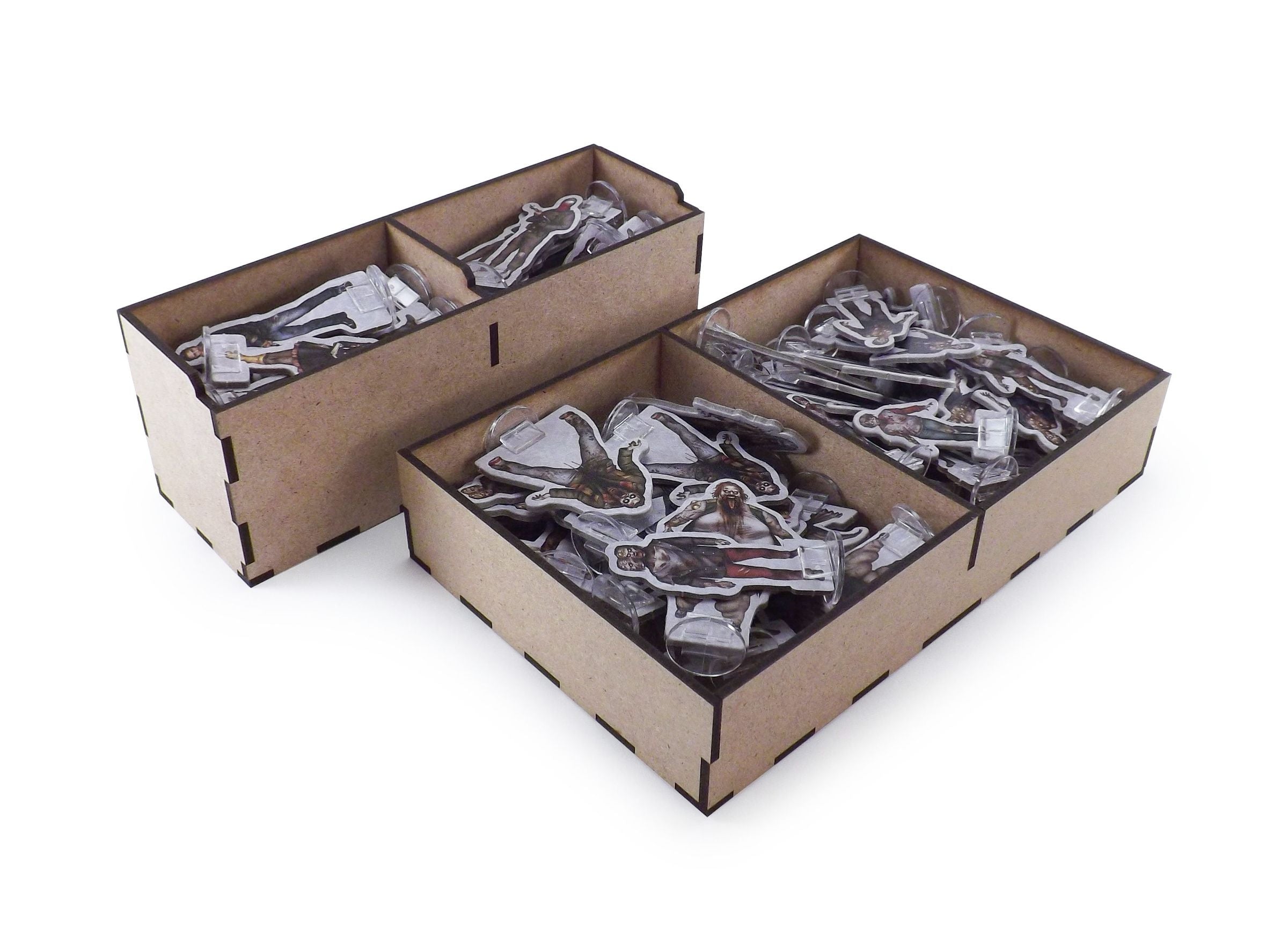 After humanity has fallen victim to zombies there are only few survivors. They must stick together and look for supplies to survive despite zombies, bandits and failed undead experiments. A wealth of cards, tokens and fugures creates this winter cold zombie world on your game table. Our insert lends a hand and finds a dedicated space for each component.