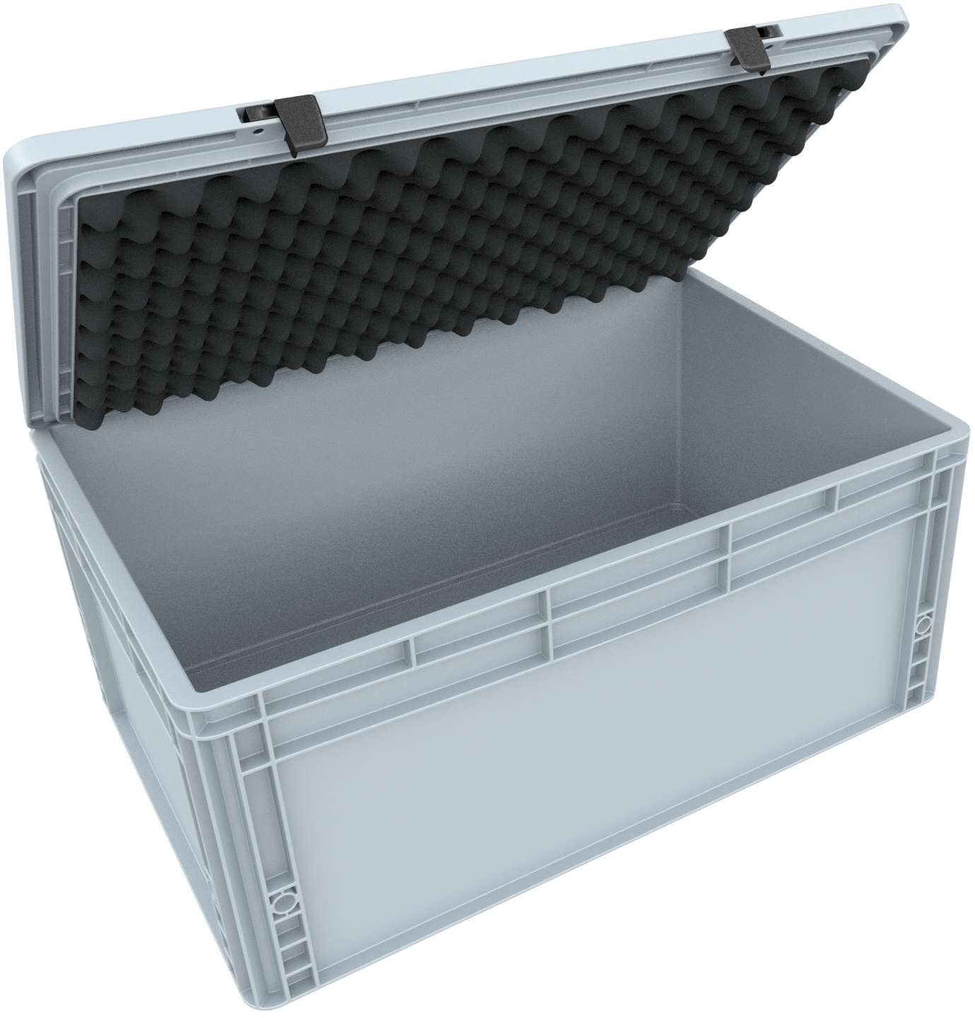 The convoluted foam CFNP020 fits optimally in the lid of the Auer Euro containers. This lid has a circumferential notch on the inside. They fit the knobbed foam exactly into the inner surface, which is limited by the notch. The foam provides the full protective effect without protruding over the notch. With no protrusion, the hinged lid closes flush. This saves space and looks good.