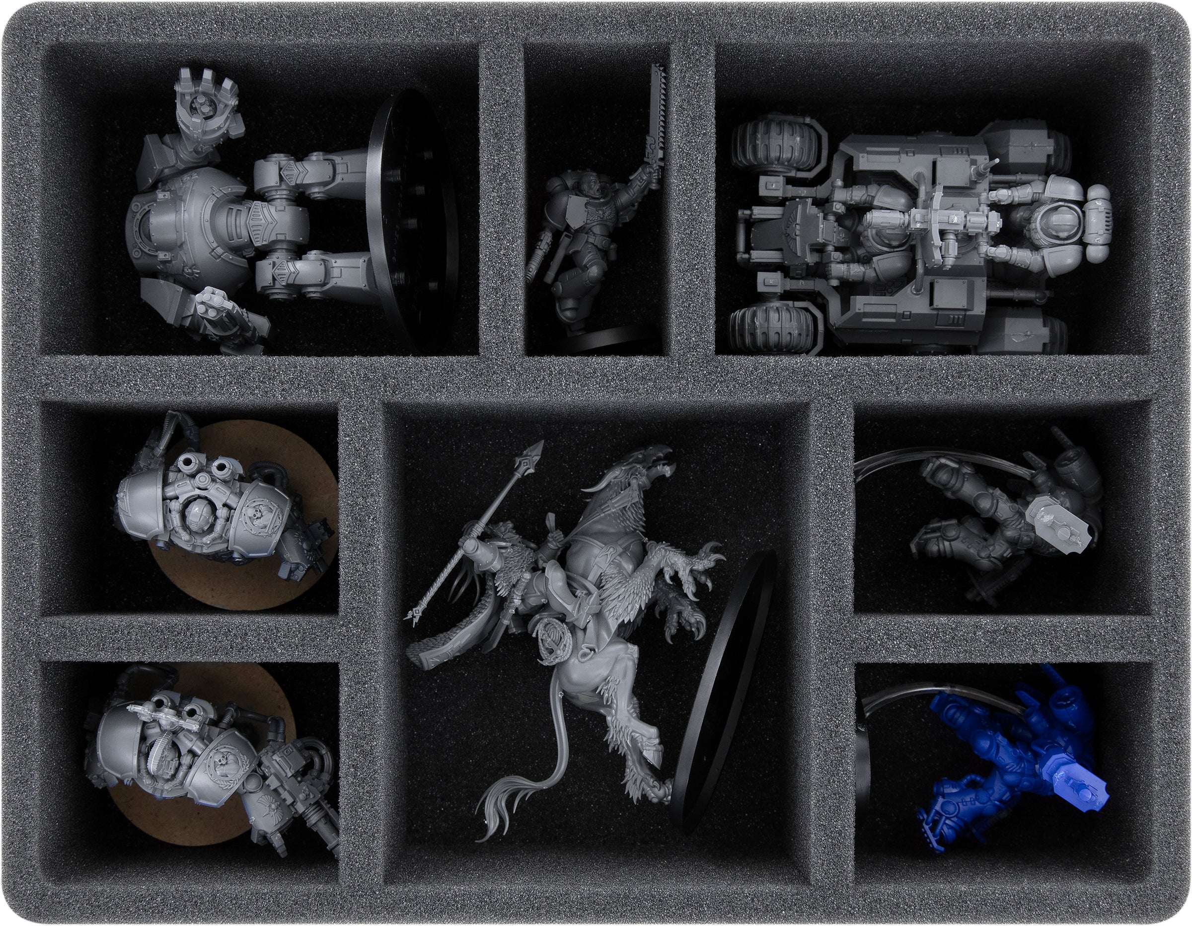 Feldherr foam trays in GWA-Size and GWB-Size are compatible with various GW transport cases with internal dimensions of 272 mm x 211 mm. These include, for example, the Citadel Crusade Figure Case, Citadel Battle Figure Case, Citadel Skirmish Case, as well as the Warhammer 40,000 Carry Case.