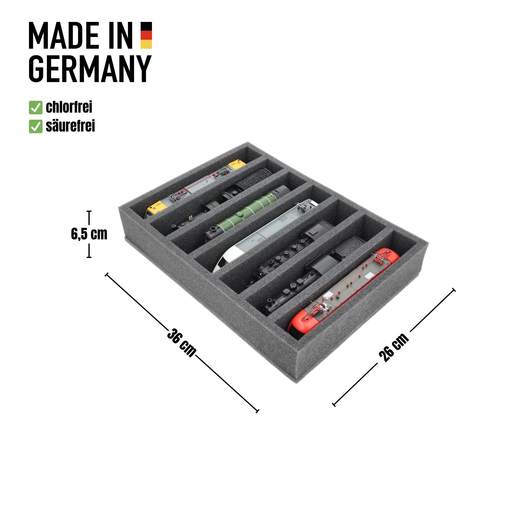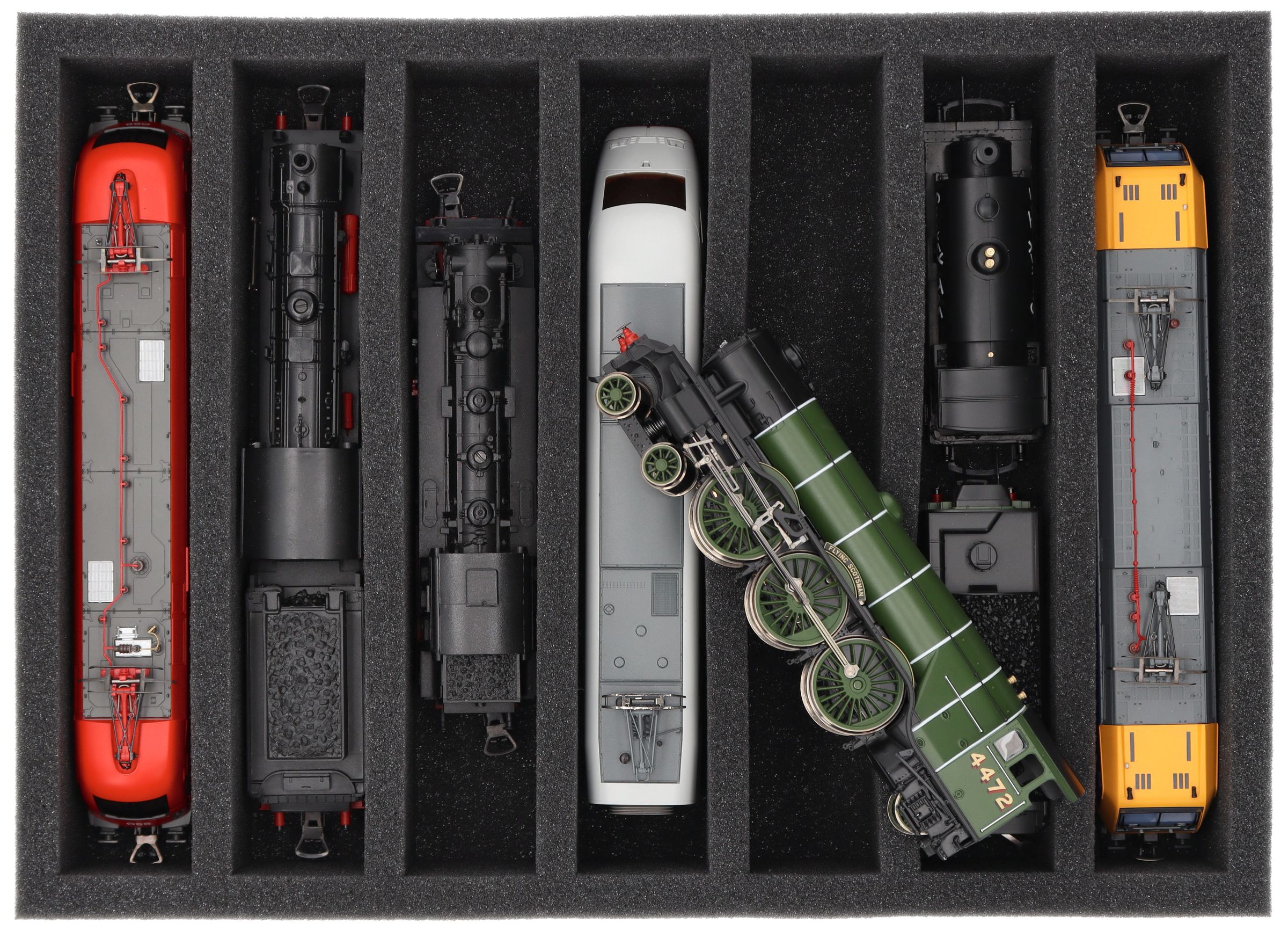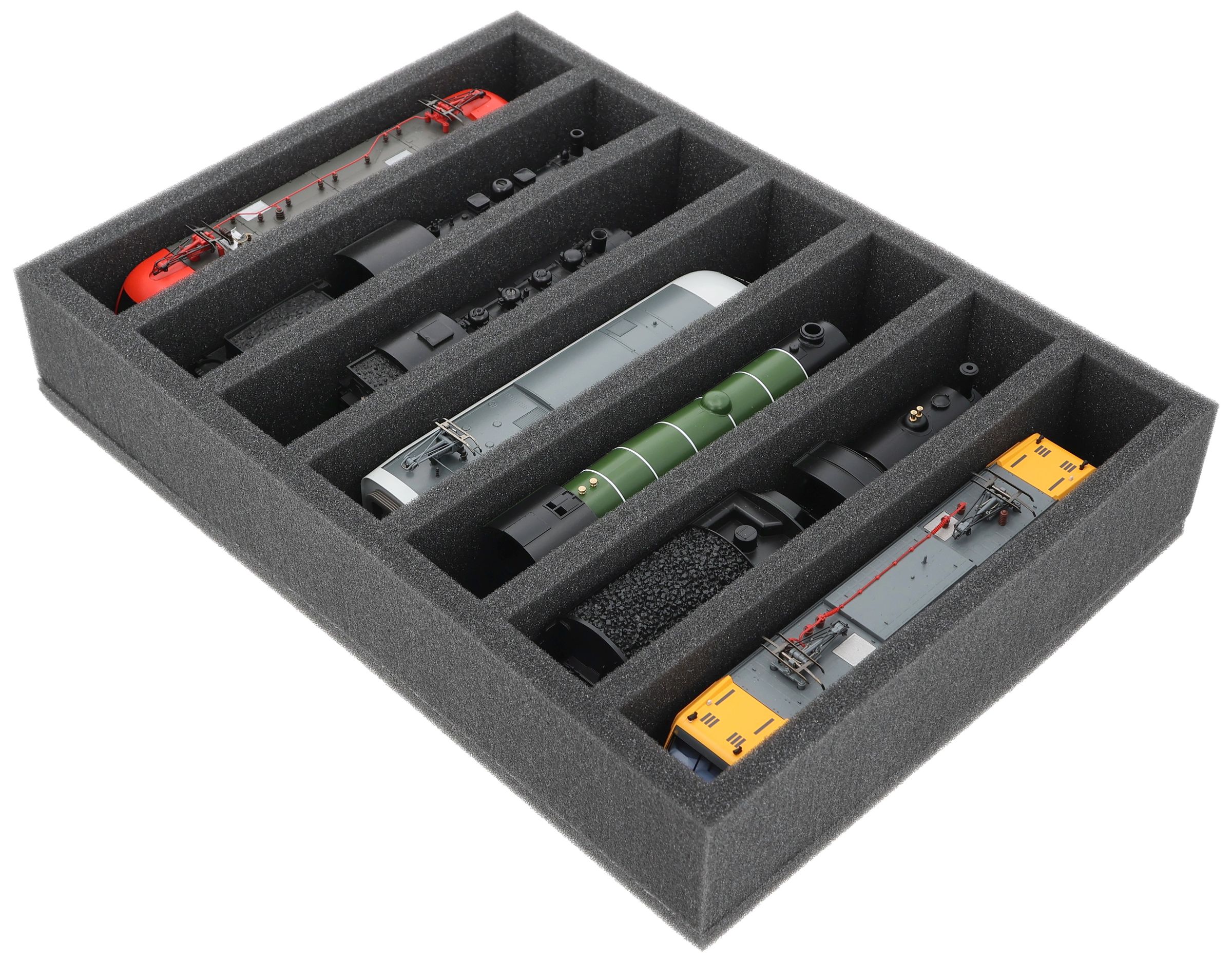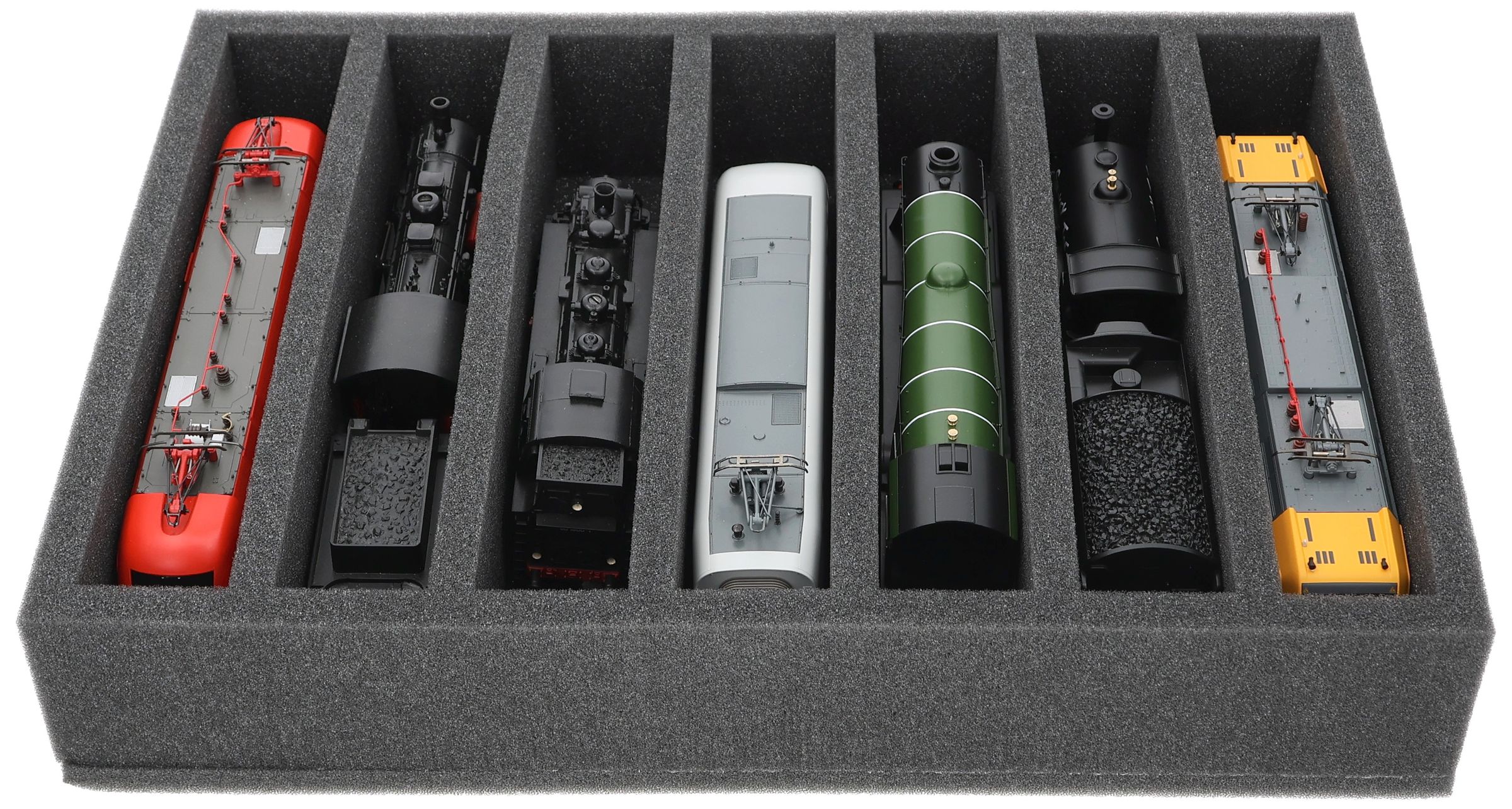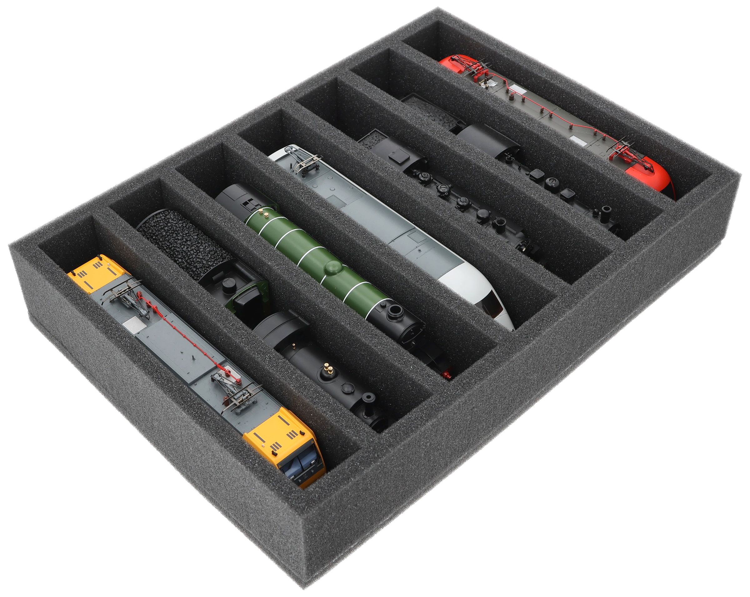 Whether for transport to exhibitions, module meetings, or safe storage on shelves at home, this insert keeps your 00 scale locomotives and cars reliably protected. The 7 compartments hold the models upright and shield them from bumps and scratches.