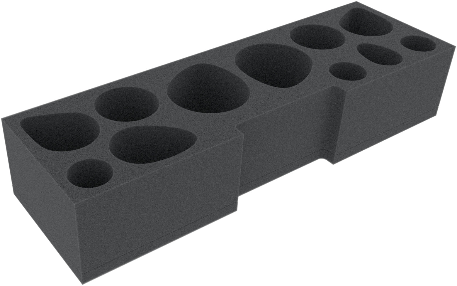 The foam tray has the dimensions: 390 mm x 120 mm x 75 mm total height (65 mm usable height + 10 mm foam base). It thus fits exactly into the long compartment of the plastic insert of the original game box.