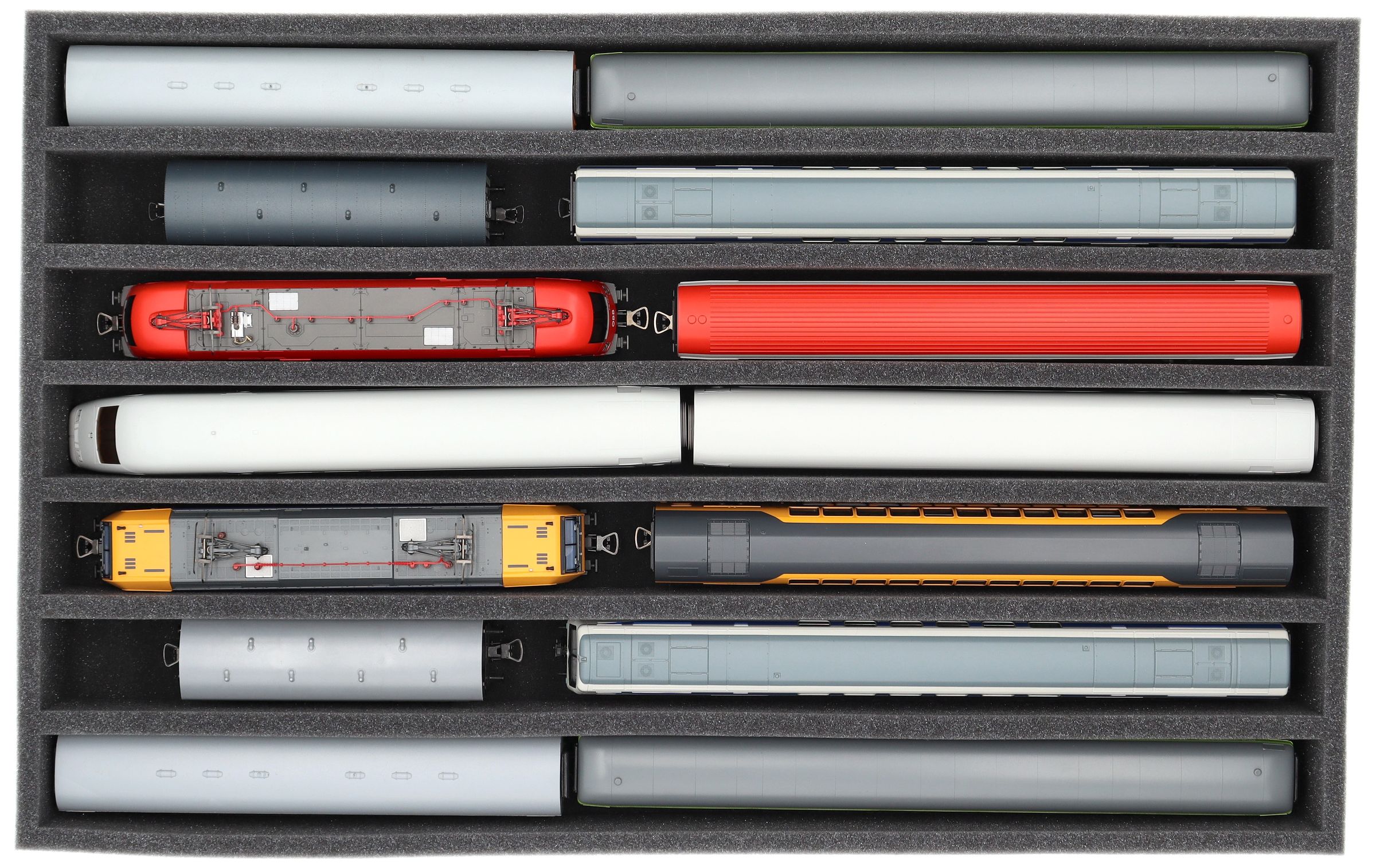 Several trains and carriages can be stored next to each other in one compartment. In order to prevent collision or unintentional coupling, we offer suitable foam spacers (HS040A002, HS020A001) to separate your model trains.