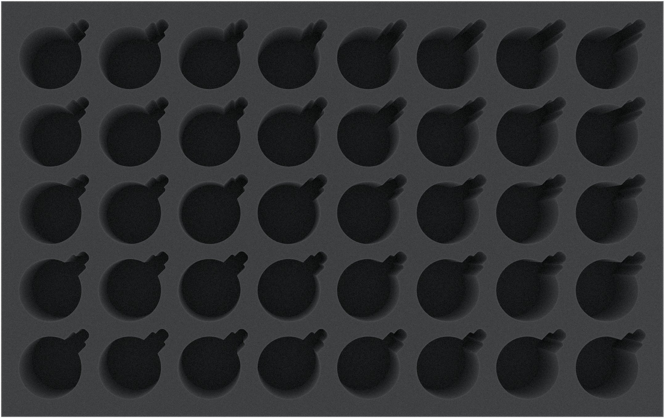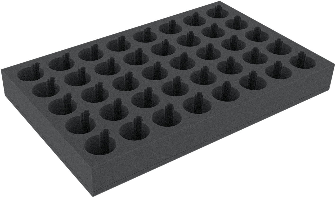 A 60 mm high foam insert with 40 circular compartments of 50 mm diameter with small bell- or lamp-shaped extension.