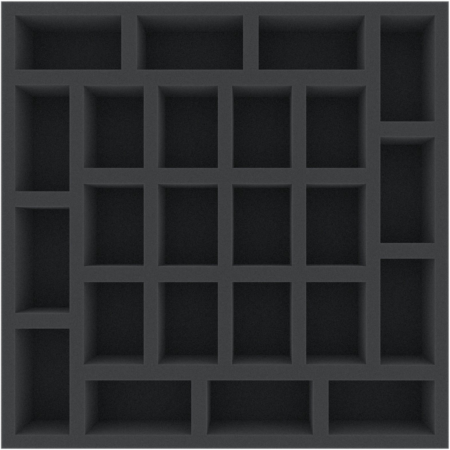 This foam tray is divided into 24 compartments of two different sizes. It is particularly suitable as an insert for the safe storage of miniatures and game material in the original board game boxes.