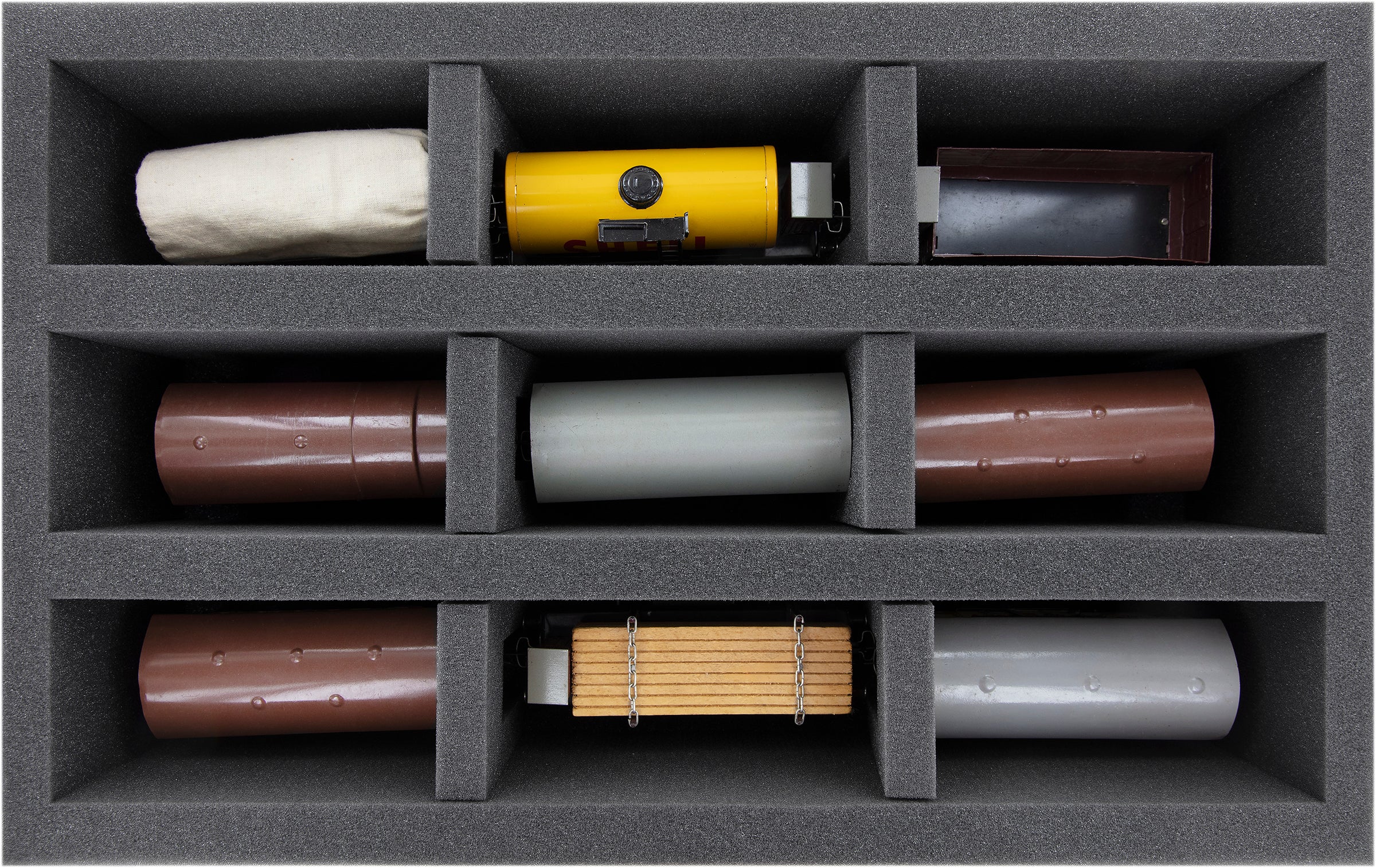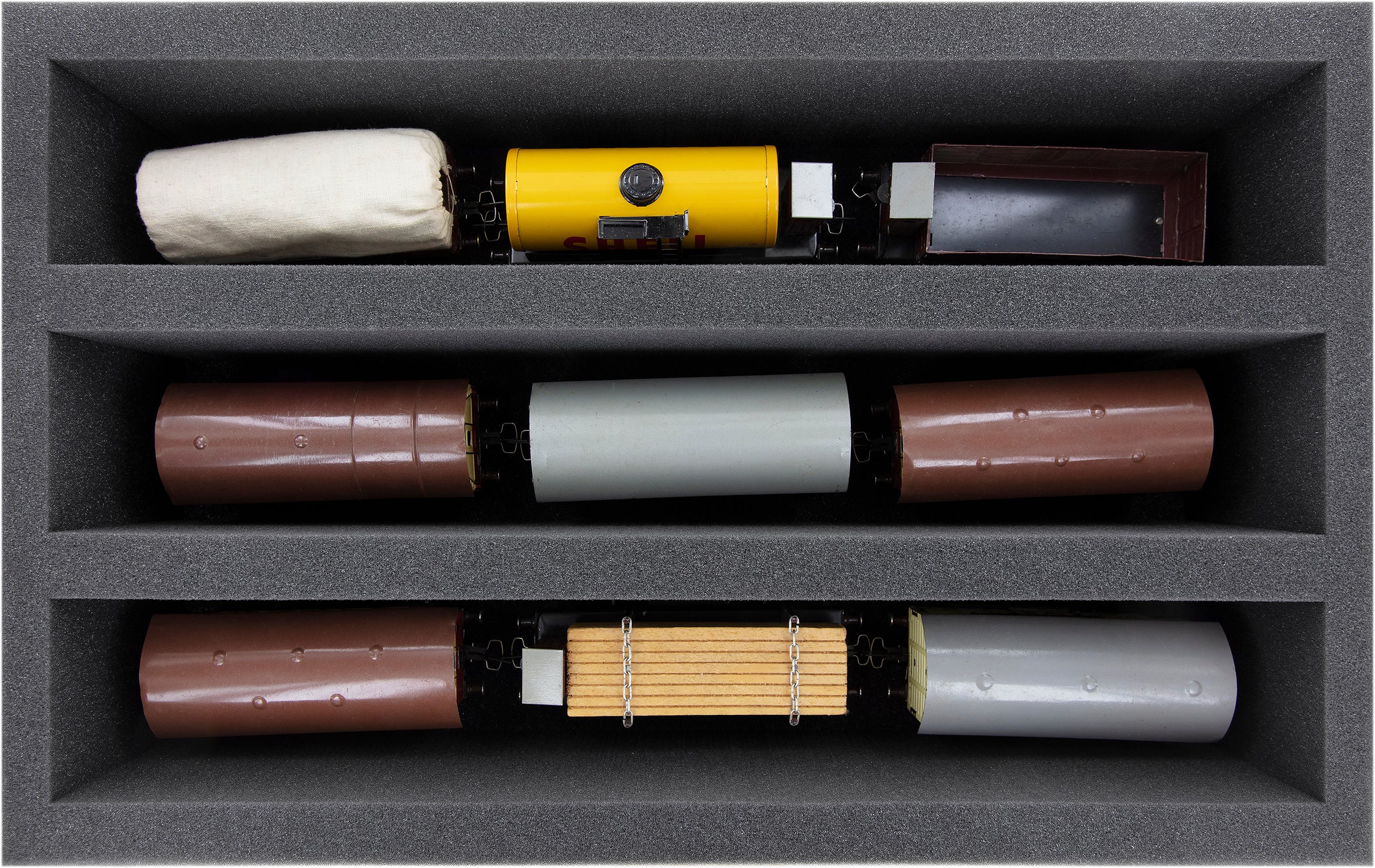 - 1 Double-Size foam insert with 3 slots for models in 0 Gauge, in standing position (DS115A001)