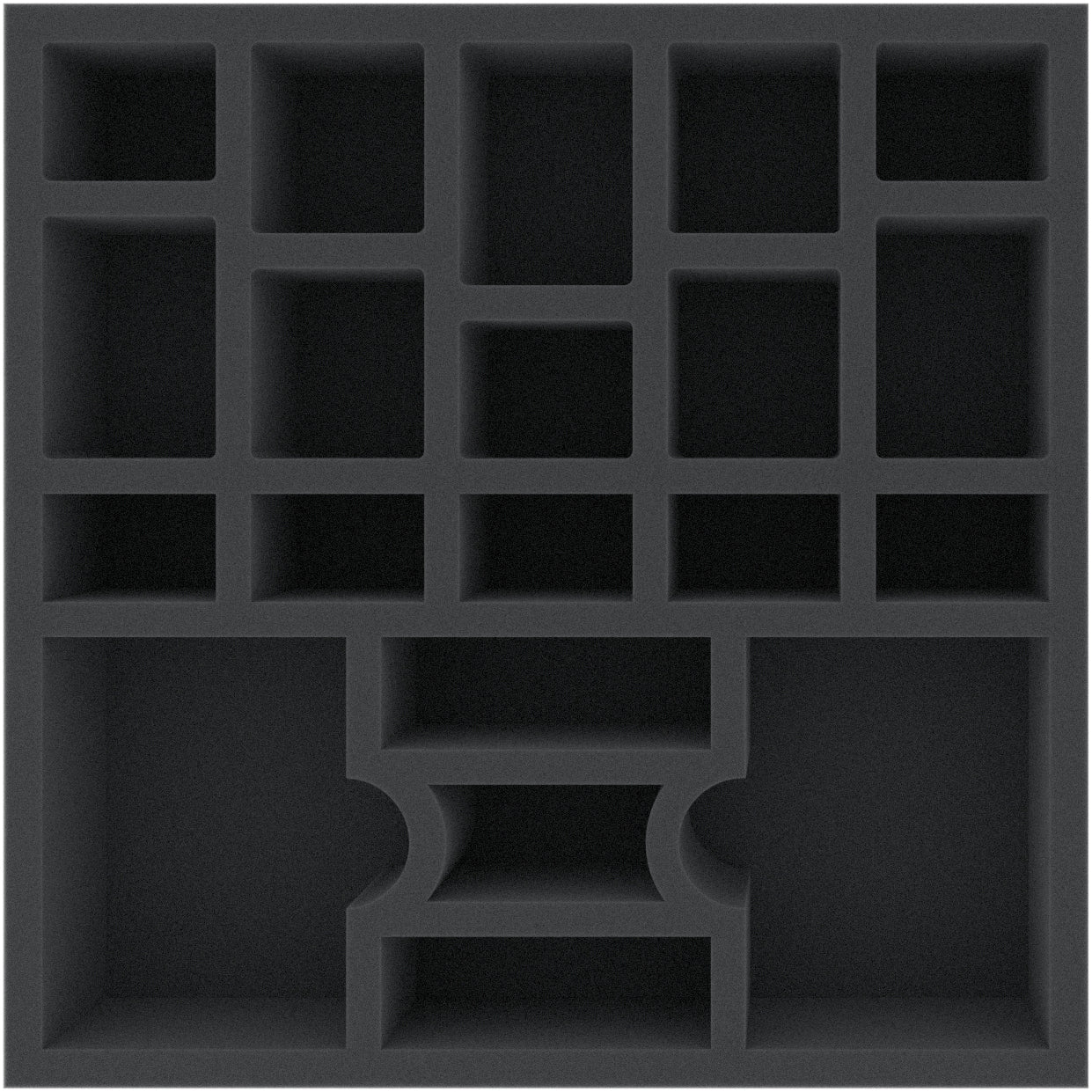 This 60 mm mm high foam tray is divided into 20 compartments. It is particularly suitable for the safe storage of tabletop and board game miniatures, as well as other fragile models and small parts.