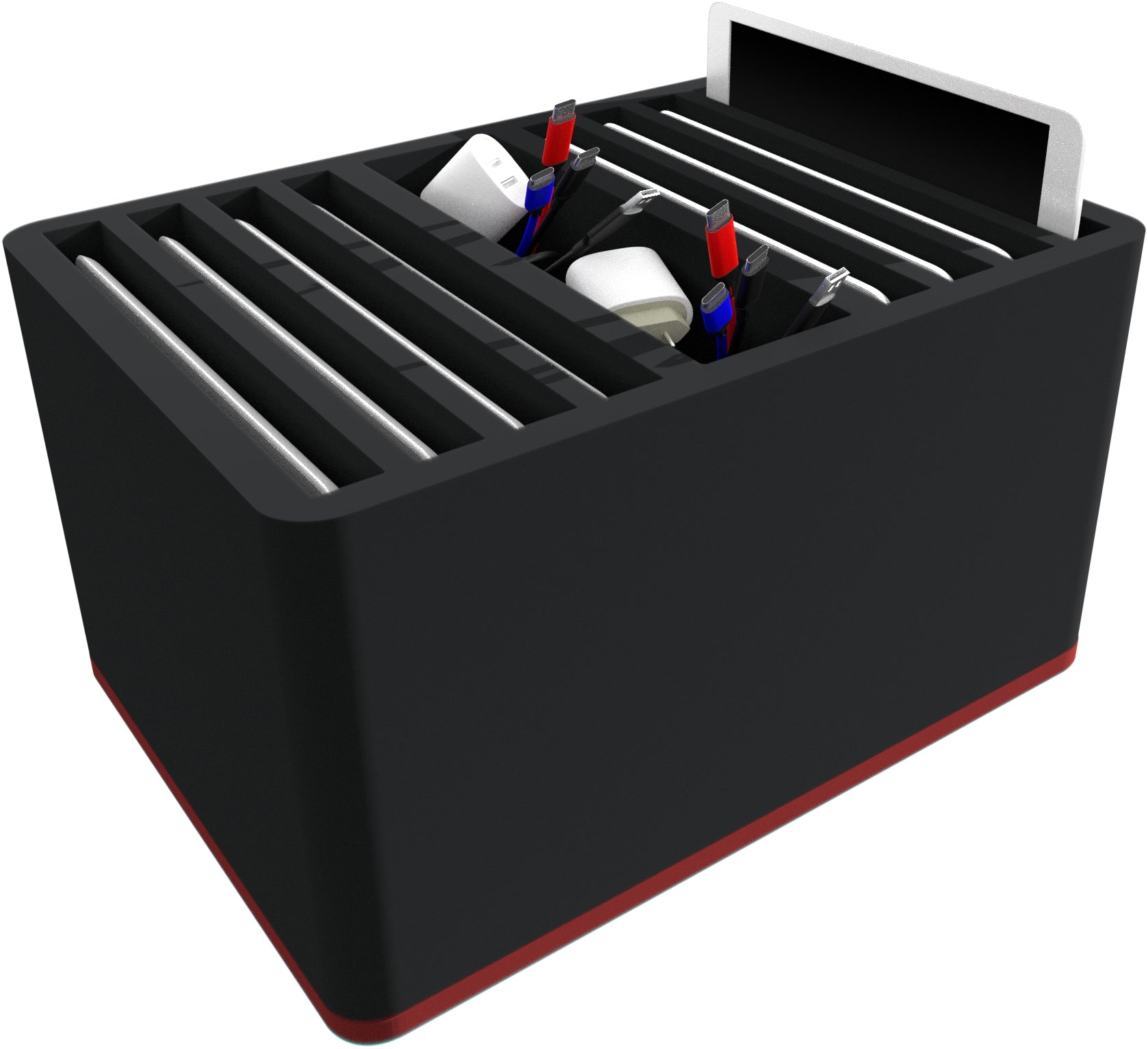 The robust foam insert has 8 slots for tablets with or without protective covers. One additional compartment offers space for cables, power supplies and accessories.