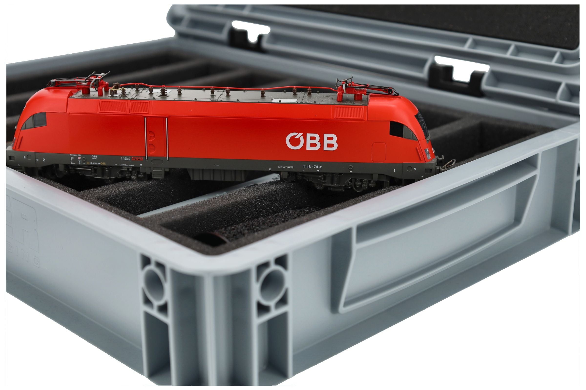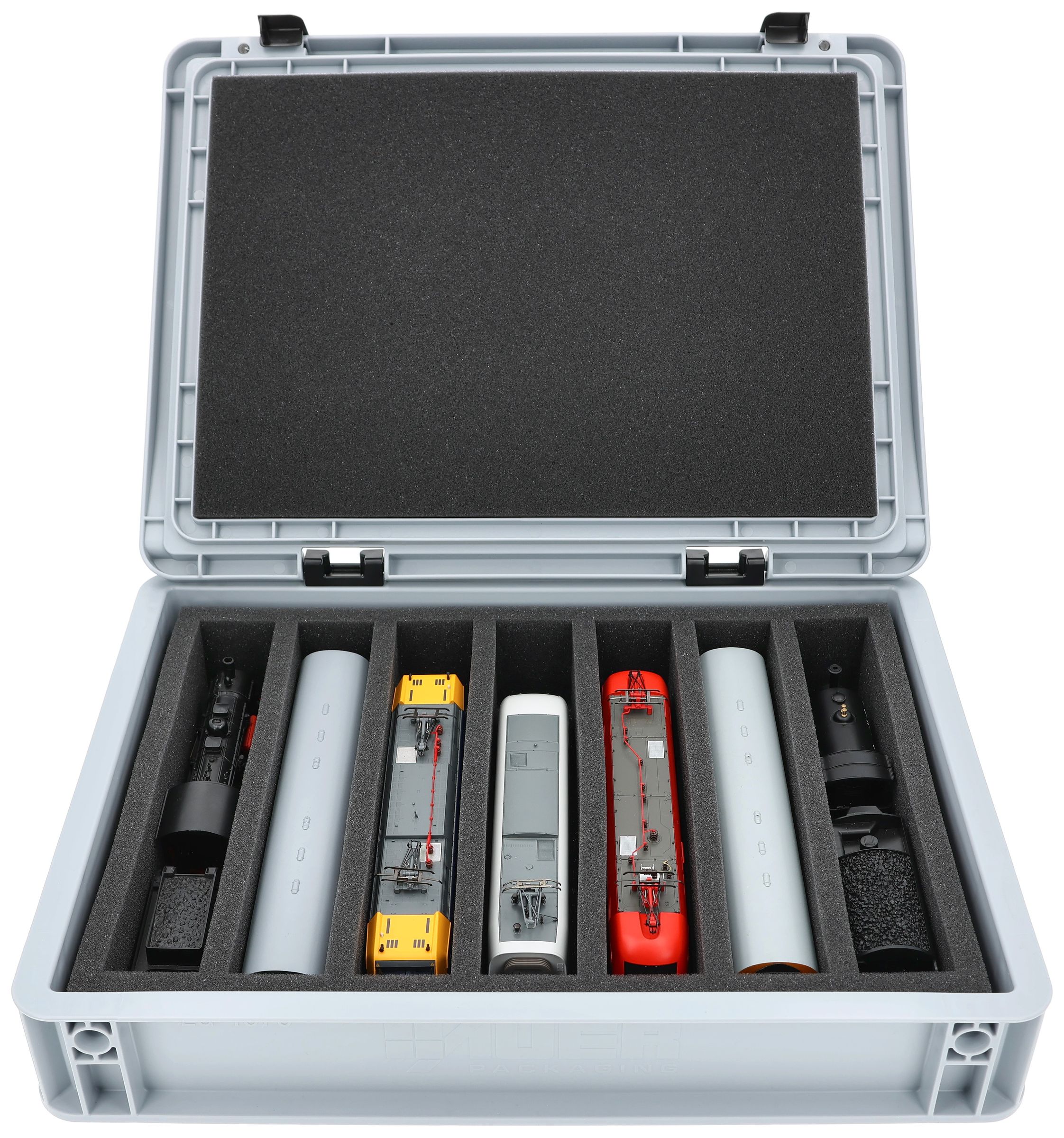 The fine-pored foam reliably protects sensitive details, paintwork, and attachments on your models from scratches and damage. The sturdy Eurobox made of shock-resistant plastic provides additional protection from external influences. A simple hinge system with two locks keeps the box securely closed and protects the contents from dust and dirt.