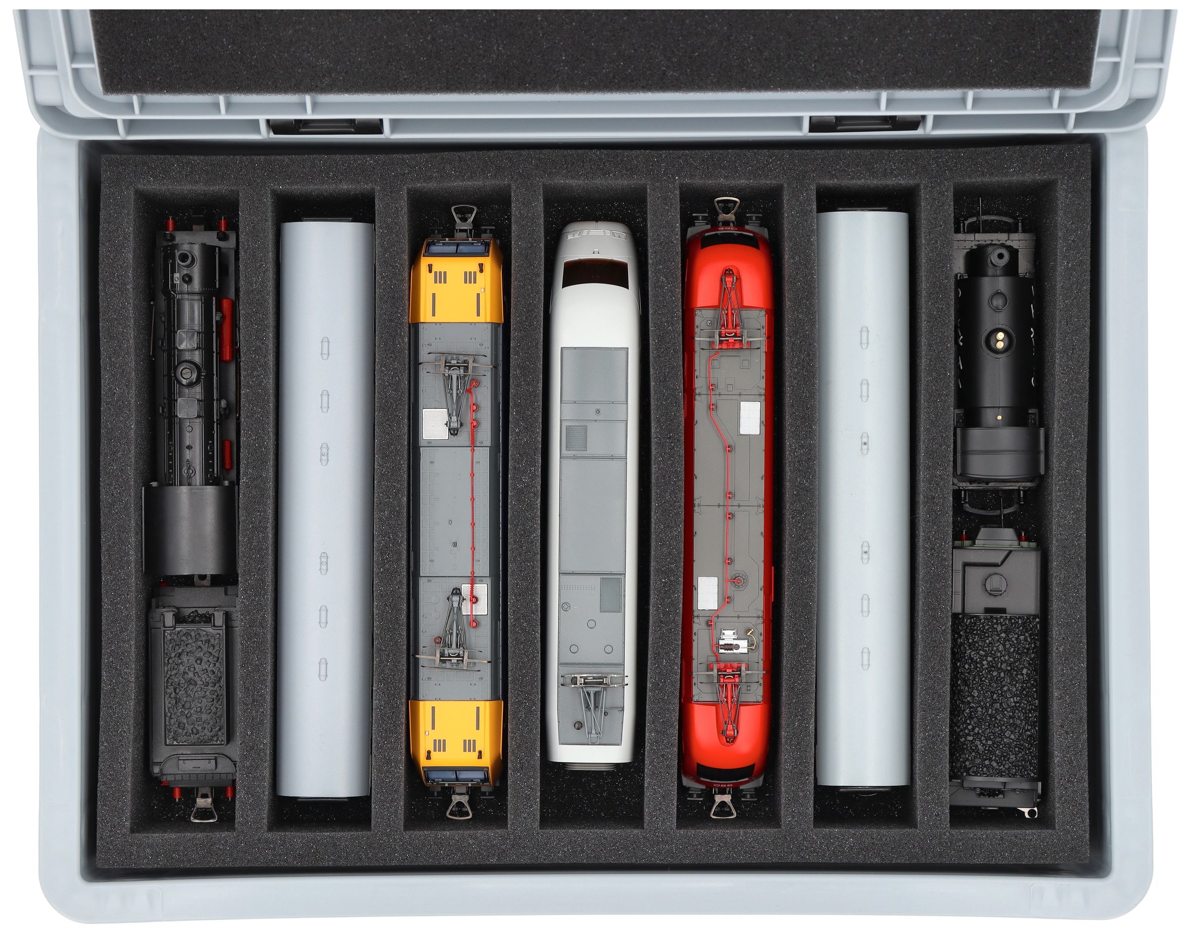 - 7 compartments - foam insert for upright storage of locomotives, wagons and vehicles